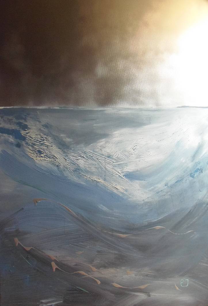 Obraz minimalistyczny, abstrakcyjny, przedstawiający wodę, morze. Spokojne barwy łączą się ze srebrnym rozjaśniającym kolorem. Obraz z cyklu"Bezkres", polecany do salonu, gabinetu, holu.
