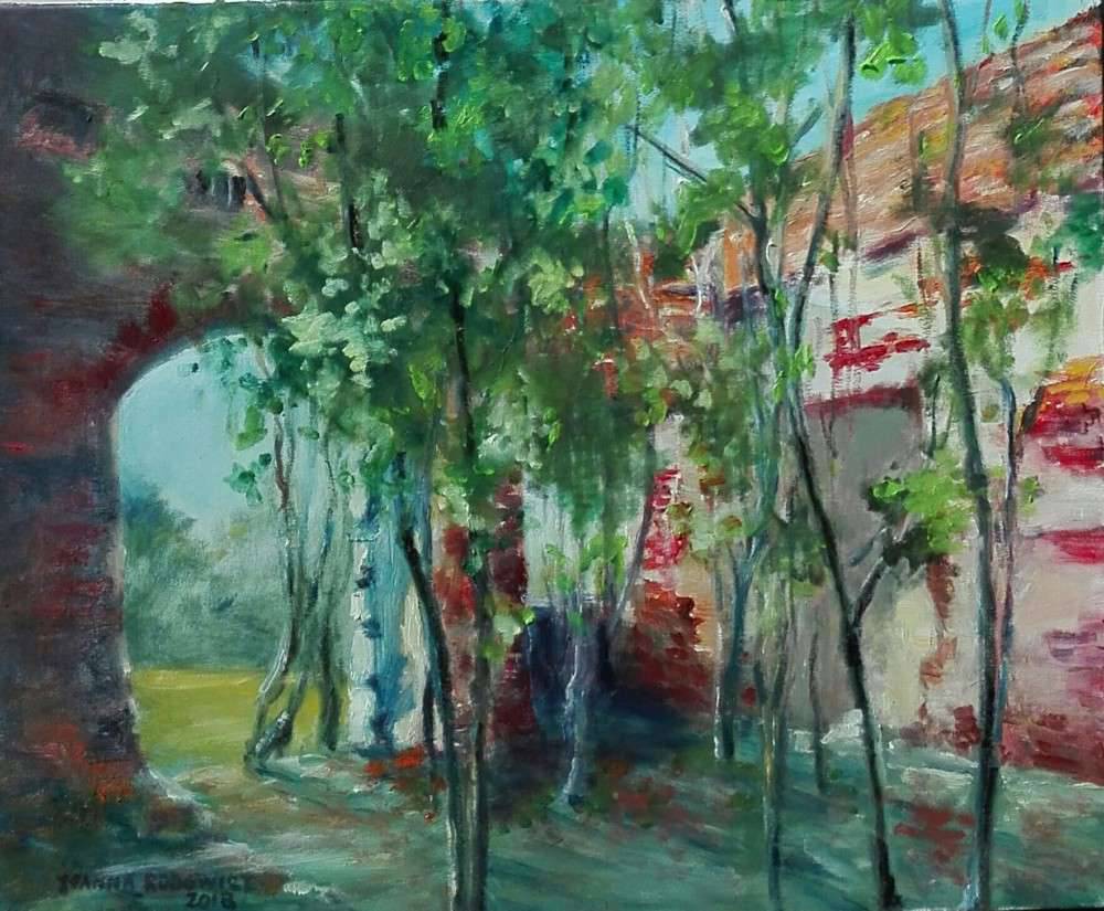 Obraz oprawiony w prostą, 4- centymetrową, srebrzystą ramę, którą można zdjąć. Malowany w Bieżuniu w ruinach pałacu Krasińskich. 2018 r