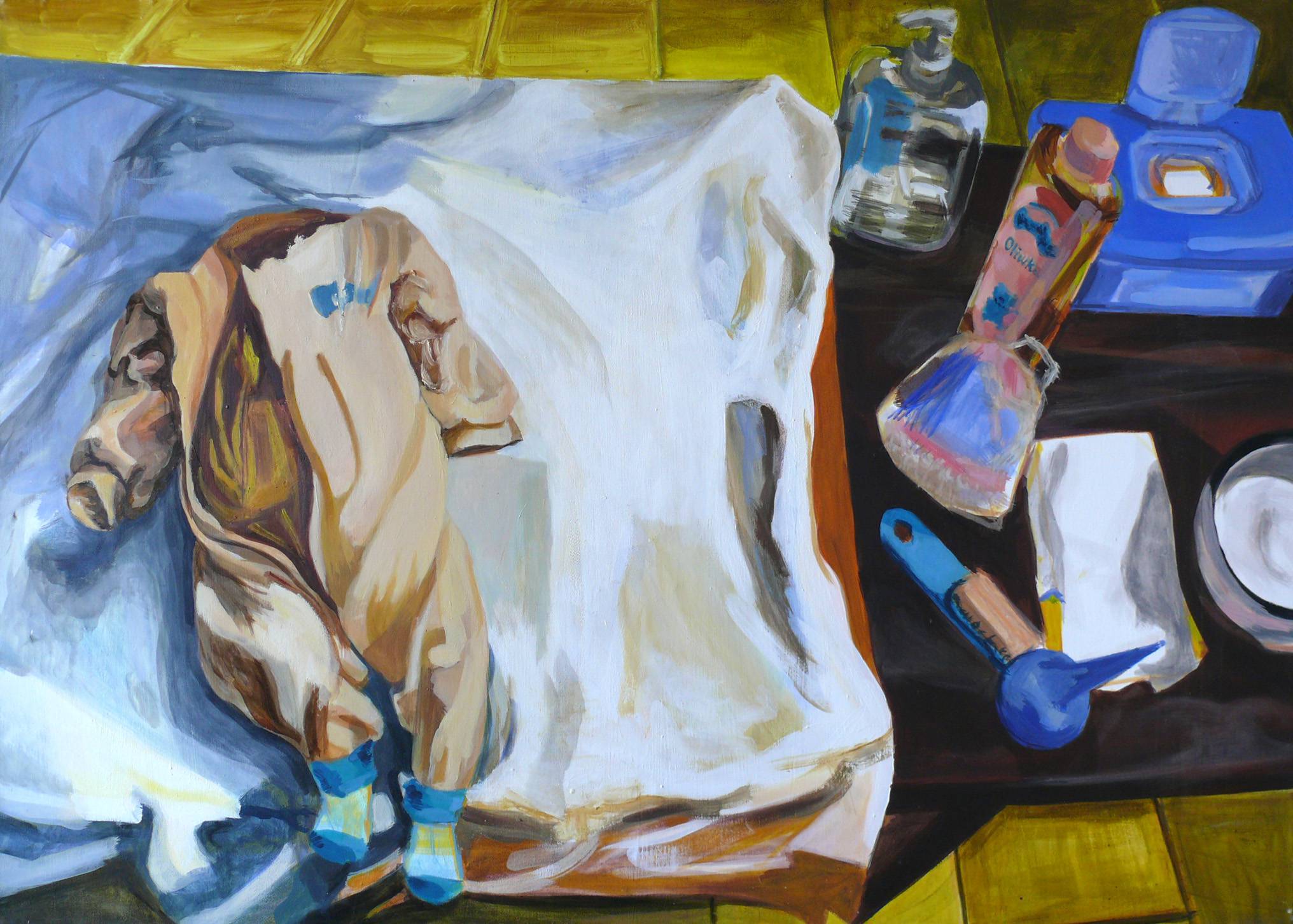 Na obrazie widać rozkoszne, małe ubranko dziecięce, leżące na dużym, białym tle, które zdaje się być miękkim ręcznikiem. Obok znajdują się elementy, które na pierwszy rzut oka sugerują codzienną rutynę pielęgnacyjną niemowlaka. Mamy tu buteleczkę z napisem "Oil", kolorowe chusteczki i niebieską gruszkę do czyszczenia noska. Kolory obrazu są dość stonowane, dominują beże i delikatne niebieskości, które wprowadzają nastrój spokojnej codzienności. Jednocześnie, pomarańczowe akcenty w tle dodają ciepła i jakby nieco optymizmu. Kompozycja jest uporządkowana, ale ma swój artystyczny twist. Farba na płótnie jest nakładana odważnymi ruchami pędzla, co nadaje nieco surowości, ale i dynamiki. Obraz tchnie spokojem i ciepłem domowego ogniska. Patrząc na niego, można poczuć delikatność i kruchość dziecięcego świata. Stawia to człowieka w centrum nowych przeżyć, pełnych miłości. Wow, to takie cute! Dla mnie ten obraz to jak cichy hymn na cześć zwykłych chwil, które często umykają naszej uwadze, ale naprawdę są magiczne. Nie sposób przejść obok obojętnie — wciąga swoją intymnością i cicho woła o refleksję nad pięknem codzienności.