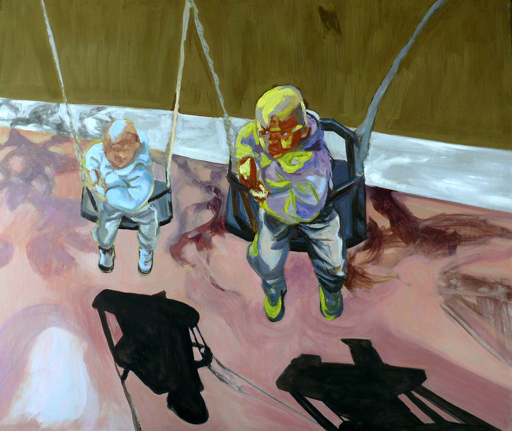 Na obrazie dominują ciepłe odcienie brązów, które tworzą tło dla dwóch dzieci siedzących na huśtawkach. Kontrastowe cienie i jasne akcenty dodają głębi i dynamiki. Kompozycja wykorzystuje perspektywę z góry, co sprawia, że postaci są jakby "zawieszone" w przestrzeni. Obraz ma w sobie coś z nostalgii, trochę smutku, mimo że dzieci na huśtawkach zwykle budzą radość. Może to przez to, że jednak brakuje im widocznej beztroski. Artystycznie rzecz biorąc, widać ślady pędzla, co sugeruje ekspresyjną technikę, taką... spontaneous! Czuję, jakby artysta chciał uchwycić chwilę, zatrzymać czas. Może sam się zastanawiał nad ulotnością dzieciństwa? Jak się na to patrzy, przypomina mi się moja pierwsza huśtawka, trochę skrzypi, ale dawała mnóstwo frajdy. Kto wie, może te dzieci myślami są już gdzieś indziej, marzą. To jedno z tych dzieł, które zmusza do refleksji, do zastanowienia się nad własnymi wspomnieniami. Każdy spojrzy i zobaczy co innego, co tak naprawdę jest w tym wyjątkowego.