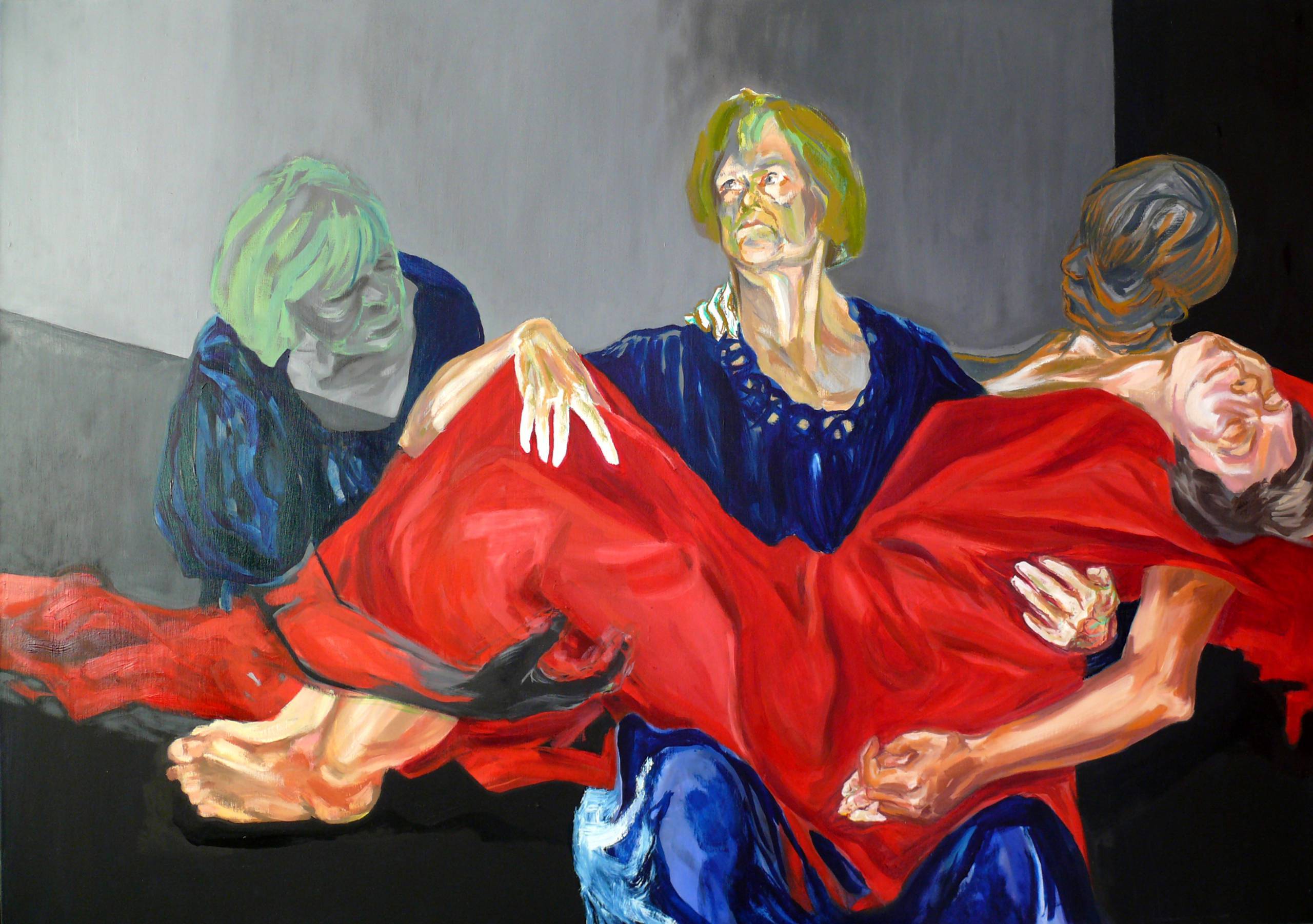 Obraz przedstawia dynamiczną scenę pełną emocji i napięcia. Dominują tu kontrastowe kolory – głęboka czerwień sukni przyciąga wzrok, otoczona stonowanymi odcieniami niebieskiego i zieleni. Postacie są złożone w subtelnej kompozycji, jakby pochłonięte chwilą ciszy po burzy emocjonalnej. Czuć atmosferę napięcia, która jednocześnie emanuje spokojem. Jest tu coś niesamowicie poruszającego, co sprawia, że obraz staje się pełen dramatyzmu. Styl artystyczny to połączenie realizmu z ekspresjonizmem – widać dbałość o detale i emocjonalne zabarwienie kompozycji. Artysta użył grubo nakładanej farby, co daje efekt tekstury i głębokości. Technika estetyczna tworzy impresję nieuchwytnej chwili, zatrzymanej w czasie. To like magiczne zamrożenie, które pozwala widzowi zanurzyć się w historii bez słów. Obraz wywołuje różnorodne emocje – od smutku po nadzieję. Można poczuć przytłoczenie, ale i subtelną ulgę. Może coś w rodzaju cichego porozumienia między postaciami. Pojawia się refleksja nad kruchością życia i potęgą ludzkich więzi. „Czy oni są szczęśliwi?” mogłoby zapytać dziecko, zaintrygowane wyrazem twarzy postaci. Interesująca jest również zabawa formą i kolorem, co zachęca do dłuższego zatrzymania się na tej scenie i wsłuchania w jej opowieść. Każdy szczegół zdaje się mieć swoje miejsce w tej wielowymiarowej układance.
