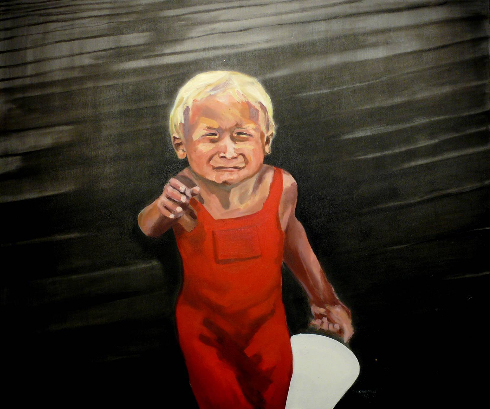 Na obrazie widzimy małe dziecko w czerwonym ubraniu stojące na tle, które przypomina wzburzoną wodę lub asfalt. Czerwień ubrania kontrastuje z ciemnym, niemal monochromatycznym tłem, co dodaje dramatyzmu i skupia uwagę na postaci. Kompozycja jest prosta, ale niezwykle wymowna. Dziecko ma blond włosy i wyraz twarzy sugerujący nieco ambiwalentne emocje, być może zmieszanie lub zaciekawienie. Atmosfera obrazu jest nietypowa - z jednej strony lekko niepokojąca, a z drugiej tchnie dziecięcą spontanicznością i beztroską. Styl artysty można określić jako realistyczny z nutą ekspresji, zwłaszcza w sposobie malowania tła. Technika wydaje się płynna, z wyraźnymi, lecz jednocześnie miękkimi pociągnięciami pędzla. Ten obraz może skłonić widza do refleksji nad naturą dzieciństwa. Czy to nostalgia, czy moment zamyślenia? Każdy odkrywa coś innego. "Look at me!" - zdaje się wołać maluch, przyciągając naszą uwagę. To cudowne, jak sztuka potrafi wciągnąć nas w wir emocji. Patrząc na dziecko, przypominam sobie własne dziecięce chwile - te radosne i te bardziej poważne, choć wtedy wszystko zdawało się takie proste. "Chcę się tam bawić!" powiedziałoby pewnie każde dziecko, patrząc na ten obraz. Ogólnie rzecz biorąc, ten obraz jest jak małe life's puzzle - składa się z ludzkich emocji, barw i kształtów, które budzą różne interpretacje w zależności od oglądającego.