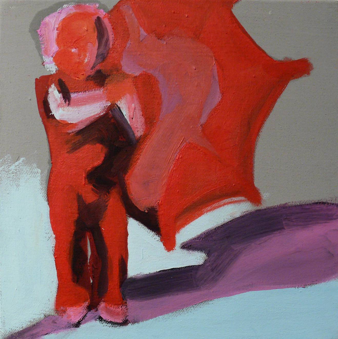 Ten obraz to istna eksplozja czerwieni połączonej z subtelnym fioletem i szarością. Główna postać, otulona intensywną czerwienią, niemal zlewa się z tłem, tworząc iluzję ruchu i dynamiki. Przez prostotę kształtów od razu przykuwa wzrok: mocne pociągnięcia pędzla nadają dziełu abstrakcyjności i surowości. Tło jest stonowane, w odcieniach szarości, co podkreśla centralną część obrazu. Na pozór chaotyczne pociągnięcia wywołują emocje, które można interpretować na wiele sposobów. Atmosfera obrazu jest nieco tajemnicza, jakby opowiadał historię ukrytą za warstwą farby. Styl artystyczny, wydaje się być zainspirowany ekspresjonizmem: dynamicznie, spontanicznie, niemal "in your face". Dzieło emanuje pewnym napięciem, ale też odrobiną nostalgii. Można pomyśleć, że ta postać próbuje się ochronić, być może przed czymś niewidocznym dla widza. Odbiorca może poczuć zarówno niepokój, jak i zaciekawienie. Ciekawe, jak każdy może to inaczej odczytać! Moja młodsza siostra powiedziałaby po prostu: "To ktoś z czerwonym parasolem!". I w tym tkwi piękno sztuki, nie? Jakie uczucia budzi w tobie ten obraz.