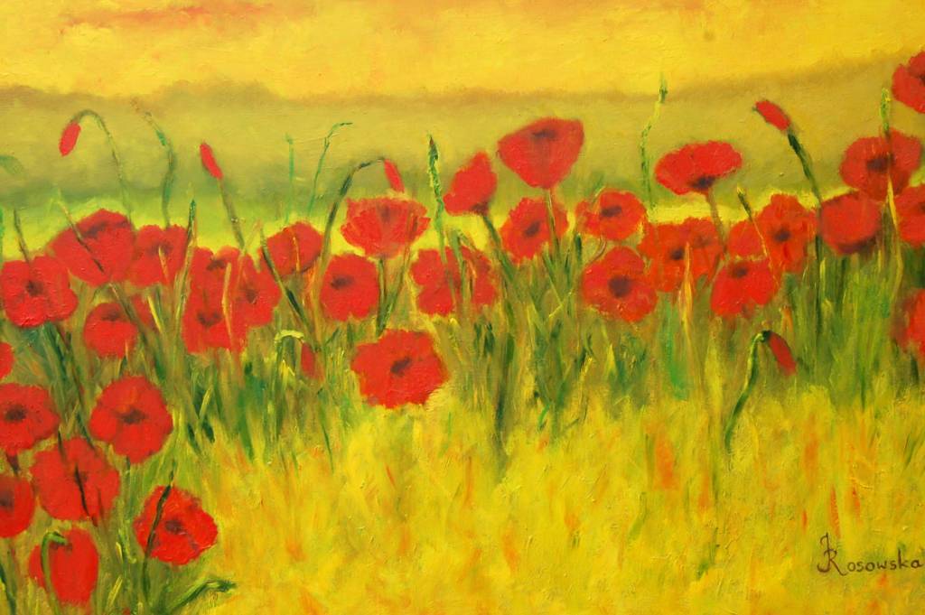 Obraz przedstawia pole pełne czerwonych maków, które rozkwitają pod delikatnym, żółtawym niebem. Barwy są ciepłe, dominują intensywne czerwone i zielone odcienie, a całość kompozycji sprawia wrażenie ruchu. Maki niemal tańczą na wietrze, tworząc dynamiczny kontrast z miękkim, rozmytym tłem. Artysta posługuje się techniką impresjonistyczną, co widać po swobodnych pociągnięciach pędzla i subtelnym mieszaniu kolorów. To trochę jak oglądanie pola o świcie. Patrząc na ten obraz, czuje się spokój i radość, jakby móc znaleźć się w samym środku tego pięknego świata. Ale wiesz co? Te maki są takie fajowe! Dzięki zastosowanej palecie, obraz oddaje ciepło letniego dnia. To prawdziwe "życie w kolorze". Można się w nim zatopić, zapomnieć o codzienności i po prostu cieszyć się chwilą. Styl malowania tchnie lekkością i wolnością. Widz może poczuć, jakby sam stał w tym polu, z twarzą zwróconą ku słońcu, chłonąc zapach kwiatów. Obraz pełen emocji, który zachęca do refleksji nad pięknem natury i ulotnością chwili.