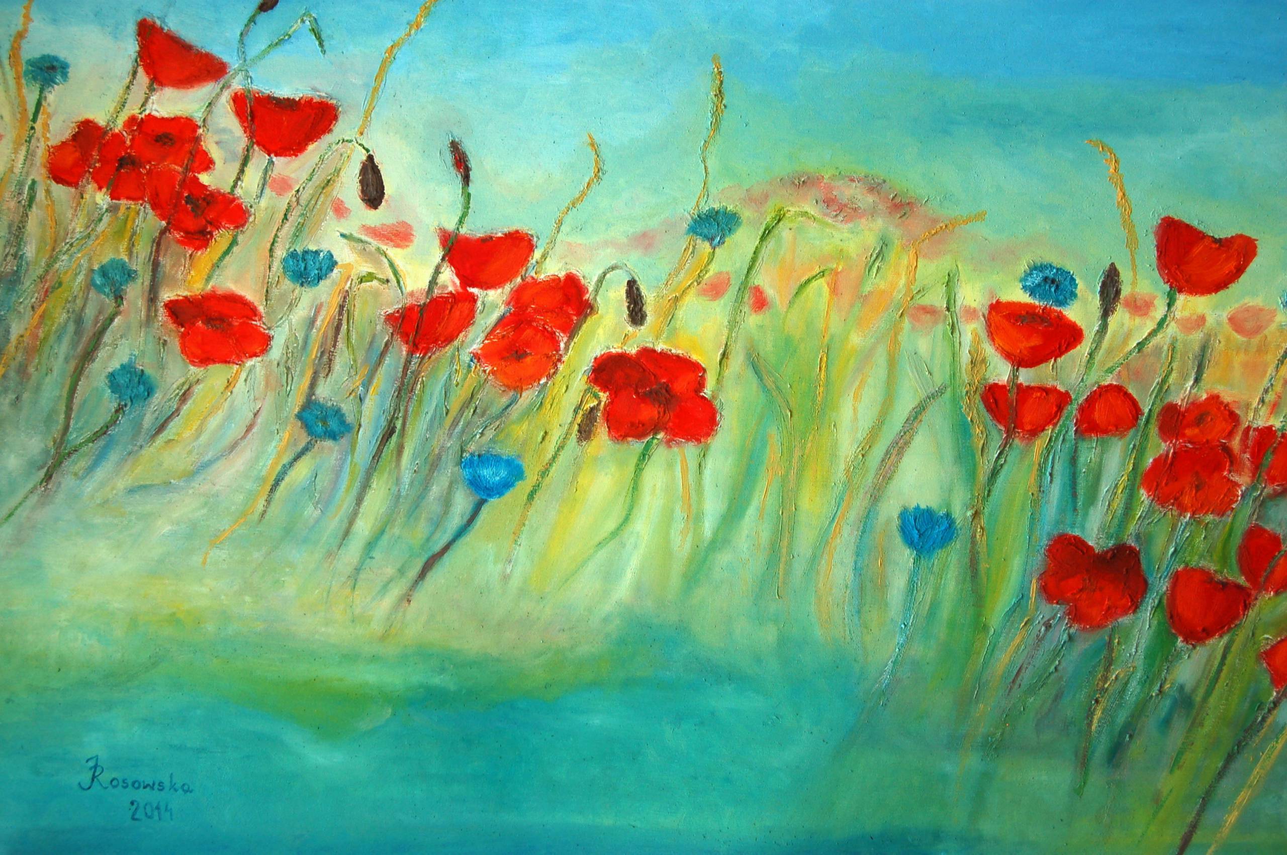 Obraz przedstawia rozległe pole maków, gdzie dominują żywe czerwienie, kontrastujące z błękitem chabrów. Tło to delikatny turkus, który wprowadza poczucie spokoju i harmonii. Artysta posłużył się techniką impasto, co sprawia, że kwiaty wydają się niemal wychodzić z płótna, zapraszając widza do ich dotknięcia. Kompozycja jest dynamiczna, z lekkim wiatrem, który zdaje się poruszać kwiatami, dodając obrazu lekkości i ulotnego piękna. Atmosfera dzieła jest pełna beztroski, jak letni dzień na wsi, kiedy wszystko wydaje się być na swoim miejscu. Obserwując ten obraz, można poczuć ciepło słońca na skórze i usłyszeć delikatny szum wiatru. Styl artystyczny jest impresjonistyczny, z naciskiem na uchwycenie chwili i emocji bardziej niż na szczegóły. Co zaś się tyczy emocji – obraz może budzić radość i nostalgię, przypominając o prostych przyjemnościach życia. Oglądając to dzieło, myślę sobie, "Wow, jakie to piękne". Niesamowite, jak artysta uchwycił ten moment. Gdy patrzę na to pole, czuję, że chcę tam pobiec, bawić się i cieszyć życiem. A w głowie mam jedno zdanie: "Te kwiatki są jak czerwone baloniki na wietrze". Ten obraz to prawdziwe spotkanie z naturą i chwilą niezapomnianego „peace”.