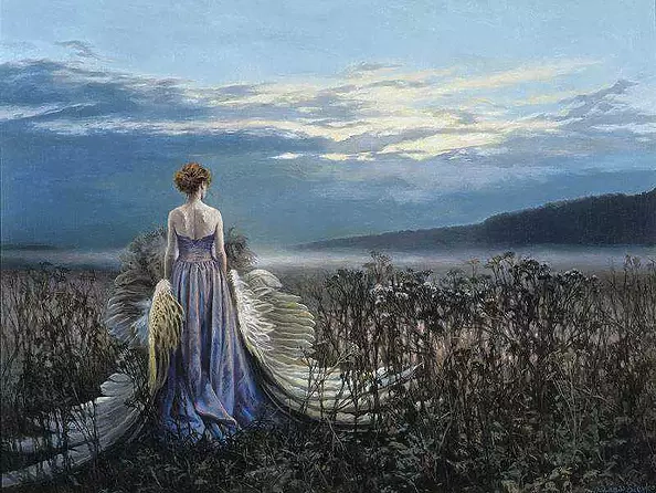 Obraz przedstawia młodą kobietę, stojącą samotnie na polu, otuloną miękkimi, majestatycznymi skrzydłami. Jej sukienka lśni subtelnym fioletem, kontrastując z delikatnymi pastelowymi barwami poranka rozciągającego się na horyzoncie. W niebie pływają chmury, które jakby tańczyły z promieniami słońca. Całość tworzy spokojną, refleksyjną atmosferę. Jest coś magicznego i nienamacalnego w tym krajobrazie, co wciąga w świat pełen marzeń i tajemnic. Klimat tej sceny jest melancholijny, a jednocześnie pełen nadziei. Artysta zastosował finezyjne pociągnięcia pędzla, które dodają obrazowi miękkości i delikatności. Kolory są stonowane, ale mają w sobie głębię, sprawiając, że każdy detal wydaje się znaczący. Widać w tym stylu pewną precyzję, a jednocześnie swobodę, która daje poczucie naturalności. Gdy patrzę na ten obraz, czuję spokój. I taką dziwną radość, jakby wszystko było możliwe. Może to efekt zastosowania techniki sfumato, która miejscami rozmywa kontury, dodając wizji marzycielskiego charakteru. Myślę, że każdy mógłby zinterpretować ten obraz inaczej. Dla mnie to opowieść o poszukiwaniu własnej drogi. Czyż nie każdy z nas czasem czuje się jak taki samotny anioł na rozdrożu? A może to tylko ja. Dziecko powiedziałoby po prostu: "O, pani aniołek!", i w sumie miałoby rację. Ta prostota i niewinność dziecięcej perspektywy przenosi mnie na chwilę w świat najczystszej iluzji. To taki magic moment. Ten obraz to okno do innego świata, pełnego ciszy i kontemplacji.