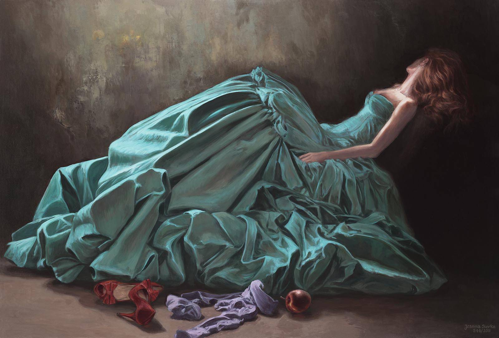 Na obrazie widzimy młodą kobietę ubraną w wytworną, turkusową suknię, która zdaje się falować niczym ocean. Kreacja kontrastuje z ciemnym, niemal surowym tłem, na którym leży postać, tworząc intrygującą grę światła i cienia. Suknia wije się jak rzeka, tworząc skomplikowane fałdy, które wciągają wzrok w niekończący się taniec tkaniny. Czuć tutaj klimat tajemnicy i niepewności, jakbyśmy wstąpili do świata dreamscape. Artystyczny styl obrazu łączy realizm z nutą surrealizmu, przypominając klasyczne obrazy wielkich mistrzów. Techniki światłocienia nadają dziełu trójwymiarowości, a gładkie pociągnięcia pędzla przydają delikatności. Obraz wywołuje emocje melancholii i zagubienia, a może nawet zadumy nad ulotnością chwili. Cóż, skojarzenia nasuwają się same i przywołują wspomnienia. Patrząc na ten obraz, czuję, jakby czas stanął w miejscu. Może to jest właśnie "serenity" w najczystszej postaci. Wyobrażam sobie, co ta kobieta mogła przeżyć, co robiła przed chwilą, a co zrobi zaraz. "Czy ona zaraz wstanie?" pomyślałby 7-latek, podziwiając tę scenę. Każdy element wydaje się współgrać, prowadząc nas ku introspekcji. Emocje są tu na wyciągnięcie ręki, niemal namacalne.