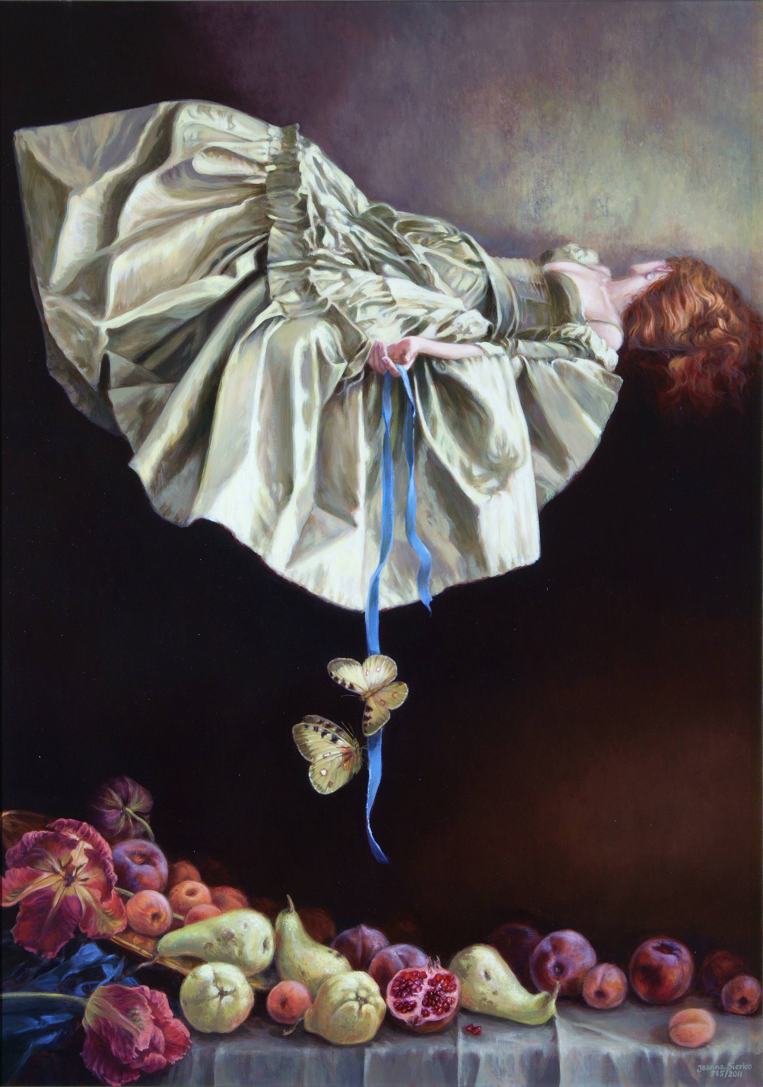 Na obrazie dominuje zaskakująca kompozycja, gdzie kobieta w eleganckiej, kremowej sukni wydaje się unosić w powietrzu. Jej rude włosy kontrastują z ciemnym tłem, tworząc dramatyczny efekt. Kolory są stonowane, a tkanina sukni gra światłem w sposób almost magical. Poniżej, na stole, rozrzucone są owoce: gruszki, granaty i brzoskwinie. Motyle skaczące w przestrzeni dodają delikatności i trochę baśniowego klimatu. Atmosfera obrazu jest tajemnicza i nieco surrealistyczna, rodzi pytanie, co tu się właściwie dzieje? Artysta zastosował realistyczną technikę malarską, ale z nutą impresjonizmu. Detale tkanin i owoców są dopracowane z precyzją, natomiast tło pozostaje mgliste, dając miejsce na interpretacje. Może to wywoływać w widzu refleksję o ulotności chwili, subtelności piękna czy wreszcie - nonsensie snu. Myśli odbiorcy mogą krążyć wokół pojęcia balance between reality and dreams. Moja osobista reakcja? To jak marzenie, które zatrzymało się na granicy jawy i śnienia. I to chyba mnie najbardziej urzeka w tym dziele. A motyl jest taki ładny! Każdy element obrazu zdaje się opowiadać kawałek niekończącej się historii.