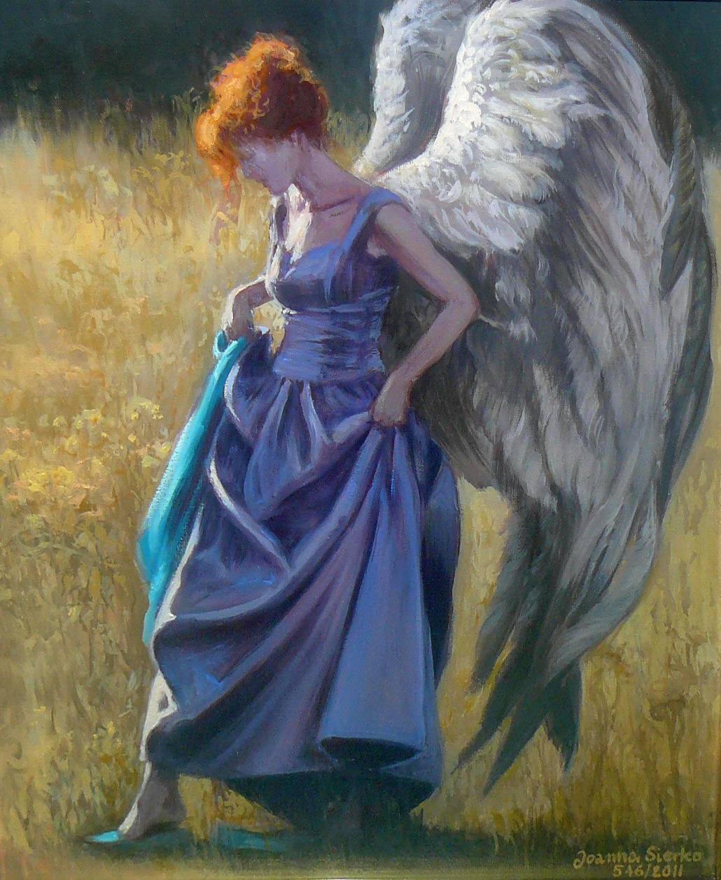 Na obrazie widzimy postać kobiety o rudych włosach, której sukienka faluje w odcieniach błękitu i fioletu. Rozłożyste skrzydła, niczym u anioła, bieleją na tle złocistych pól. Jasność otoczenia kontrastuje z cieniem, w którym znajduje się postać. Światło słoneczne subtelnie podkreśla detale materiału, tworząc wrażenie ruchu i dynamiki. Malarska technika zdaje się balansować między realizmem a impresjonizmem, zachwycając szczegółowym oddaniem faktury i miękkimi pociągnięciami pędzla. Obraz emanuje spokojem i tajemnicą. Można odczuć, jakby czas zatrzymał się w tej chwili kontemplacji. Powoduje dreamy nastrój, przywodząc na myśl sielskie dni, kiedy wszystko jest możliwe, a jednocześnie delikatne jak pajęczyna. Może ktoś tu marzy o tym, żeby latać, chociaż trochę. Ten obraz sprawia, że myślę o wolności i delikatności życia. Jakby artysta chciał powiedzieć: uważaj, świat jest magiczny. Te skrzydła, chociaż mocne i dumne, także wydają się pełne nostalgii. A może to tylko ja tak czuję, patrząc na ten kadr pełen ciepła. "Look closer", mówi wewnętrzny głos, sugerując, że jeśli przyjrzeć się dobrze, można zauważyć coś jeszcze.