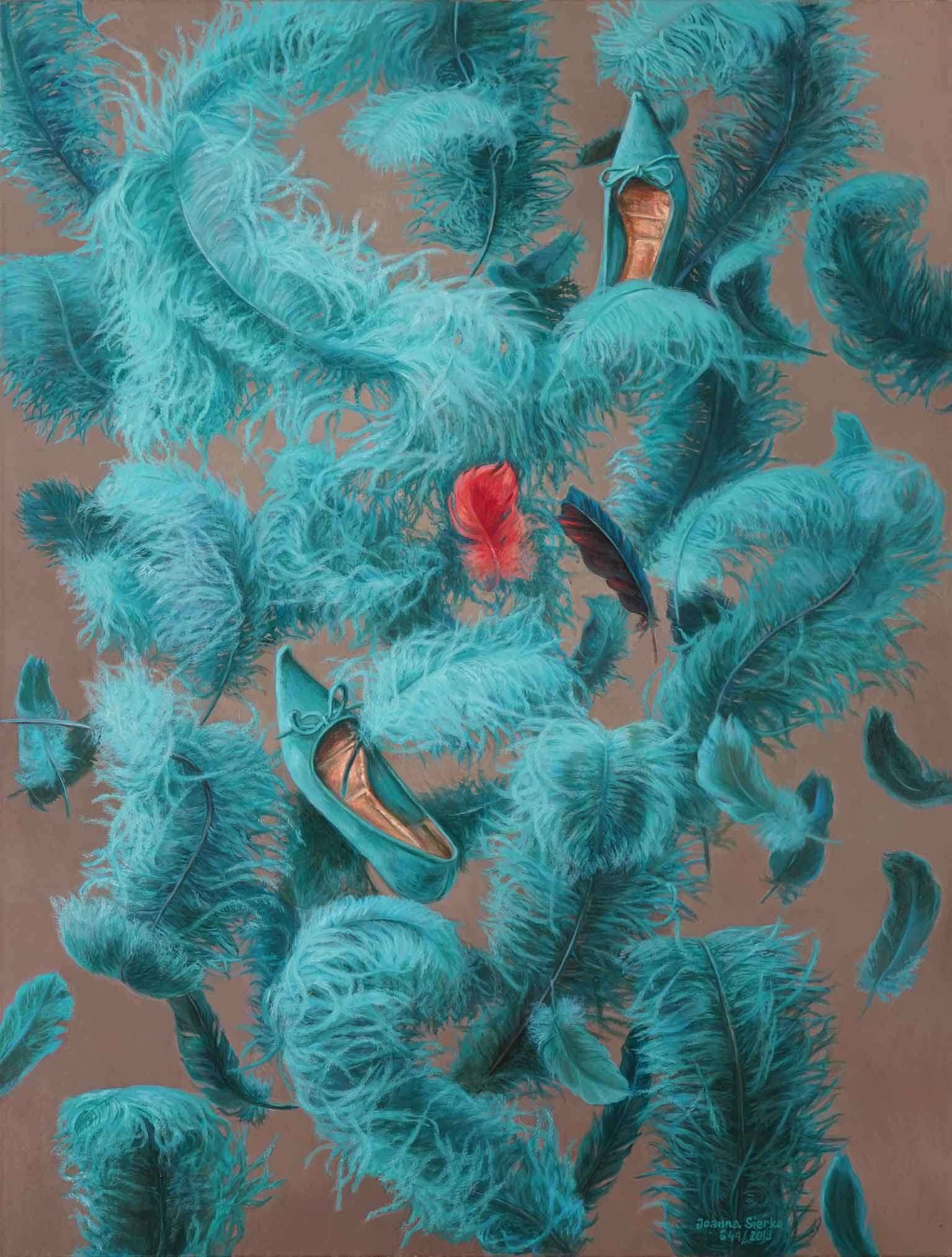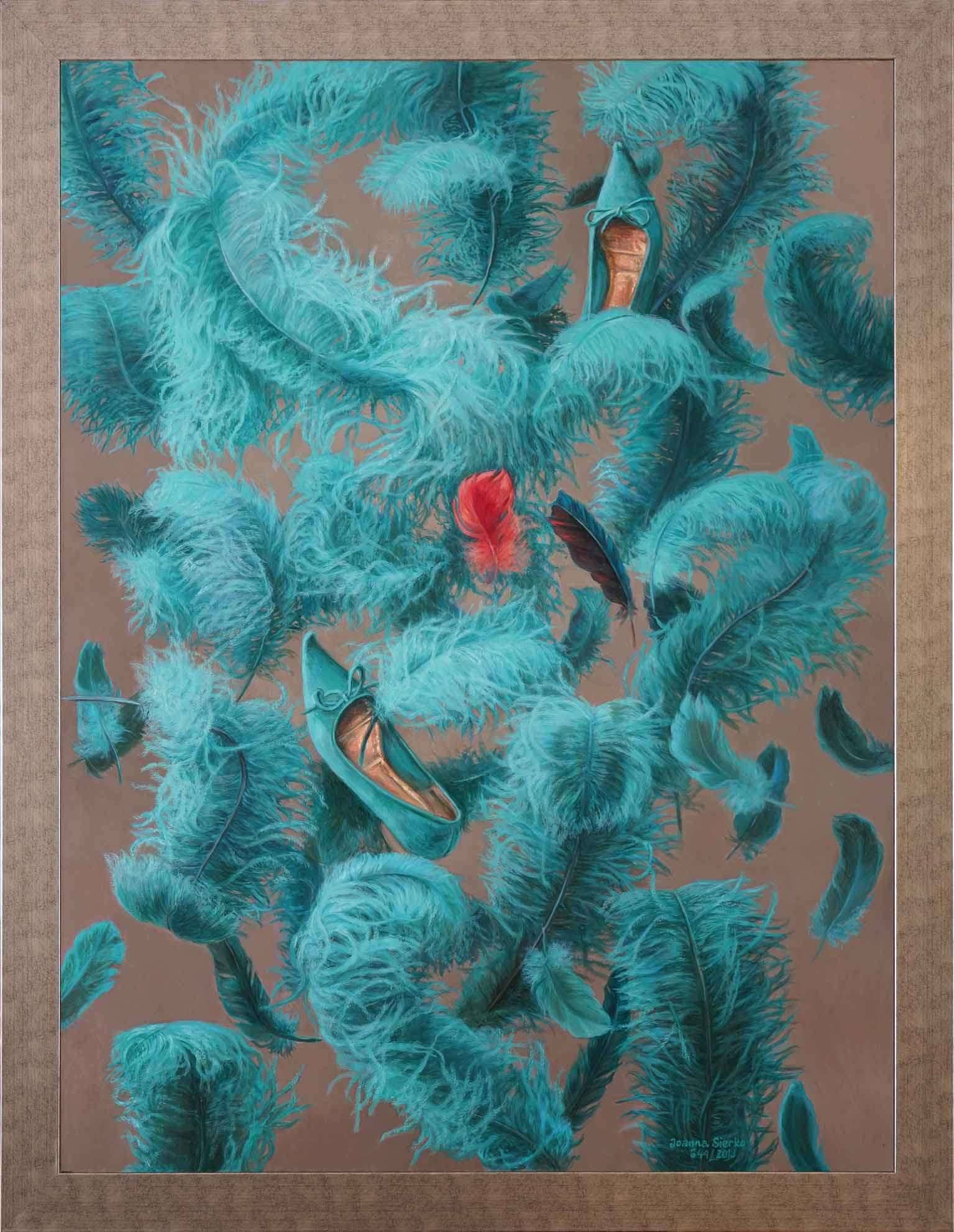 Ten obraz to istna uczta dla oczu. Dominują w nim turkusowe pióra, które tworzą wirującą kompozycję. Wygląda, jakby cały obraz tańczył na wietrze. Są one pięknie cieniowane, co nadaje im wrażenie lekkości i ruchu. Wplecione pomiędzy pióra są buty w takim samym odcieniu, które wydają się spoczywać jakby w swoistym raju dla stóp. Całość jest umieszczona na ciepłym, beżowym tle, co dodaje dziełu harmonii. Atmosfera obrazu jest niezwykle lekka, niemal marzycielska, jakby ktoś schował się w miękkiej chmurze. Artysta zastosował technikę malarską, która przywodzi na myśl delikatne pociągnięcia pędzla. Wydaje się, że obraz jest zarówno realistyczny, jak i odrobinę surrealistyczny. Patrzysz na niego, a tu czujesz jakbyś mógł dotknąć tych piór, może nawet się w nich zatopić. Ciekawe. Osoby oglądające ten obraz mogą poczuć spokój i tęsknotę za przygodą. Dla dzieci, takie obrazy są jak "pościel z chmur, na której można spać". I tutaj pojawia się moment "wow", który sprawia, że trudno oderwać wzrok. Dzieło to także może być symbolicznym przedstawieniem ulotności momentów w życiu. A może tak naprawdę, kryje się w nim coś głębszego, coś, co artyści nazywają "a touch of magic". Nie można być pewnym, ale jedno jest jasne – nie da się na to spojrzeć bez uśmiechu na twarzy. To po prostu piękne.