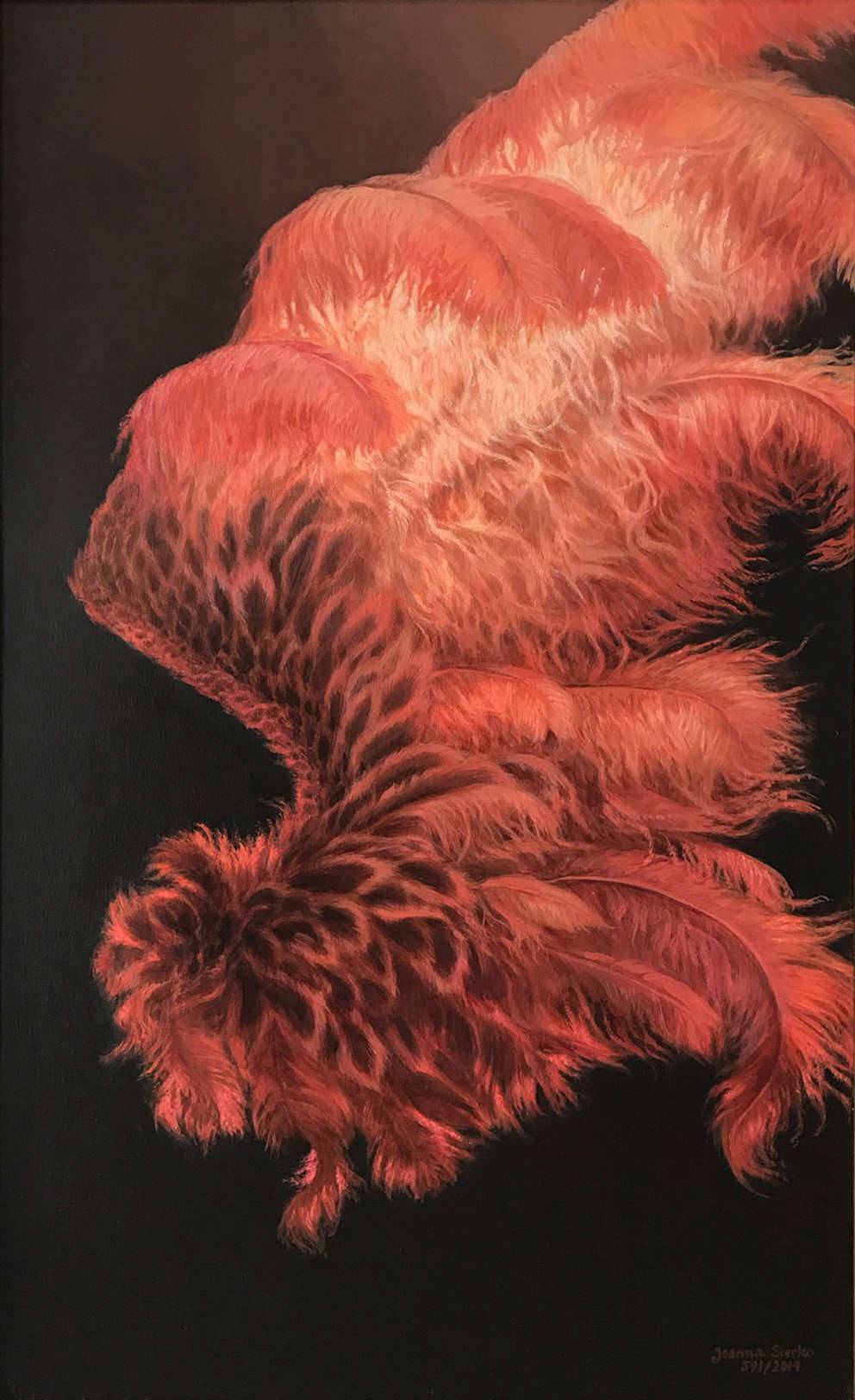 Obraz emanuje ciepłem, które zdaje się otulać oglądacza jak przytulny szal. Dominują tu odcienie płomiennej pomarańczy i czerwieni, kontrastujące z głębokim, niemal aksamitnym czernią tła. Kształty są organiczne, przypominają miękkie, falujące pióra, które wirują w subtelnym tańcu. Człowiek patrzy na to i myśli: "Ale bym się w to wtaplał!" Atmosfera jest dynamiczna, ale zarazem uspokajająca, jak oglądanie rozpalonego ogniska w zimową noc. Artysta zastosował techniki mieszania kolorów, by uzyskać efekt głębi i ruchu. Pociągnięcia pędzla są wyraziste, ale jednocześnie na tyle delikatne, że cała kompozycja wydaje się prawie eteryczna. To nie jest obraz, który da się przeoczyć. Ma w sobie coś, co wzbudza ciekawość, coś, co każe zatrzymać się na chwilę. Wow, i popatrzeć jeszcze raz. Patrząc na ten obraz, czujesz, jakby ciepło z płomieni promieniowało na ciebie. Może przypominasz sobie letnie wieczory przy ognisku, pełne śmiechu i dźwięków płonącego drewna. A może zastanawiasz się, jak artysta uchwycił tak ulotny moment na płótnie. Cokolwiek to jest, czujesz connection z tym obrazem. To jak rozmowa bez słów, która pozostawia refleksję i ciekawość. Wzbudza emocje, które są jednocześnie spokojne i intensywne, jak poranna kawa, która dodaje energii na cały dzień.