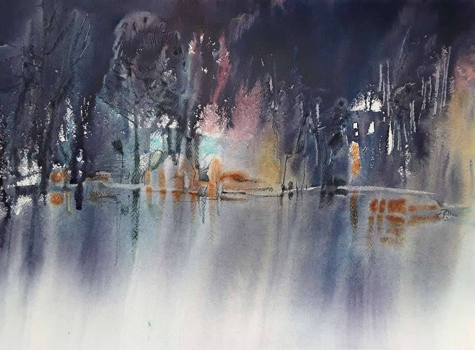 Ekspresja wyrażona w odważnym lecz wysublimowanym kolorze. Ruch pokazany za pomocą technicznych możliwości jakie daje to medium - przelania wody, chlapnięcia farby,mieszanie się kolorów i zatrzymanie ich przez szybkie wysuszenie- to gama powstałych na bawełnianym papierze czerpanym niepowtarzalnych efektów. To wszystko w moich obrazach jako zapis unikalnego, jednostkowego zjawiska jakim jest akwarela. Obraz oprawiony w Passe-partout, włożony pod szkło i w ramę drewniana w kolorze srebra patynowanego złotem.