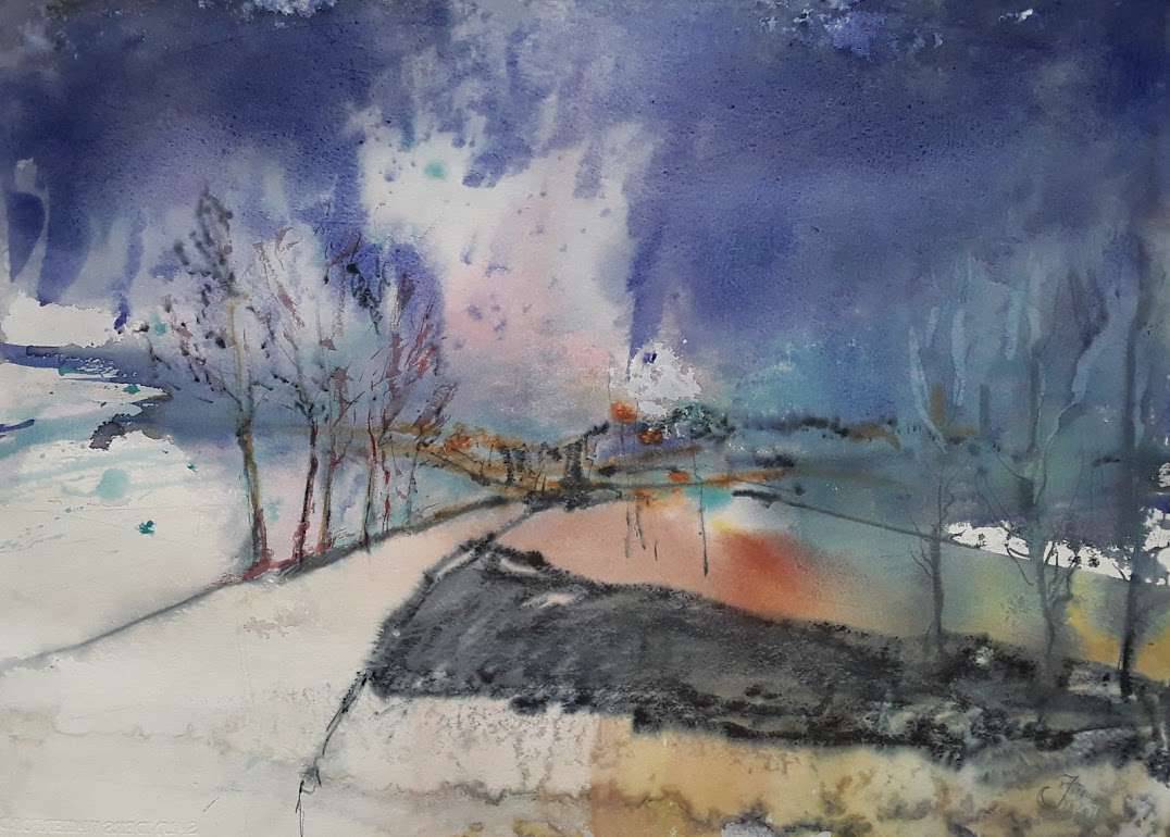 Ekspresja wyrażona w odważnym lecz wysublimowanym kolorze. Ruch pokazany za pomocą technicznych możliwości jakie daje to medium - przelania wody, chlapnięcia farby,mieszanie się kolorów i zatrzymanie ich przez szybkie wysuszenie- to gama powstałych na bawełnianym papierze czerpanym niepowtarzalnych efektów. To wszystko w moich obrazach jako zapis unikalnego, jednostkowego zjawiska jakim jest akwarela. Obraz oprawiony w Passe-partout, włożony pod szkło i w ramę drewniana w kolorze srebra patynowanego złotem.
