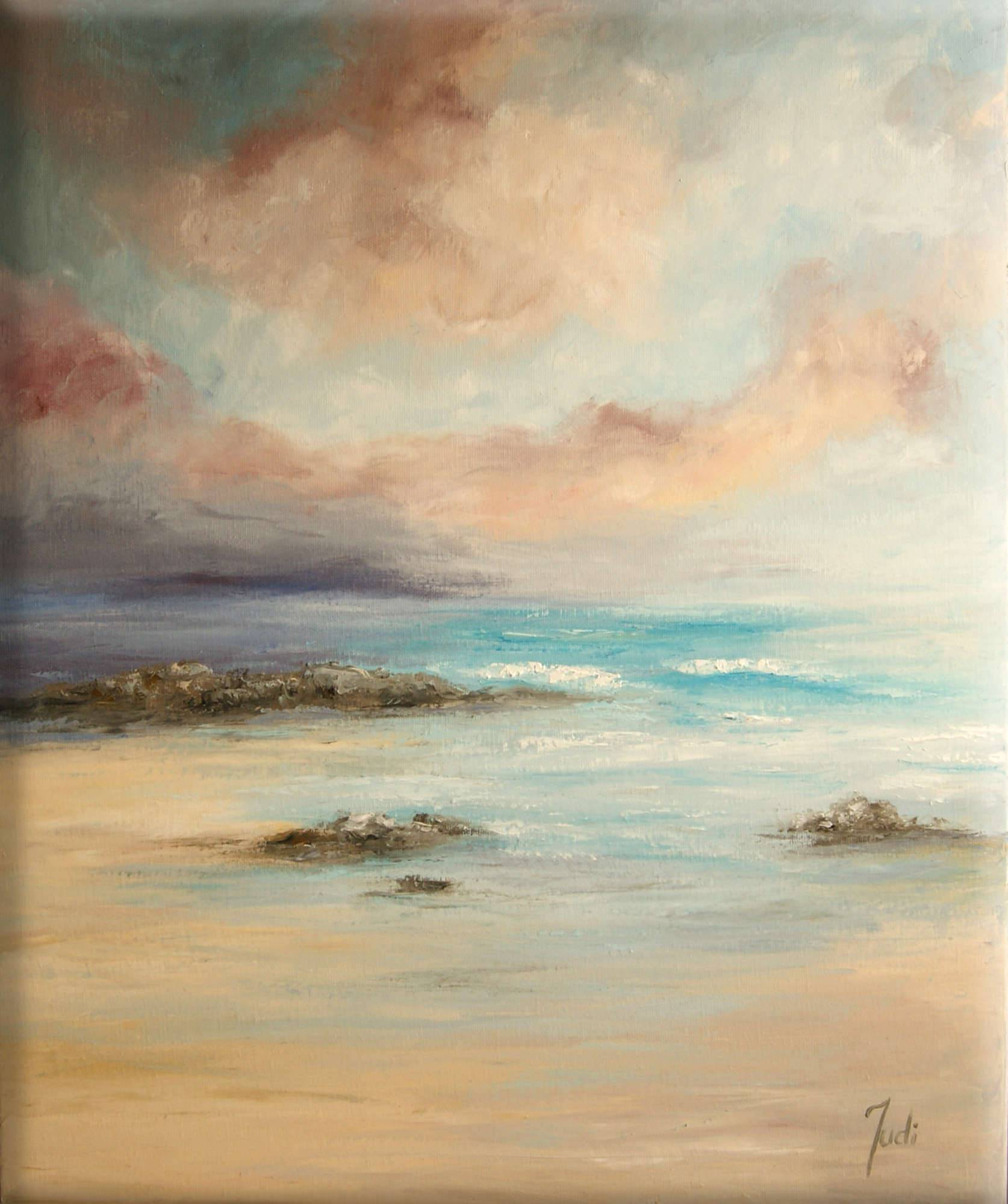 Obraz przedstawia spokojny nadmorski krajobraz, gdzie piasek, woda i niebo tworzą harmonijną całość. Kolory są stonowane, dominują beże, błękity i delikatne róże. Chmury na niebie unoszą się jak puszyste wata cukrowa, reflektując barwy wody poniżej. Kompozycja jest prosta, niemal minimalistyczna, co sprawia, że obraz emanuje spokojem i pogodą ducha. Atmosfera jest wręcz sielska. Patrząc na obraz, można poczuć ciepło słońca i delikatny wiatr. Technika artystyczna sugeruje wykorzystanie miękkich pociągnięć pędzla, co dodaje całości subtelną teksturę. Wygląda jak marzenie wakacyjnej plaży, takiej wiecie, perfect. Może wprowadzać w odbiorcy nostalgię za czasami beztroski dzieciństwa, kiedy to plaża była miejscem magicznych przygód. "Ja lubię piasek" - powiedziało by każde dziecko. Wzbudza to uczucie tęsknoty za prostotą życia. Osobiście, patrzę na ten obraz i czuję chęć rzucenia wszystkiego, by usiąść na jego brzegu. Idealny moment, by zastanowić się nad sensem życia czy po prostu dać się ponieść fali relaksu.