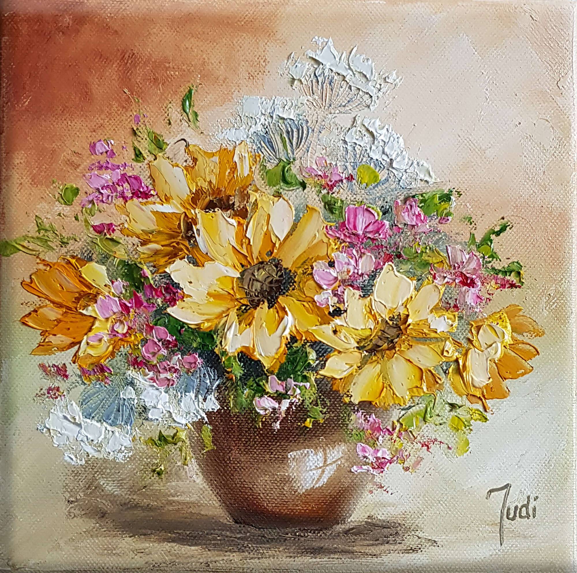 Na obrazie przedstawiono barwny bukiet kwiatów w ceramicznej wazie. Dominują tu przyciągające wzrok, duże słoneczniki w odcieniach soczystej żółci i pomarańczu, otoczone delikatnym różem małych kwiatków. Wszystko to na tle subtelnie rozmytego, bladobrązowego tła. Technika impasto sprawia, że kwiaty niemal wyskakują z płótna, a ich faktura dodaje całości głębi. Obraz emanuje ciepłem i radością, przypominając beztroskie, letnie popołudnie w ogrodzie. Styl jest pełen ekspresji, niemal słychać szelest liści. Grube pociągnięcia pędzlem tworzą relief, co dodaje dziełu trójwymiarowości. To wygląda jak magiczny ogród! Z pewnością obraz może budzić pozytywne emocje, jak radość i spokój. Jest w nim coś nostalgicznego, co przywołuje wspomnienia dzieciństwa. Można sobie wyobrazić, jak artysta, z pasją i energią, aplikował farbę, tworząc tę żywą kompozycję. Całość sprawia, że chce się patrzeć dłużej, zatrzymać chwilę i nacieszyć się tym "happy moment". Czy ten obraz nie przypomina trochę o pięknie prostych rzeczy? Jest tu coś, co wywołuje uśmiech na twarzy nawet w najbardziej szary dzień.