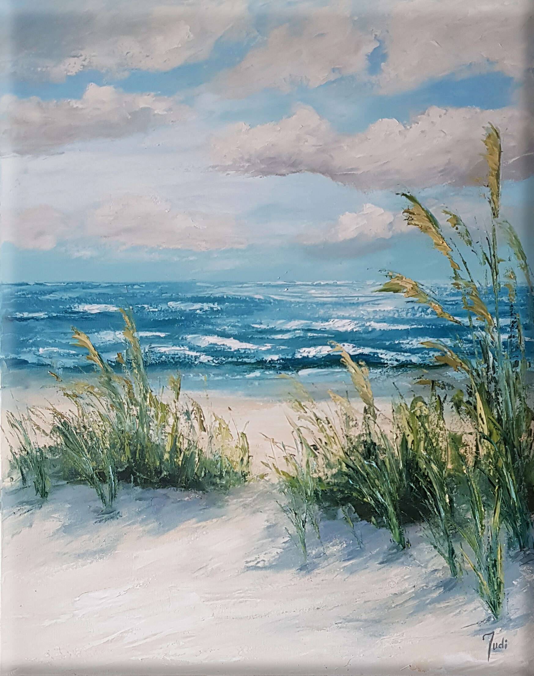 Obraz przedstawia spokojny krajobraz nadmorski, który tętni subtelną harmonią kolorów. Błękitne i turkusowe odcienie wody delikatnie kontrastują z jasnymi, kremowymi plażami, przywodząc na myśl beztroskę letnich dni. Chmury na niebie są malowane z lekkością, ich puszystość niemal zaprasza do dotknięcia. Z przodu widać zielone trawy, które tańczą na wietrze jak wesołe dzieciaki. Ten nieformalny krajobraz ma w sobie coś z magic, czego nie potrafią oddać inne obrazy. Atmosfera jest spokojna, wręcz medytacyjna. Czujesz niemalże szum fal i śpiew ptaków. W tym dziele wyczuwam impresjonistyczne wpływy: miękkie pociągnięcia pędzla i rozmycie barw tworzą iluzję ruchu. Styl malowania jest swobodny, jakby artysta chwycił pędzel i ot, tak zaczął tworzyć z serca. Daje to poczucie autentyczności. Obraz może budzić tęsknotę za miejscami, gdzie czas płynie wolniej. Wzbudza to uczucie nostalgii i pragnienie ucieczki od codzienności. Czy to nadzieja na lato, czy zwykła chwila relaksu – każdy może odnaleźć tu coś dla siebie. "Patrz mamo, to morze!" – mogłoby wykrzyknąć dziecko, zachwycone widokiem. Świetnie oddany klimat sprawia, że chciałoby się tam być, choćby na moment. To dzieło to prawdziwy escape od codzienności.