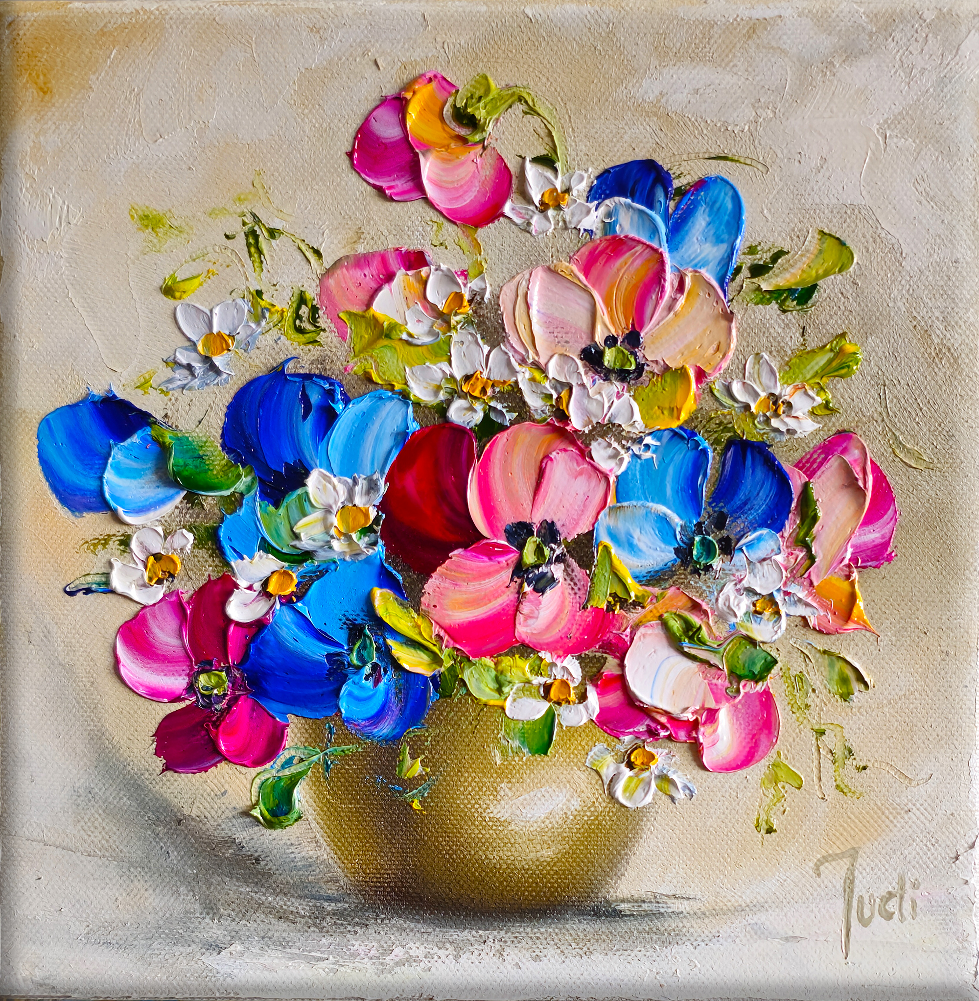 Obraz olejny malowany farbami wysokiej jakości firmy Talens - Van Gogh Płótno włoskie naciągnięte na blejtram Sygnowany i zabezpieczony werniksem Gruba wyrazista faktura farby nakładana szpachelką i pędzlem Boki zamalowane w tonacji obrazu - nie wymaga ramy! Certyfikat autentyczności.