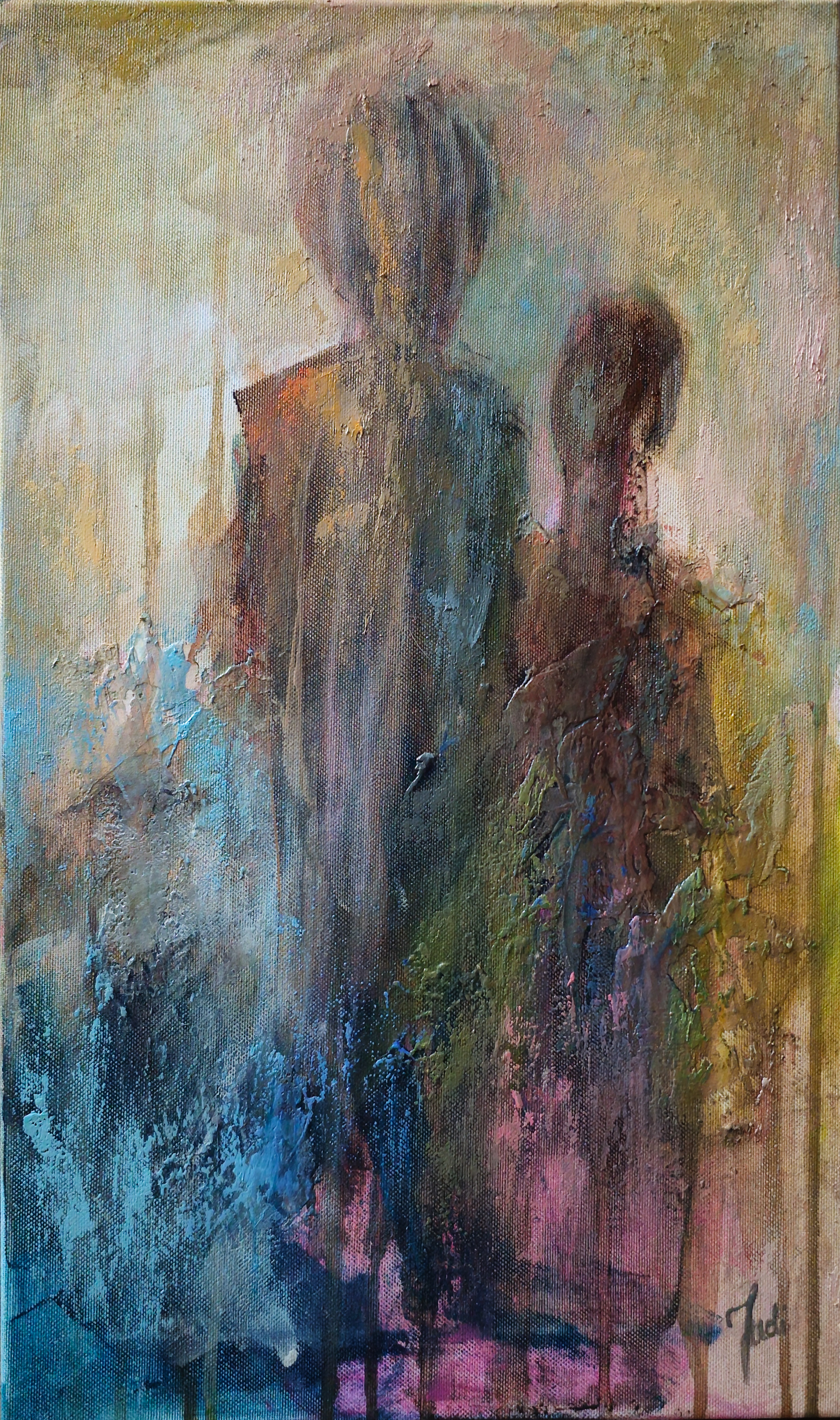 Na obrazie widzimy dwie nieco rozmyte sylwetki, które wyłaniają się z tła pełnego tajemniczych, ziemistych odcieni. Kolory mieszają się w dziwny taniec - ciepłe brązy, chłodne błękity i delikatne różowości. Ciekawe faktury farby tworzą iluzję ruchu, jakby postacie były tylko chwilowo schwytane w kadrze. Atmosfera obrazu jest pełna nostalgii, ale też wyczuwalny jest w niej pierwiastek tajemniczości. Może to wspomnienie z dzieciństwa albo fragment snu, który pamięta się bardzo niewyraźnie. Styl obrazu jest impresjonistyczny, z nutką abstrakcji, a technika, jaką posługuje się artysta, sprawia, że postacie wydają się niemal wychodzić z płótna. Malunek przywołuje uczucie spokoju, ale i zaciekawienia tym, co kryje się dalej. Dzieci mogłyby powiedzieć, że to jest o duchach i czary-mary, bo obraz ma w sobie coś magicznego. Dla mnie, najbardziej interesujące jest to, jak każdy element widoczny na płótnie wydaje się mówić swoją własną historię. It's like a window into another world, gdzie wszystko jest możliwe. Widz patrząc na ten obraz z pewnością zanurzy się w swoich własnych wspomnieniach.