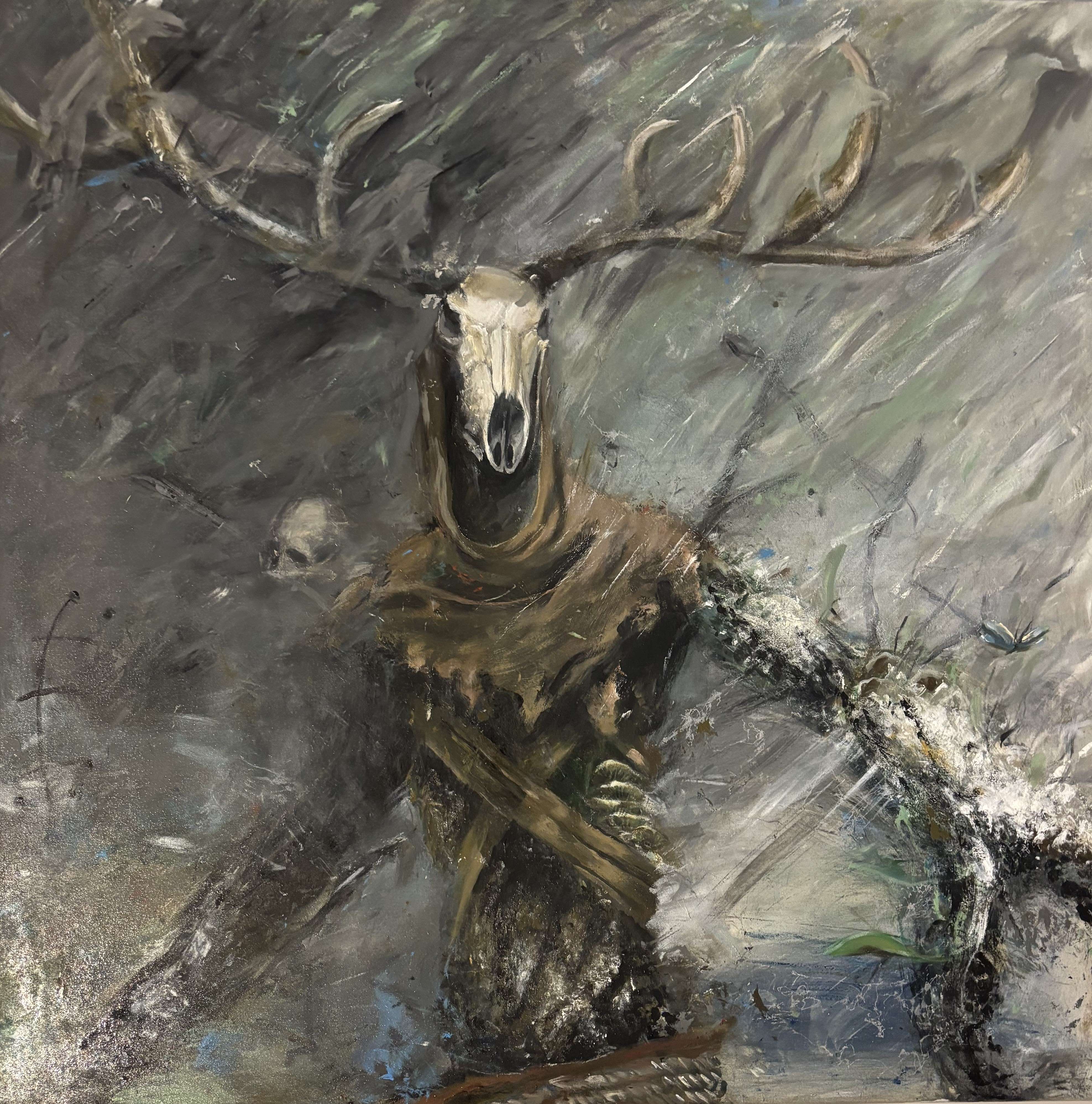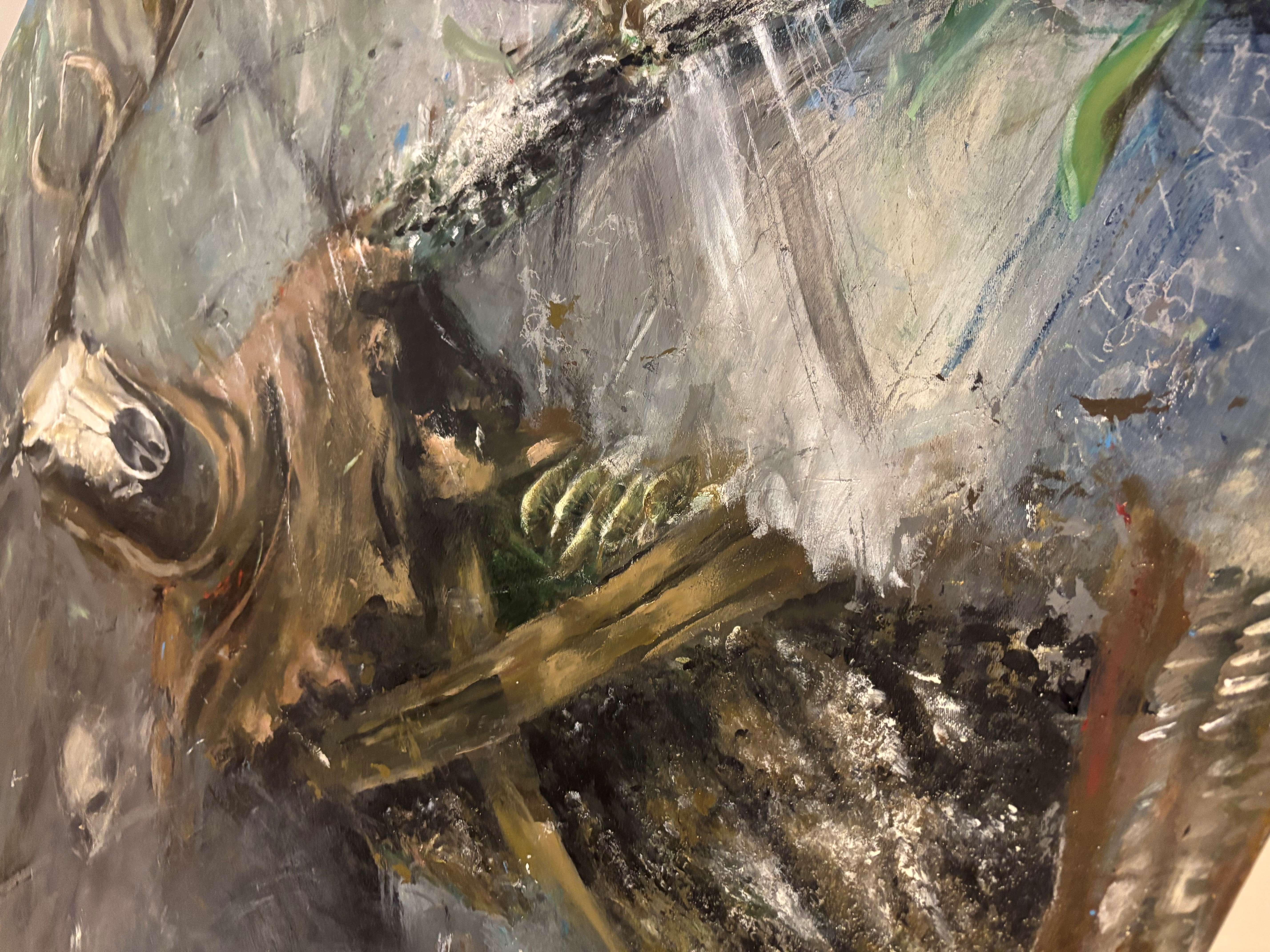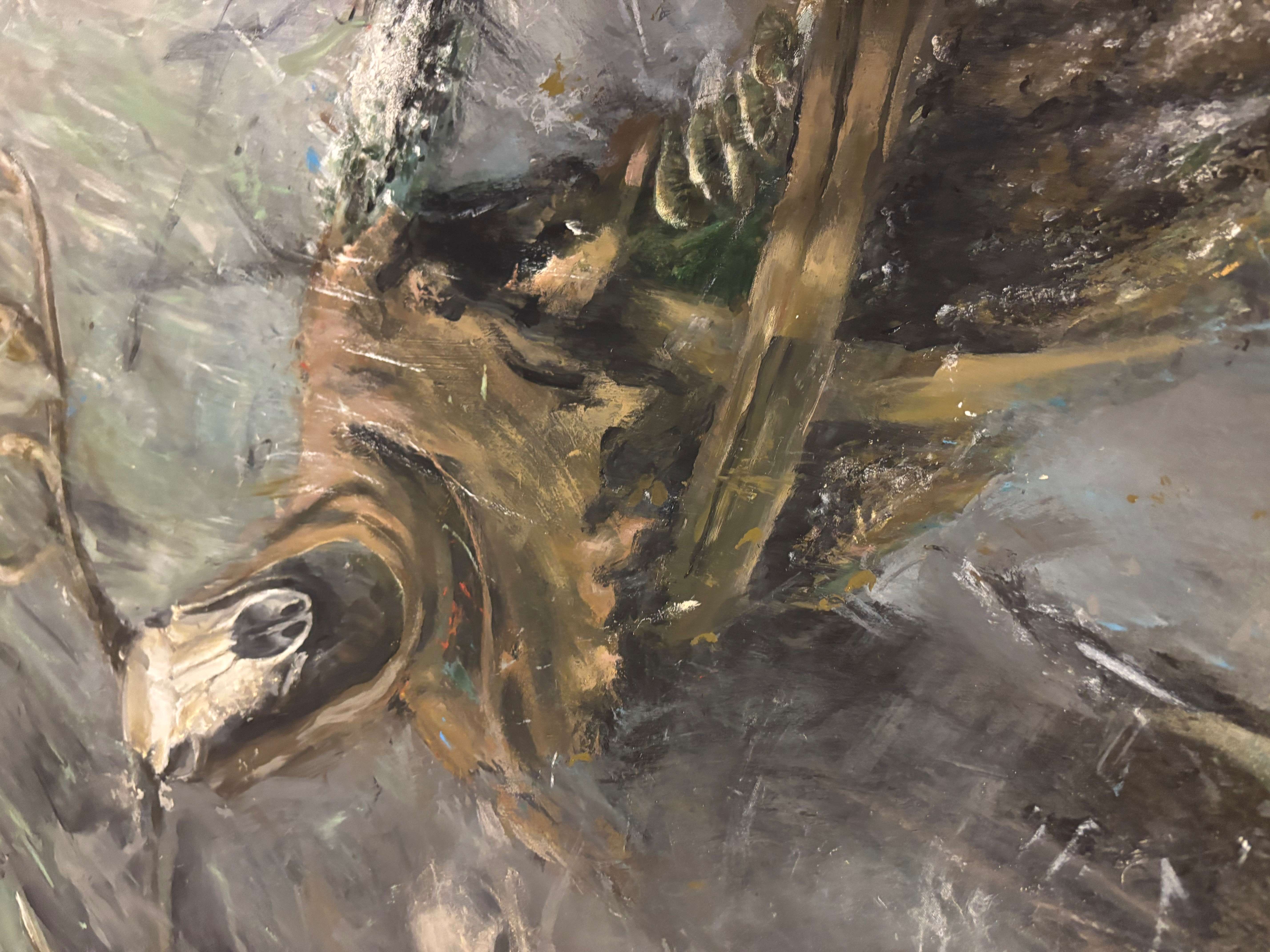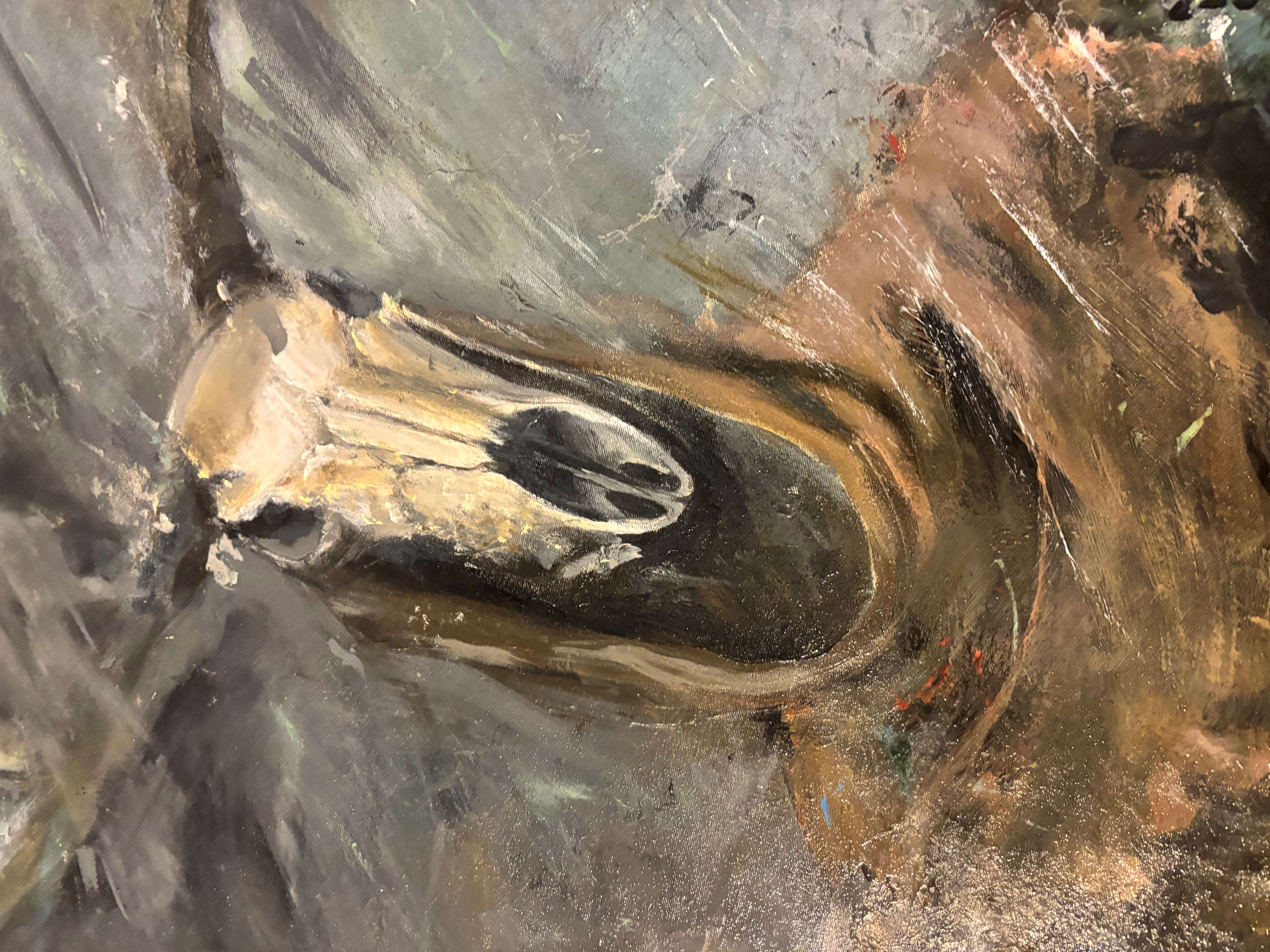Pamiętacie kim jest Leszy? to słowiański duch lasu, władca lasów, który w zależności od wierzeń i opowieści może być dobroczynny (opiekun zwierząt) lub złośliwy (wodzący ludzi na manowce). Patrząc na obraz, możemy poczuć przypływ niesamowitynych emocji. Może odrobina strachu, a może fascynacji tajemnicą, jaką skrywa ta kompozycja. Wyobrażam sobie, jak czaszka opowiada swoją historię, pełną przygód i zapomnienia. Tak, jakby mówiła: "Life is a mystery." Z jednej strony mamy uczucie zagubienia w tej chaosie barw, i mroku a z drugiej fascynuje nas jego harmonia. Dominują tu szarości i brązy, które mieszają się w sposób chaotyczny, tworząc wrażenie ruchu i swoistej żywiołowości. W centrum widzimy czaszkę, która zdaje się być nie tylko martwym elementem, ale niemal żywym bytem w tej kompozycji. Tło jest rozmyte, co nadaje całej scenie tajemniczości i niejasności. Technika malarska jest odważna, z widocznymi pociągnięciami pędzla i impastem, co dodaje obrazowi tekstury i głębi. Klimat tej pracy jest wręcz mistyczny. Zapraszam do odkrycia swojego ducha lasu.