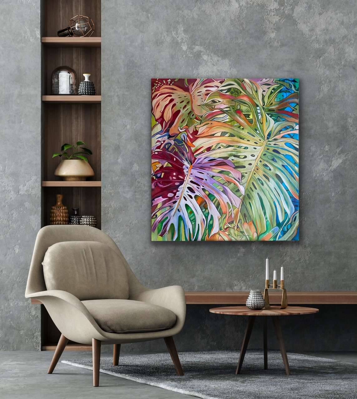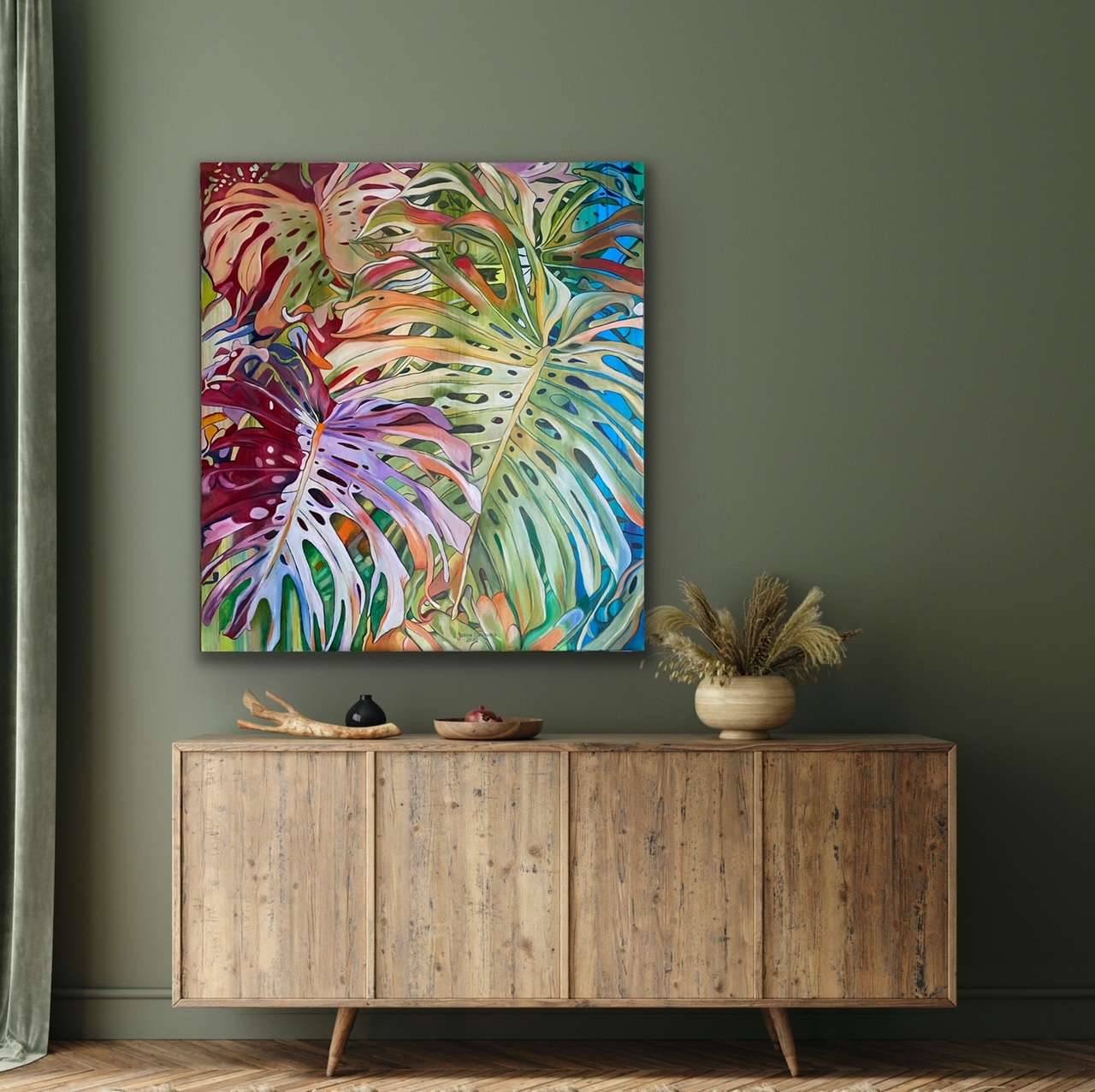 Ten obraz to prawdziwa eksplozja kolorów. Dominują na nim zielenie, fiolety i pomarańcze, układające się w kształty przypominające liście tropikalnych roślin. Kompozycja jest dynamiczna, niemalże tętni życiem. Artysta użył jaskrawych barw, dzięki czemu obraz wydaje się pulsować ciepłem i witalnością. Malarska technika, choć wydaje się prosta, jest pełna ekspresji. Widoczne pociągnięcia pędzla nadają obrazowi unikalny, prawie że surrealistyczny klimat. A może to dekoracyjny vibe? Nadaje mu takiego odlotowego charakteru. Nastrój jest pełen radości i lekkości. Czujemy się jak w egzotycznym ogrodzie, gdzie każdy liść opowiada swoją historię. Dzieło emanuje spokojem, ale również tęsknotą za naturą. Jest jak zaproszenie do zapomnienia o codziennych troskach i zanurzenia się w świecie marzeń. Jakby coś z dziecięcej wyobraźni. Mamo, chce takiego liścia! Ten obraz prowokuje do refleksji nad pięknem przyrody, ale i nad naszym miejscem w niej. Jednocześnie jest to dzieło, które budzi uśmiech i zachwyt. Może nie każdy dostrzeże w nim to samo, jednak emanująca z niego energia jest bezdyskusyjna. To coś, co czujesz gdzieś głęboko, aż cię ciarki przechodzą.