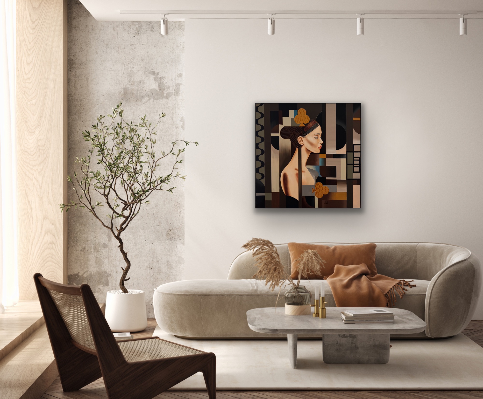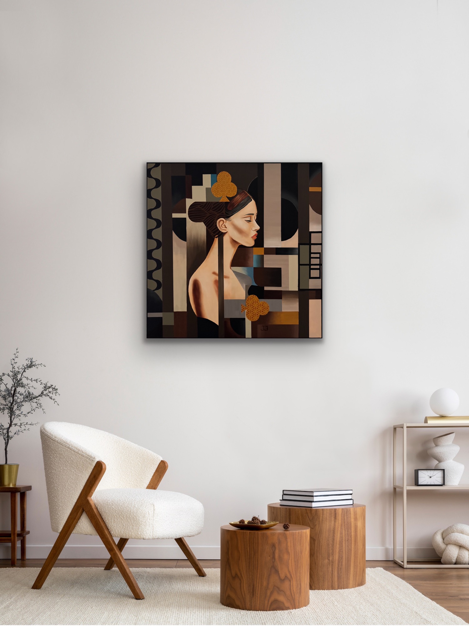 Obraz ten to prawdziwa uczta dla oczu, gdzie ciepłe brązy i subtelne beże splatają się w harmonijną kompozycję geometrycznych kształtów. Rozłożenie pionowych i poziomych linii tworzy rytm, który przypomina taniec pełen gracji. Główna sylwetka młodej kobiety, umiejętnie wkomponowana w tło, wraz z zamkniętymi oczami zdaje się emanować spokojem i kontemplacją. Jej twarz to mieszanka realistycznych detali i abstrakcji, co wprowadza nutę tajemniczości i elegancji. Atmosfera tego dzieła jest niezwykle refleksyjna. To trochę jak patrzenie na morze: można się w tym zatracić. Styl przypomina odważne eksperymenty kubistów, gdzie tradycyjne formy zostały przekształcone w intrygujące abstrakcje. Widoczna jest precyzja, ale i pewna dawka swobody twórczej. Co ciekawe, obraz może budzić różnorodne emocje: od spokoju po fascynację. Dla niektórych może być wręcz hipnotyzujący. Jak powiedziałoby dziecko: "Ona wygląda jak z magicznej krainy!" To prawda. Jest w niej coś niezwykle wyjątkowego. Dla mnie osobiście to jak spojrzenie w głąb własnych myśli. Tak jakby artysta złapał moment, kiedy wszystko przestaje mieć znaczenie i jest tylko cisza. Czyż to nie jest wspaniałe?