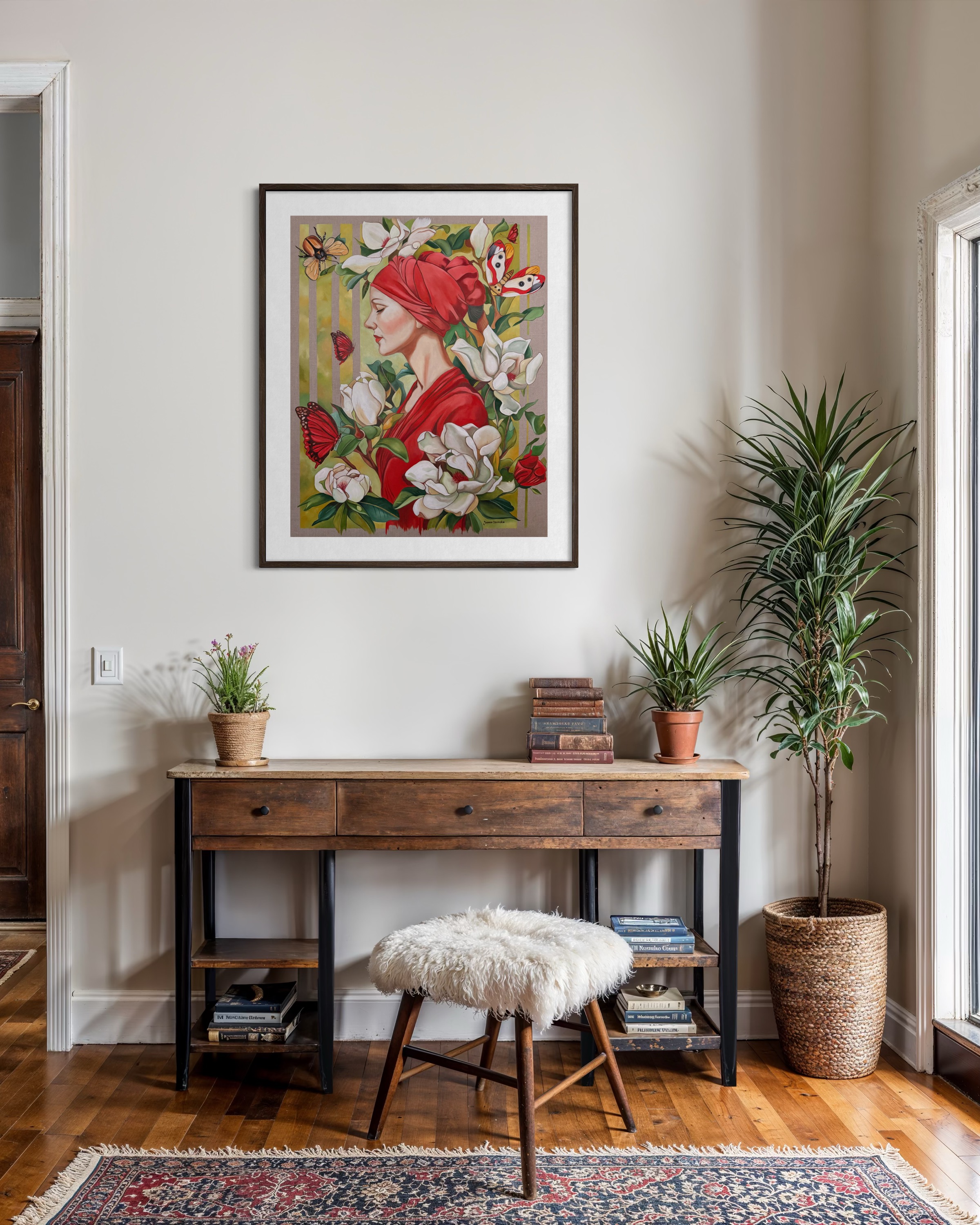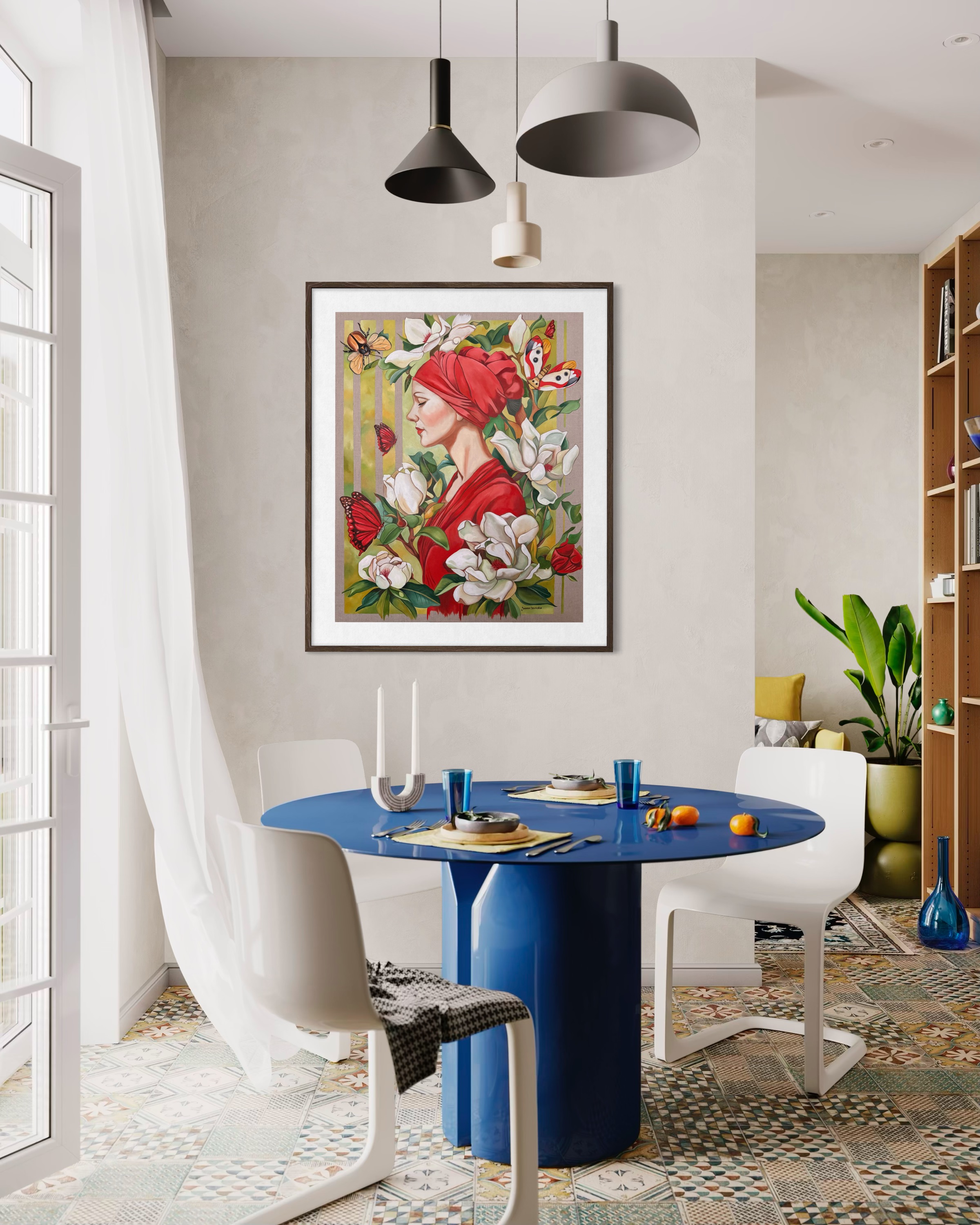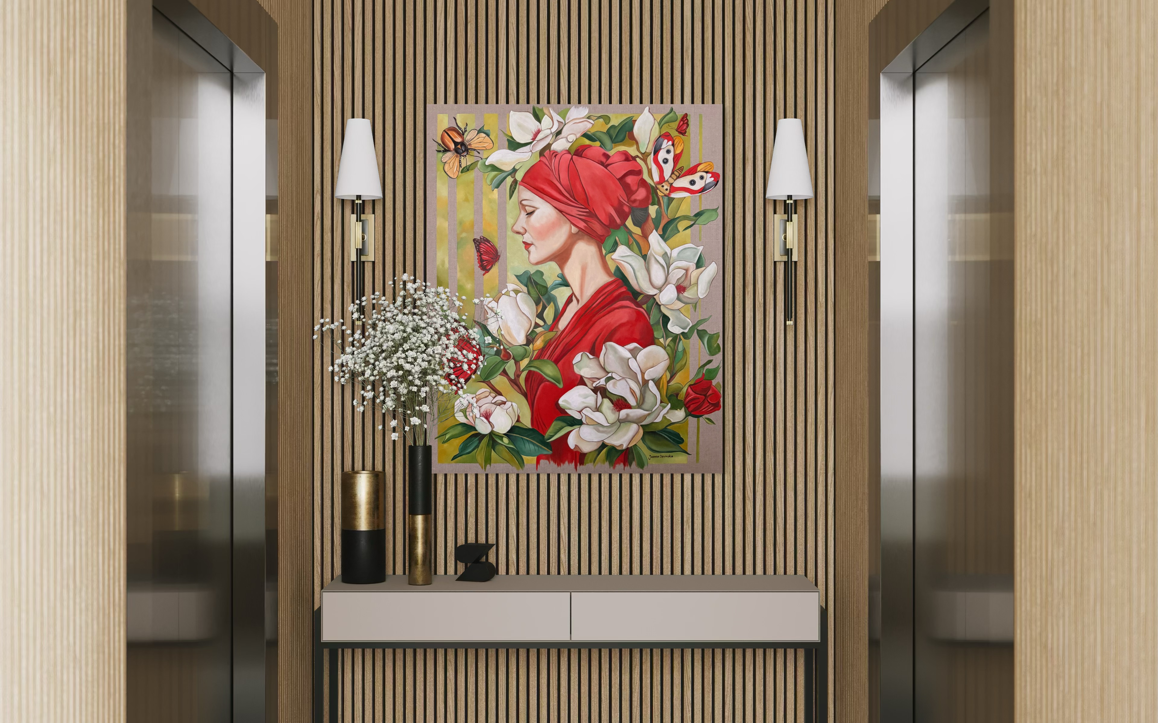 Portret kobiety w profilu, ubranej w intensywnie czerwony turban i miękki szal, otulony kaskadą białych magnolii oraz liści o oliwkowym połysku. Tło to pasy i prostokąty, lekko przetarte, jakby płótno chciało oddychać. Między gałązkami trzepoczą czerwone motyle i złotawy chrząszcz, wszystko układa się w harmonijny krąg spojrzeń. Pani ma czerwony turban i motylki dookoła i jest bardzo ładna. Nastrój spokojny, kontemplacyjny, ale i trochę zaczepny. Styl miesza secesyjną linię z gładkim modelowaniem, momentami kontur jest aż bold. Myślę, że to akryl z domieszką laserunku, zblizenia miękkie, krawędzie zdecydowane. Czuję wiosnę i cichą siłę, serio. Troche nostalgii, chwile zachwytu, naprawde porusza to serce.