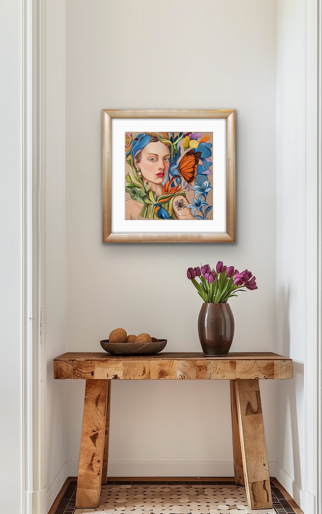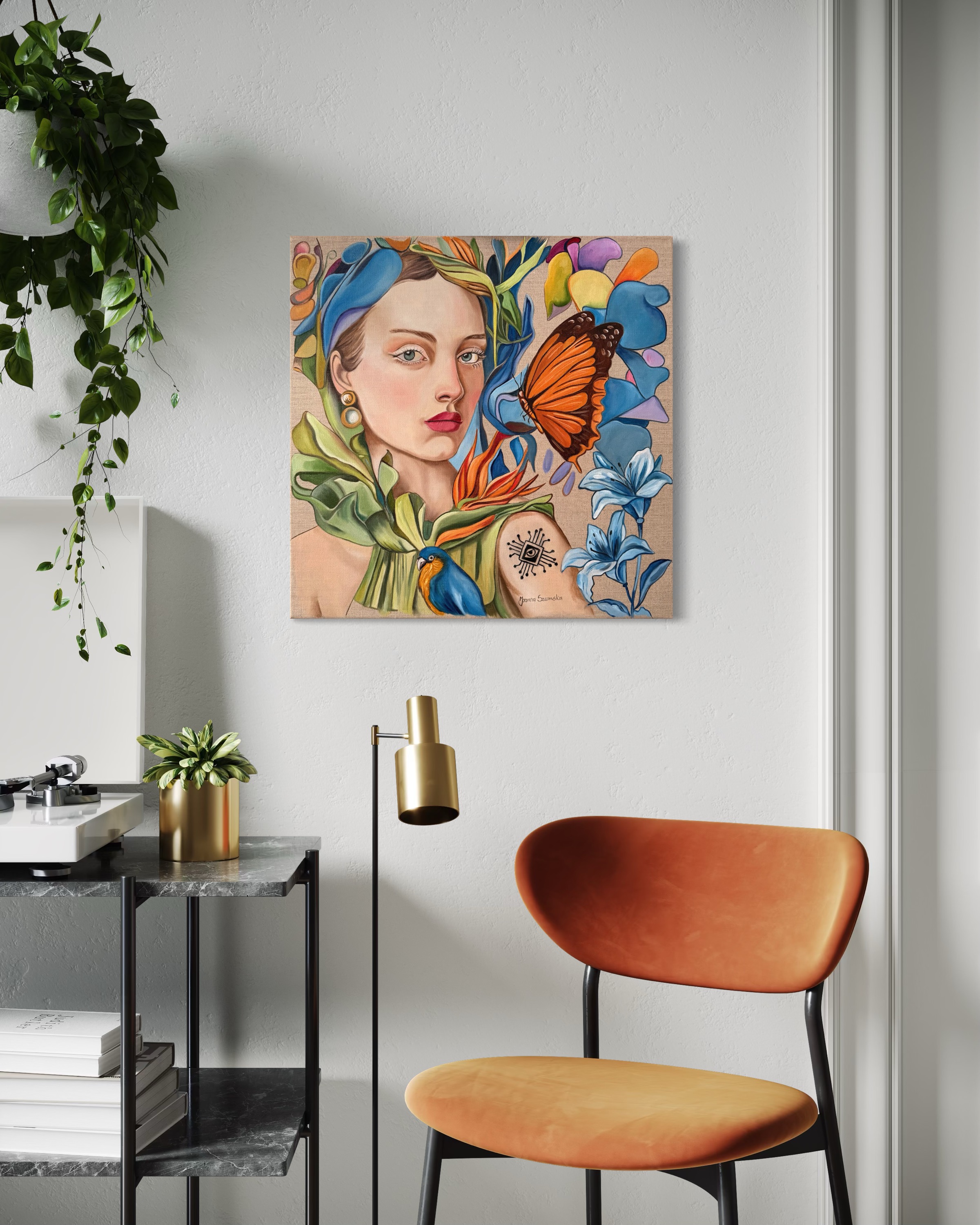 „Antidotum” to obraz o poszukiwaniu równowagi w świecie zdominowanym przez technologię i cyfrowe reprezentacje tożsamości. Centralna postać – kobieca awatarka – zanurzona jest w żywym, organicznym środowisku natury, które współistnieje z graficznym znakiem technologii wpisanym w jej ciało. Motyl, ptak i roślinność stają się tu symbolami intuicji, transformacji i pierwotnej wiedzy, kontrastując z chłodnym, abstrakcyjnym językiem cyfrowym. Obraz nie opowiada o konflikcie, lecz o dialogu – o próbie integracji tego, co naturalne i zmysłowe, z tym, co wirtualne i zaprogramowane. „Antidotum” jest malarską refleksją nad stanem „pomiędzy”: pomiędzy ciałem a kodem, emocją a algorytmem, obecnością a symulacją. To sugestia, że prawdziwym lekarstwem na nadmiar technologii nie jest ucieczka, lecz świadome zakorzenienie w naturze, intuicji i doświadczeniu bycia tu i teraz.