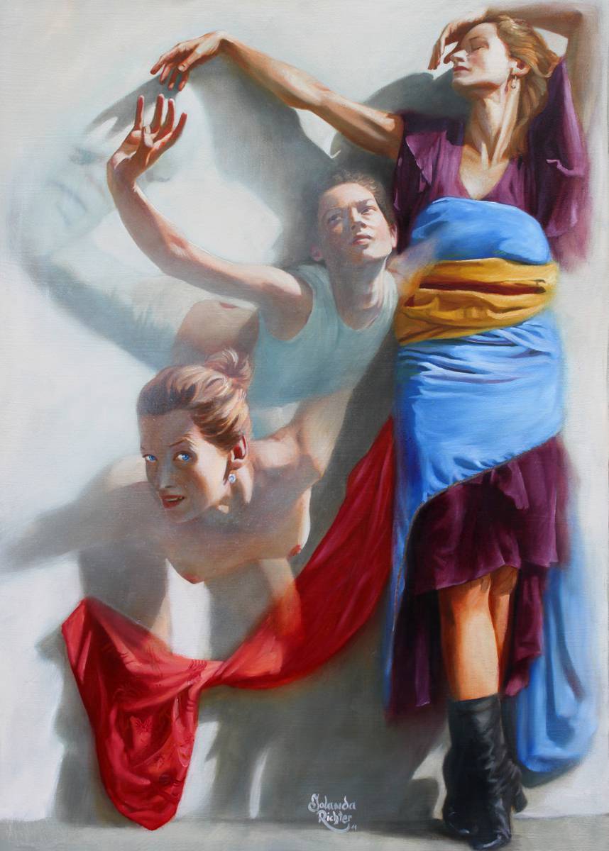 Obraz emanuje dynamiczną energią. Dominują tu intensywne kolory: czerwień, niebieski i żółty, które tworzą kontrast z subtelnym tłem. Postacie są uchwycone w ekspresyjnych pozach, jakby zatrzymane w tańcu lub ruchu, co dodaje scenie dramatyzmu. Kompozycja jest bogata i wielowarstwowa, każda postać wydaje się poruszać w swojej własnej przestrzeni. Atmosfera jest tajemnicza i nieco surrealistyczna, emanująca mieszanką napięcia i harmonii. Technika artystyczna, jakiej używa artysta, oscyluje pomiędzy realistycznym oddaniem detali a abstrakcyjną grą światła i cienia. Ten obraz to kalejdoskop emocji. Można poczuć uczucie wolności i nieco melancholii. Style? Oh, to jest pure magic. Różnorodność kolorów i ruch przypomina falę na oceanie. Jak to wszystko zinterpretować? Jedna osoba widzi w tym walkę o osobistą wolność, inna podróż przez czas. Dla dziecka, mógłby to być obraz ludzi bawiących się w chowanego, bo widać ich trochę i nie widać. Całość działa na wyobraźnię i można nad nim dumać godzinami. Osobiście czuję, że to konfrontacja pomiędzy tym, co wewnętrzne a światem zewnętrznym. Fascynujący obraz, który można oglądać bez końca.