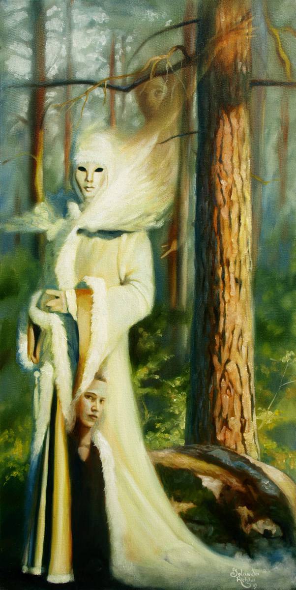 Obraz przedstawia tajemniczą scenę w gęstym lesie. Dominuje tu magia i pewna dziwna energia. Postać o białej, niemal eterycznej twarzy ubrana w długi płaszcz przypomina ducha lub niezwykłą postać z baśni. Jej oczy są ciemne, co nadaje jej nieco mrocznego uroku. Cienie drzew otaczają postać, a światło przenika przez liście, tworząc intrygujące wzory na ziemi. Barwy są stonowane - odcienie zieleni, brązu i bieli przenikają się płynnie, nadając obrazowi organiczny "flow". Atmosfera jest trochę niepokojąca, ale też fascynująca. Wygląda to jak wejście do innego świata, trochę jak w bajce. Artystycznie mamy tu do czynienia z miękkimi przejściami i subtelnymi pociągnięciami pędzla. Nastrój przypomina sny - takie, co nie chcesz, żeby nigdy się kończyły. Obraz wywołuje różne emocje - od ciekawości, przez lekki niepokój, aż po zachwyt nad ukrytymi znaczeniami. Dzieciak pewnie powiedziałby: "Wow, to jak czary!". Taka jest moc tego dzieła - zachęca do zastanowienia się, co kryje się za maską tej postaci. To "mystery" przyciąga i zatrzymuje wzrok na dłużej. Fakt, obraz zmusza do refleksji nad granicą między rzeczywistością a fantazją. Do tego ten ukryty uśmiech w tle - coś tu jest, czego nie zauważasz na pierwszy rzut oka.