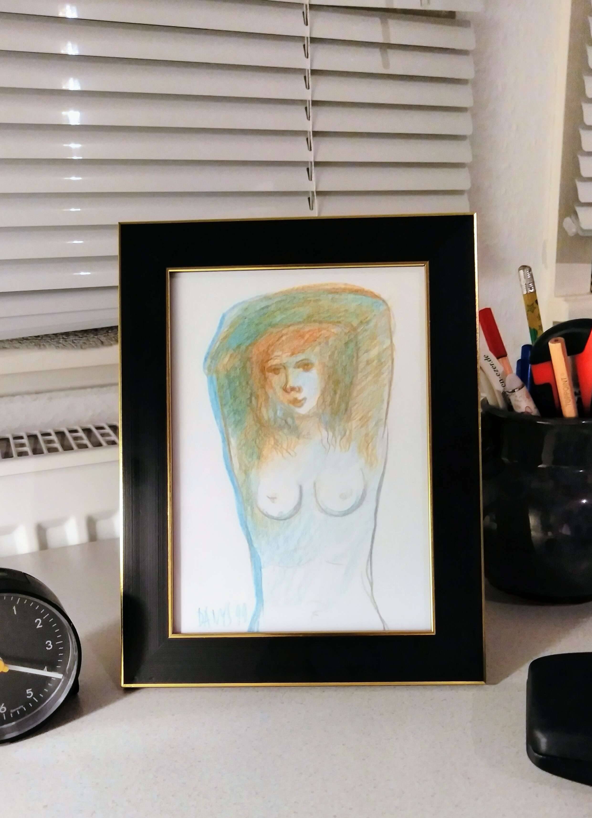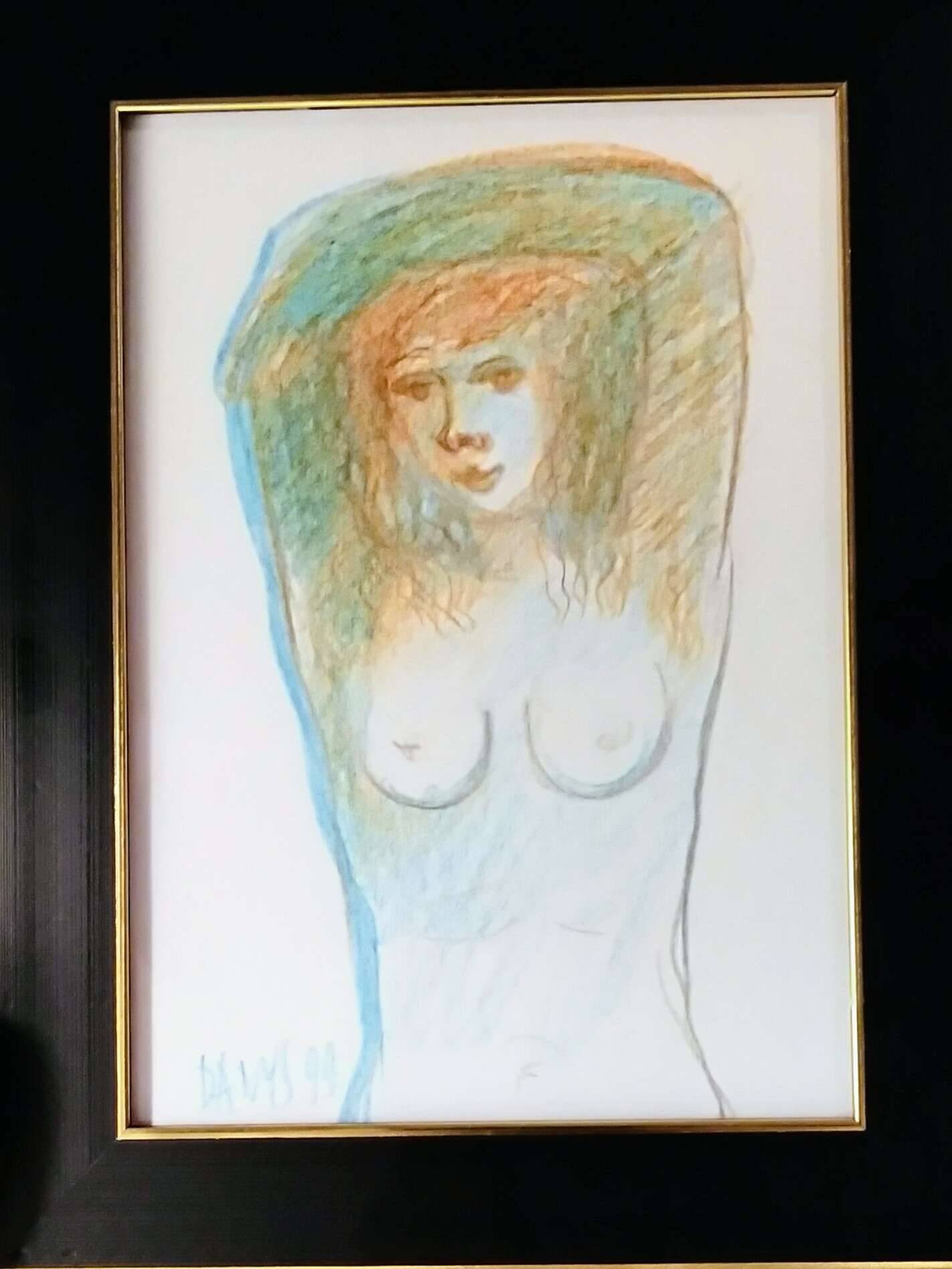 Miły, optymistycznie wpływający na widza, mały, kolorowy obrazek. Pasuje na każdym biurku. Taki portrecik może być również zabrany w podróż służbową .Można z dziewczyną porozmawiać, a ona odpowie zalotnym uśmiechem, pocieszy i zachęci do dalszej twórczej pracy.... Oprawa w ramkę o wymiarach 22 x 17 cm. Naturalnie niepowtarzalny orginał.