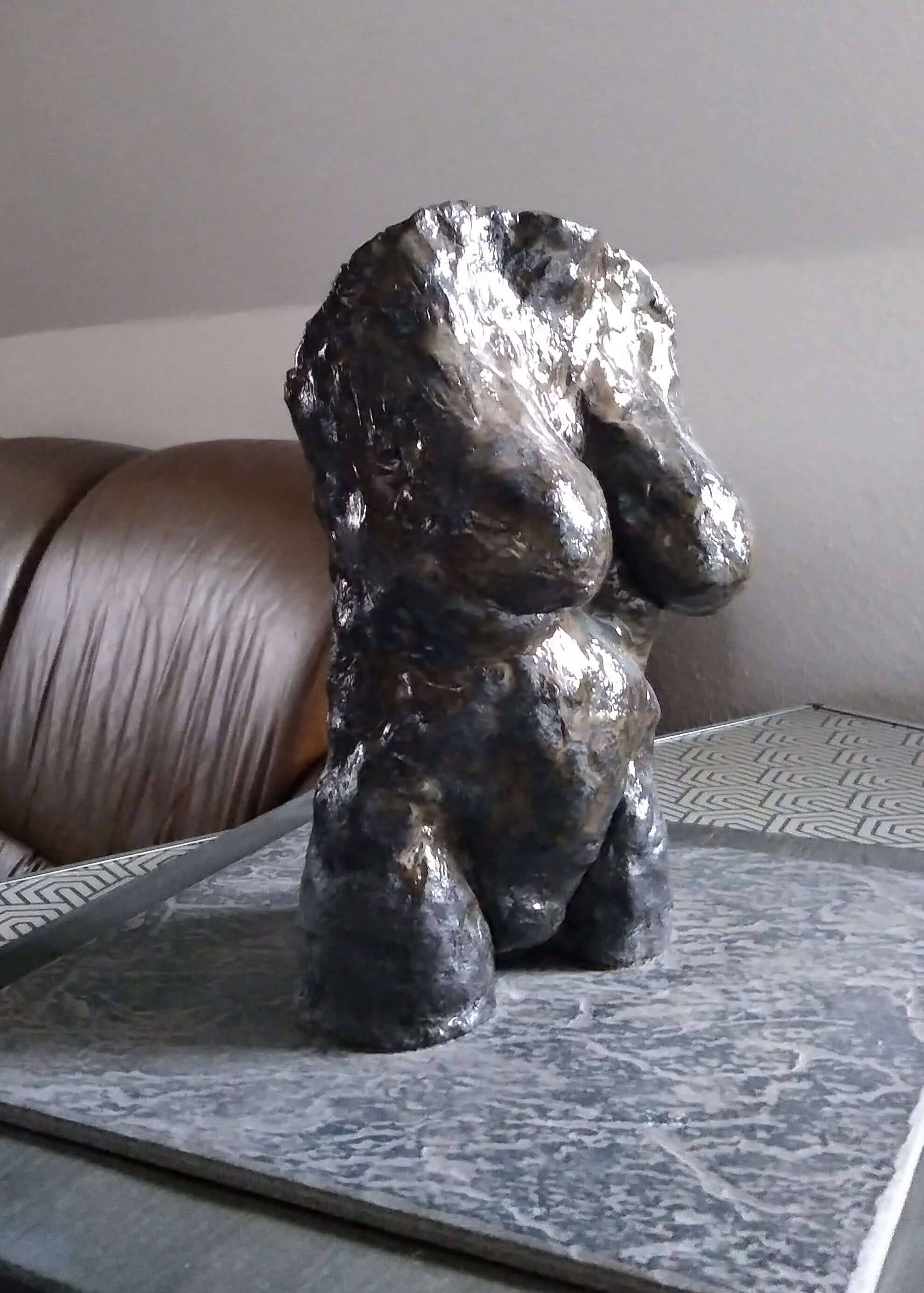 Fascynacja ciałem i ceramika z której można ciało ulepić. Połączyłam fascynacje sztuką ludów prymitywnych z nowoczesną. Figura ceramiczna, polichromowana na podstawce ceramicznej i drewnianej.