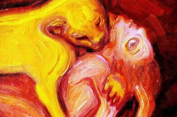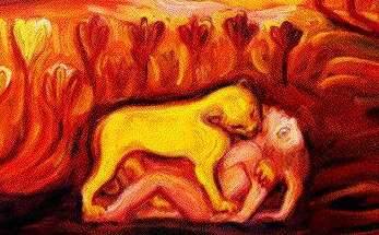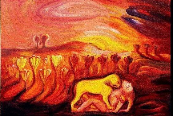Obraz potrzebujący przestrzeń, dużą płaszczyznę i możliwość odstępu. Temat przejęty jest z miniatury przedstawiającej lwicę która zadaje kres życiu nubijskiego młodego mężczyzny. Scena rozgrywa się w papirusowych gaju. Dla mnie jest to symboliczne wydarzenie - pod postacią lwicy kryje się zła kobieta... a może właśnie taka jej natura.