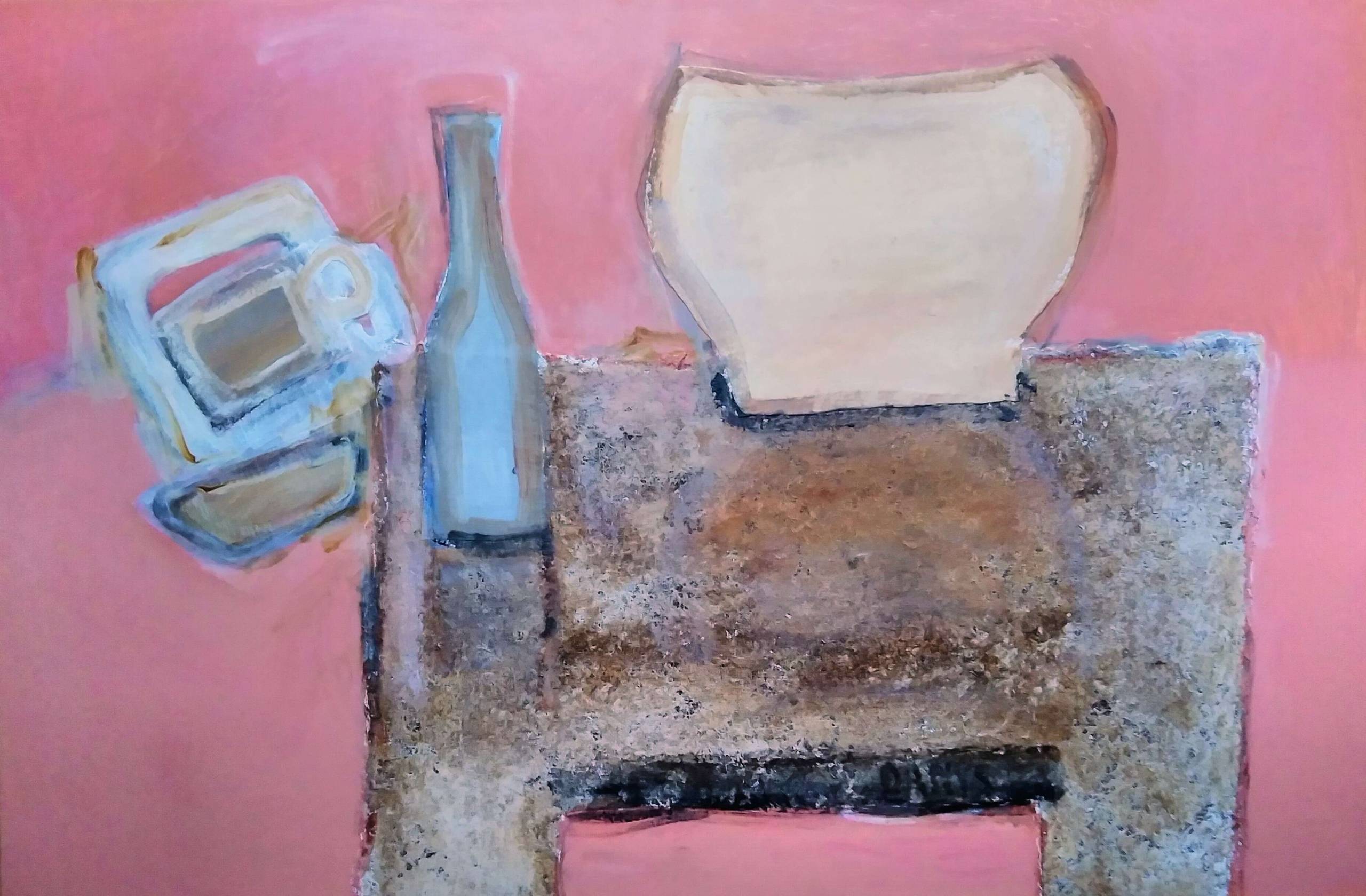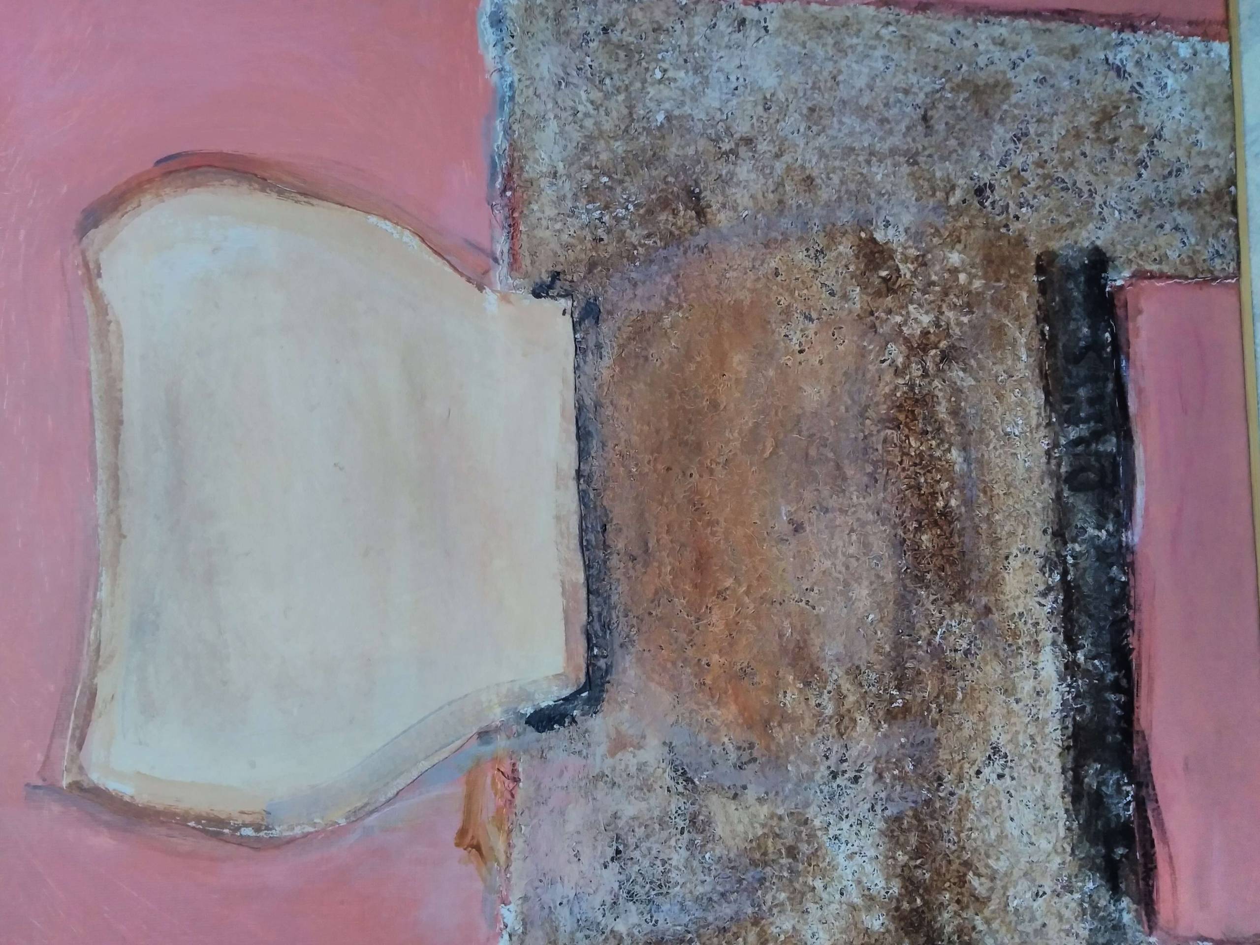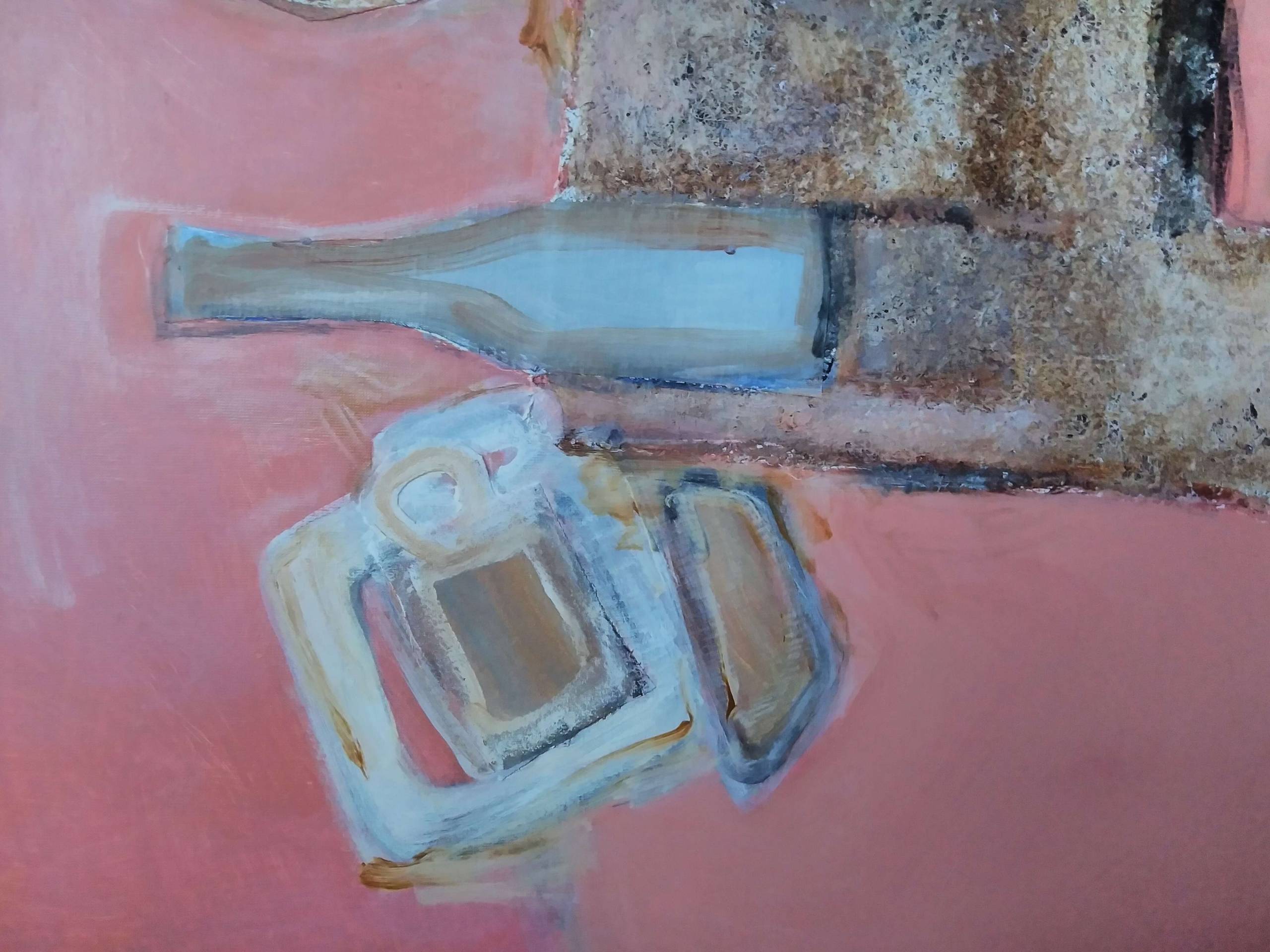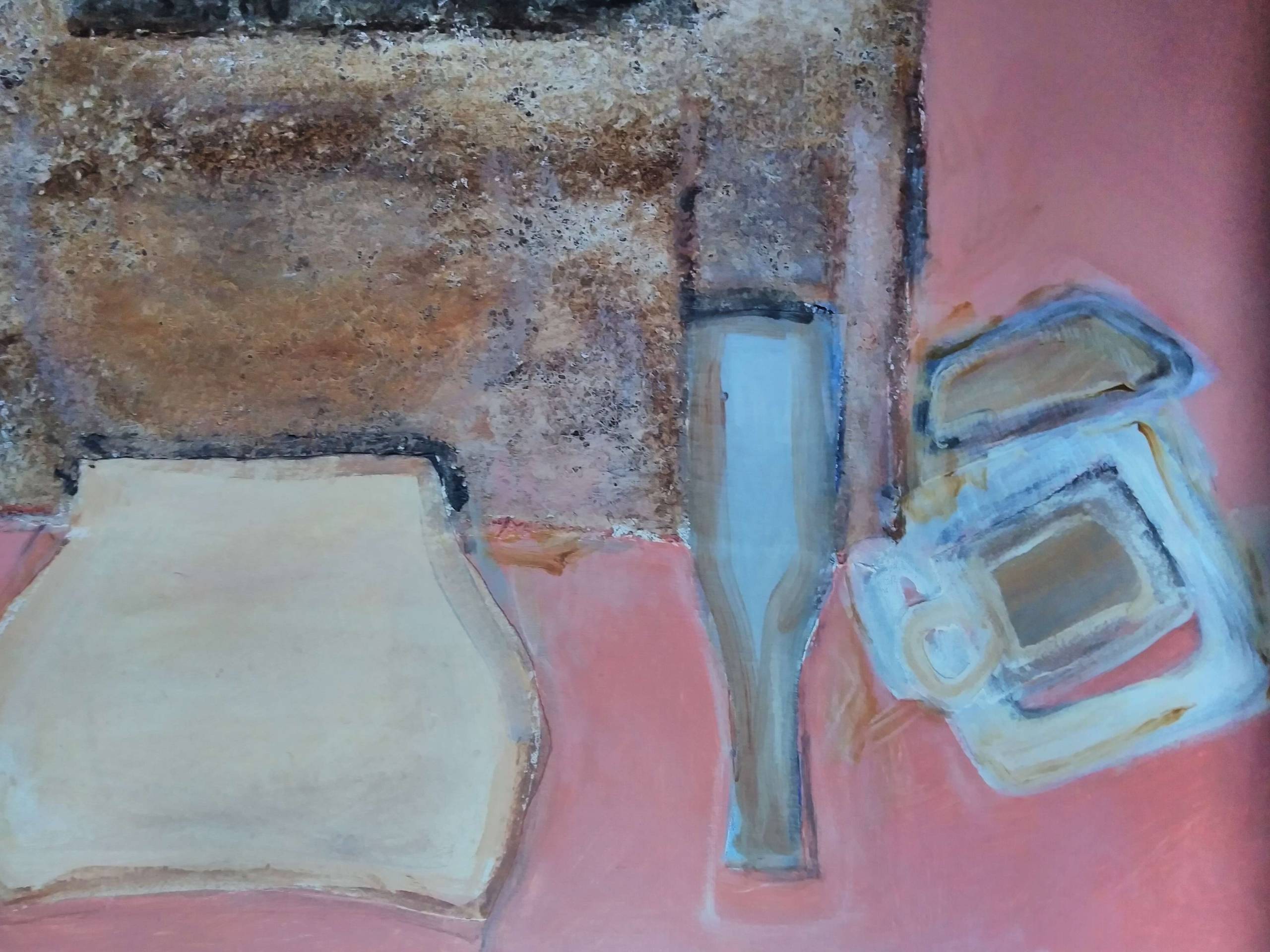 To zabawny , ekstrawagancki , duży obraz do nowoczesnego wnętrza. Wykonany w interesującej technice mieszanej - klejony i malowany - kolaż. Użyłam tutaj i tkaniny i " włochatego " innego podkładu pod malowidło i wyszło coś niepowtarzalnego. A nawiasem mówiąc, filiżanka z kawą właśnie spada ze stołu i stąd ekspresja chwili , która przecież będzie trwała w nieskończoność. Obraz ten rozjaśni każdy poranek w jadalni czy ( ale dużej) kuchni. Obecnie jest obramowany drewnianymi listewkami i jest gotowy do zawieszenia na ścianie, można też oprawić go w bardziej " porządną", ale skromną ramę.