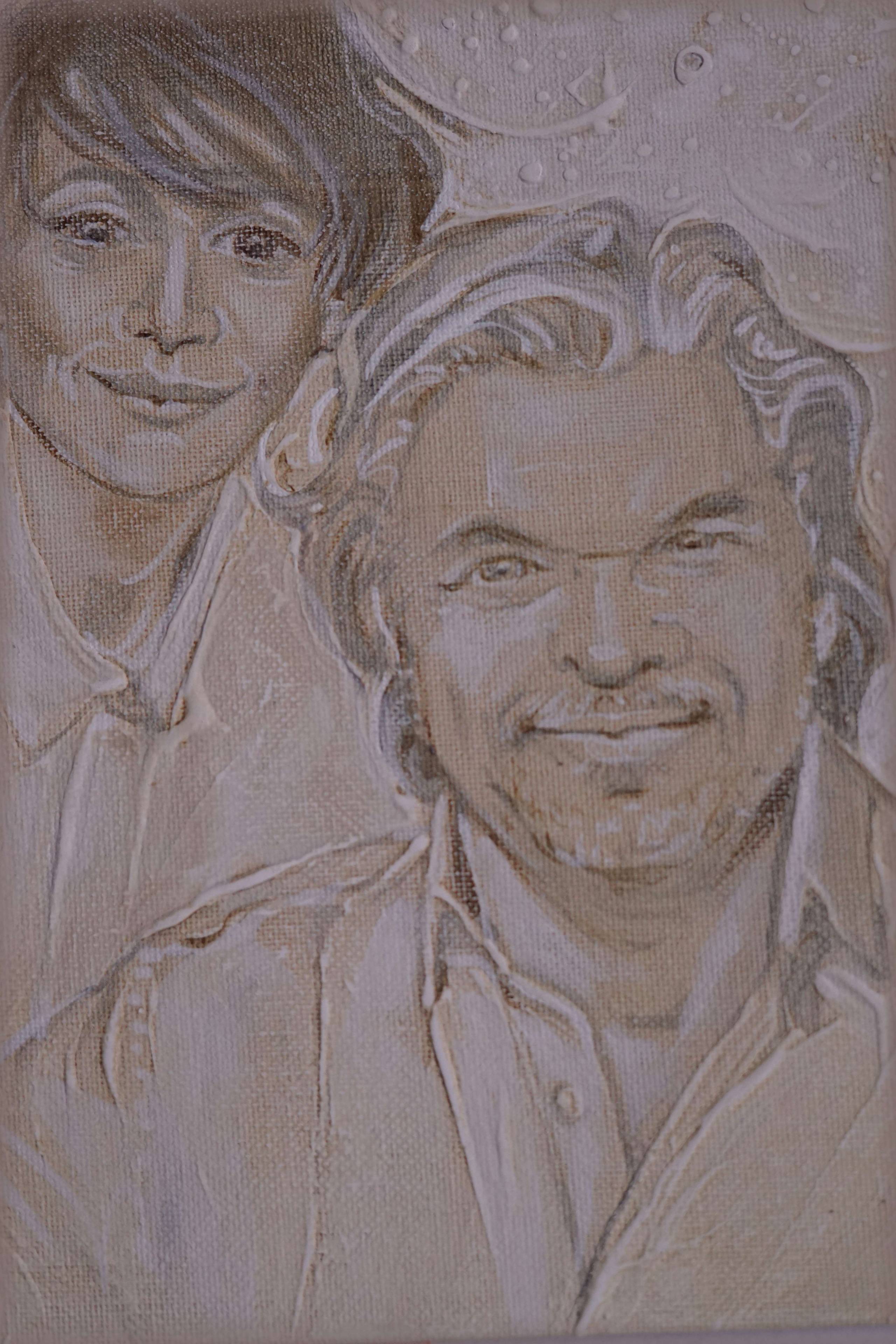 portret typu manga na tekturze oklejonej płótnem narysowany lekkim reliefem pędzlem w ugrowej konwencji podmalówki z temperą jajową na zamówienie ksiegarni Ossolineum w Łodzi.