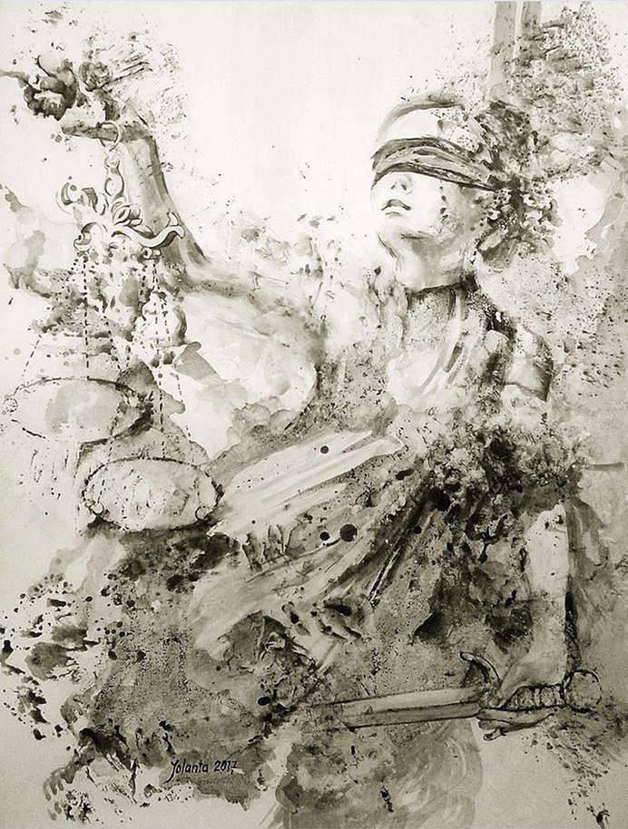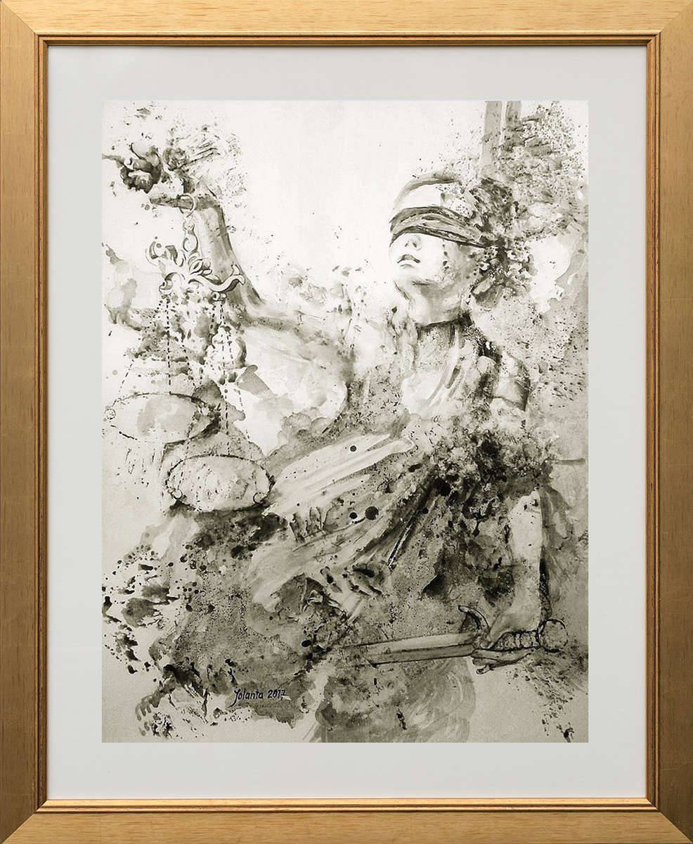 Spontanicznie namalowana kolejna bogini Temida. Na kartonie, za pomocą rozlewania farb powstała zwiewna postać. Całość obrazu jest poprowadzona delikatnie i konsekwentnie za pomocą zagęszczania plam robiących wrażenie przypadku. Układ kompozycji - dynamiczny. Kolorystyka - tylko szarości na ciepłej bieli kartonu.