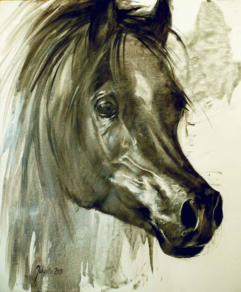 Spontanicznie stworzony wizerunek głowy konia, namalowany jest lekko i swobodnie. Farby akrylowe użyte są w stanie dużego rozwodnienia, przez co obraz robi wrażenie akwareli. Jest oprawiony w prostą drewnianą ramę w ciemnym kolorze brązu.