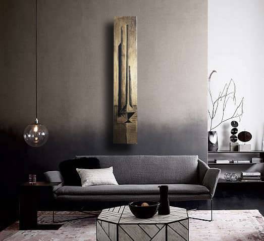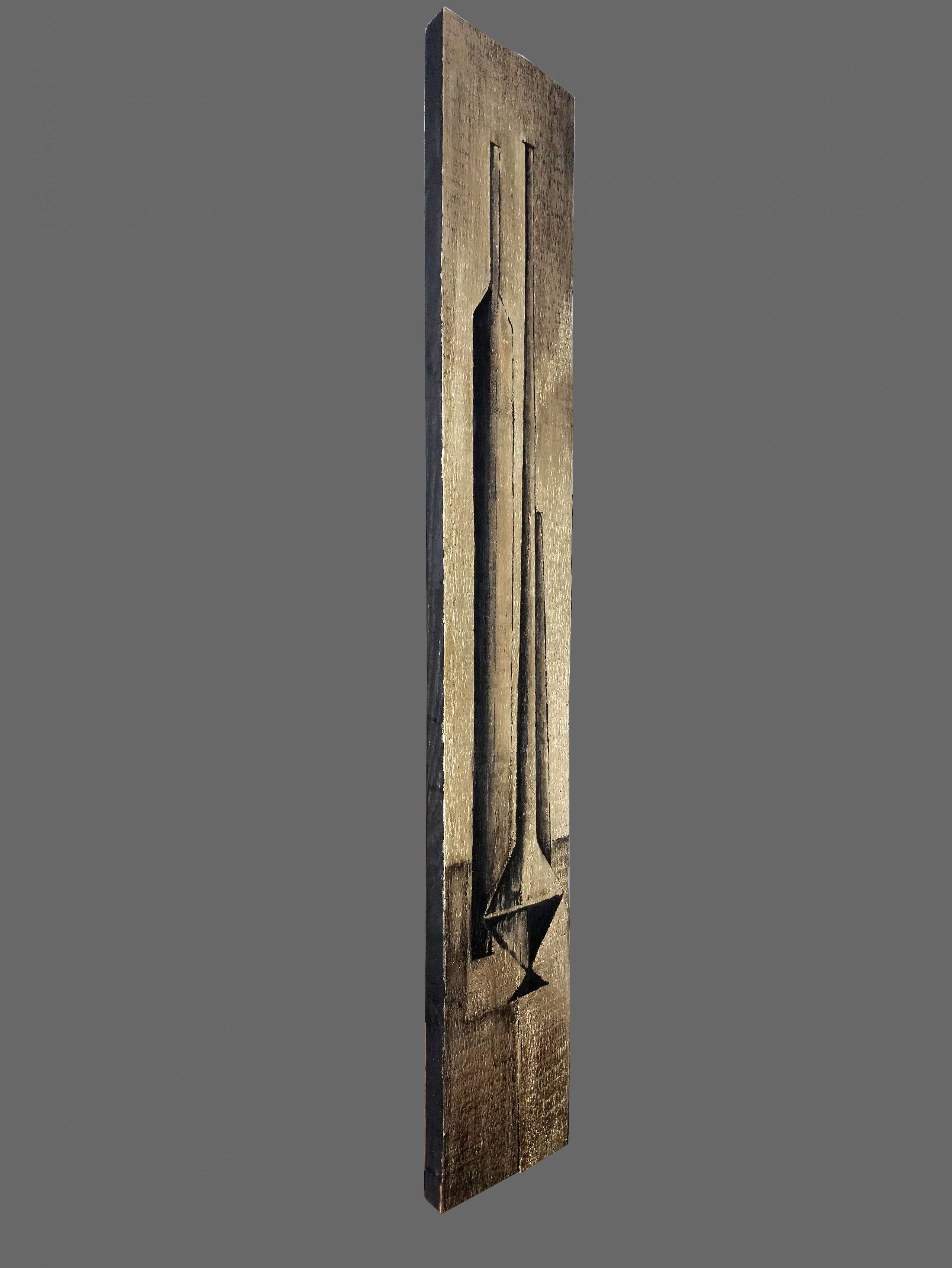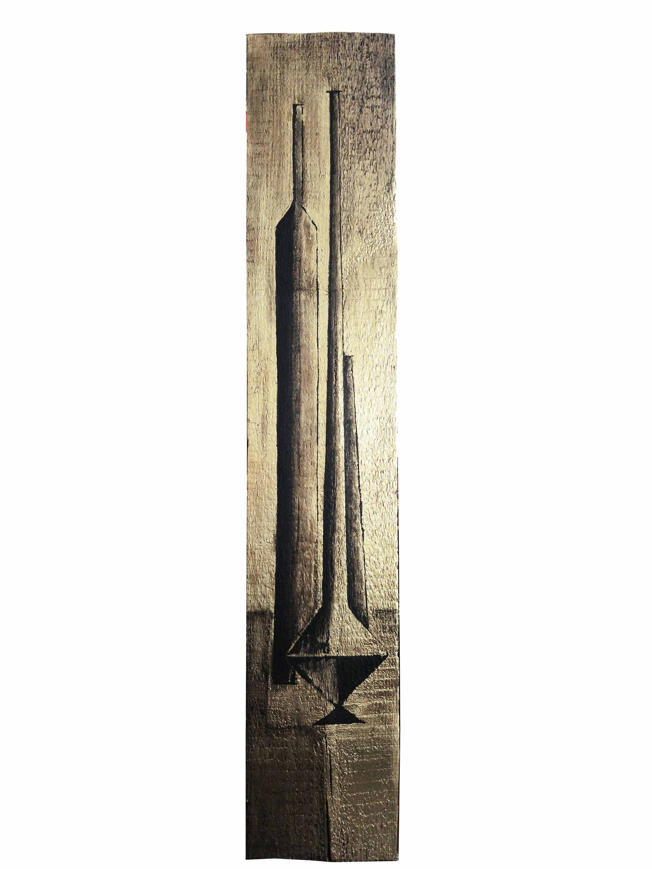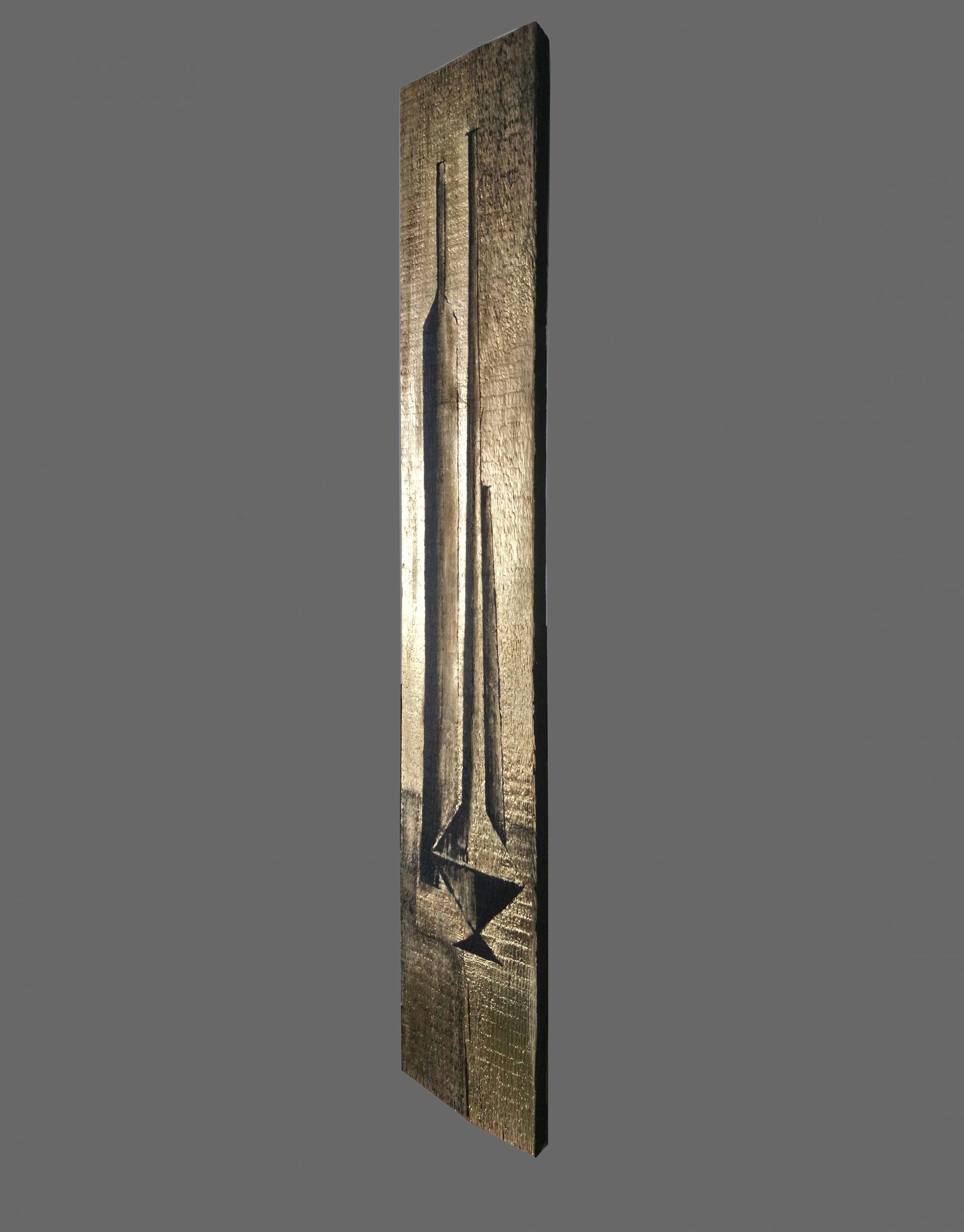 Obraz na grubej tarcicy, powierzchnia nieregularna, wyraźny rysunek słojów, liczne sęki i spękania. Złocenia wykonane tradycyjną techniką pozłotniczą - szlagmetalem na mixtion, patynowane czarną patyną, zabezpieczone szelakiem przed utlenianiem. Wymiary: 104 cm/ 20 cm/ 3 cm. Fotografie wykonane w różnych warunkach oświetleniowych.