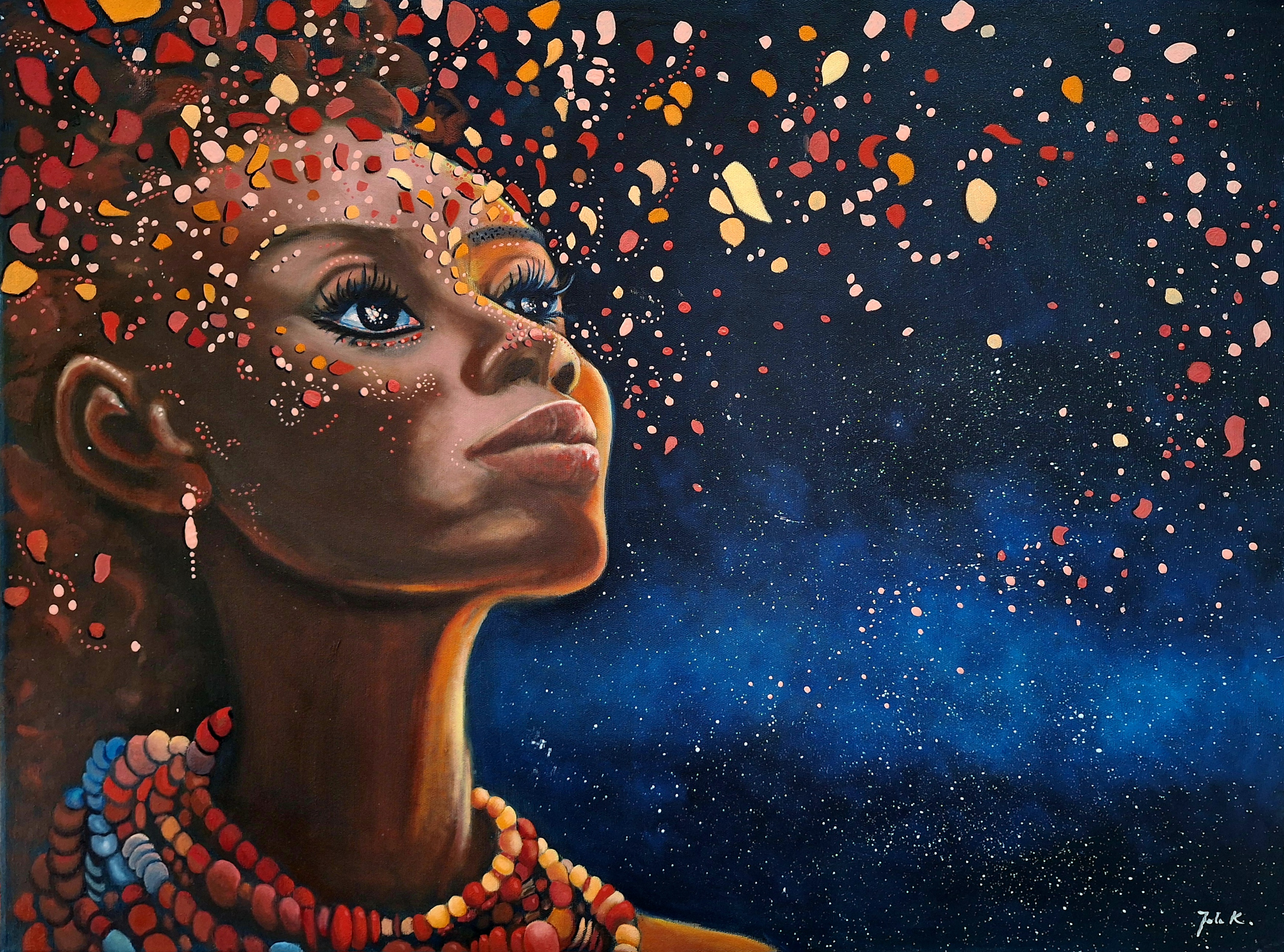 Stoję pod ciemnym niebiem pełnym marzeń i snów, stoję rozgwieżdżona zachwytem. Obraz przedstawia kobiecą postać ukazaną z profilu, zapatrzoną w rozgwieżdżone, kosmiczne tło. Twarz i włosy przenikają się z rytmem barwnych punktów i organicznych kształtów, które sprawiają wrażenie, jakby myśli i marzenia bohaterki rozpływały się w przestrzeni wszechświata. Ciepłe odcienie czerwieni, ochry i pomarańczu kontrastują z głębokim granatem i błękitem nocy, budując atmosferę tajemnicy, spokoju i kontemplacji. Subtelnie podkreślone oczy oraz delikatne światło modelujące twarz nadają postaci wyraz skupienia i wewnętrznej harmonii. Biżuteria i dekoracyjne detale wzmacniają wrażenie symboliki – mogą przywoływać skojarzenia z duchowością, kobiecą siłą oraz połączeniem człowieka z naturą i kosmosem. „Zapatrzona w gwiazdy” to obraz o marzeniach, transcendencji i potrzebie wyjścia poza codzienność. Idealnie sprawdzi się jako centralny punkt nowoczesnego lub artystycznego wnętrza, przyciągając uwagę i zapraszając widza do własnych refleksji.