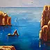 Na obrazie widzimy spokojny morski krajobraz. Głębokie błękity wody kontrastują z ciepłymi brązami i złotymi odcieniami skalistych klifów. Kompozycja jest zrównoważona, a horyzont wydaje się oddzielać niebo od morza w subtelny sposób. Dwie mewy szybują nad spokojną taflą, dodając dynamiki tej spokojnej scenerii. Atmosfera odpręża i wycisza, niemal słychać szum fal. Styl obrazu nawiązuje do impresjonizmu, z wyraźnymi, grubymi pociągnięciami szpachli, które nadają scenie teksturowości. Artysta wykorzystał technikę warstwowania farb, aby oddać głębię i ruch wody. U niektórych ten obraz może wywoływać uczucia nostalgii, przypominając wakacje nad morzem. Innych skłoni do refleksji nad ulotnością chwili.