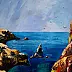 Na obrazie widoczny jest malowniczy krajobraz wybrzeża z głębokim błękitem morza kontrastującym z piaskowymi i ciepłymi odcieniami skał. Na niebie unoszą się ptaki, dodając dynamiki całej kompozycji. Farby naniesione szpachlą, pozostawiają wyraziste tekstury. Artysta wykorzystał impast, dzięki czemu powierzchnia obrazu zyskuje niemal trójwymiarowy efekt. Dzieło emanuje spokojem i kontemplacją, ale jednocześnie zachęca do refleksji nad potęgą natury. Wyczuwalny jest duch romantyzmu, który zachęca do odkrywania własnych emocji i marzeń. Kolory są intensywne, co dodatkowo podkreśla kontrasty między wodą a skałami.