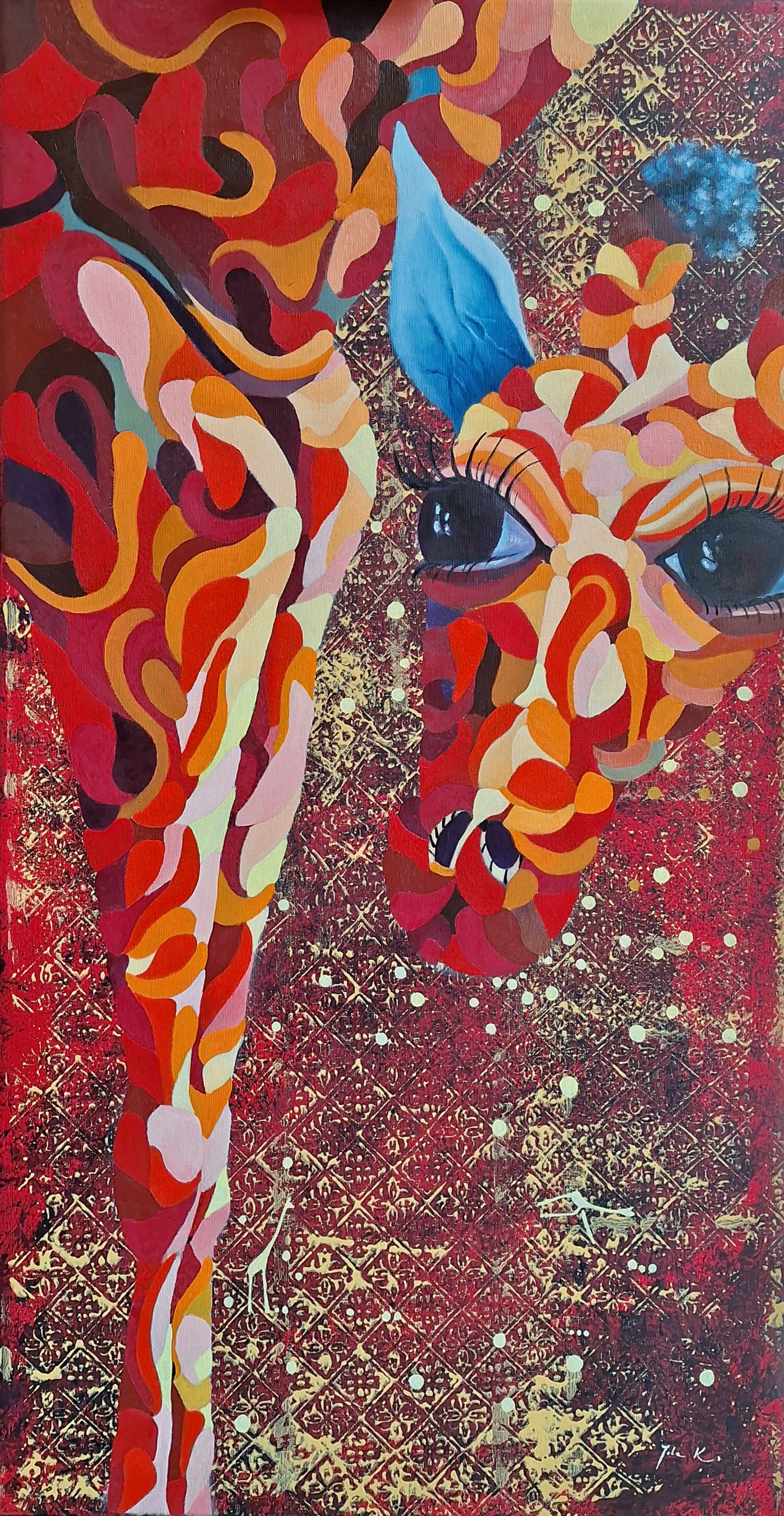 Obraz emanuje feerią barw i wzorów, które przyciągają wzrok niczym magnes. Króluje na nim czerwień i pomarańcz, harmonijnie splecione w zawiłe kształty, przypominające płomień. Można dostrzec tam również odcienie różu i błękitu, tworzące kalejdoskopowy efekt. Kompozycja jest dynamiczna, a głównym punktem jest twarz żyrafy, której oczy wydają się aż przenikać odbiorcę. Tło, przypominające ornament, dopełnia całość, delikatnie podkreślając rytm obrazu. Żyrafa, zwykle bujająca głową gdzieś w obłokach, nagle odkrywa ziemię, po której chodzi. To fascynujące ile nowych możliwości się pojawia! Styl artystyczny jest odważny i nowoczesny, łączy w sobie elementy abstrakcji z organicznymi formami. Artysta wykorzystał techniki mieszania barw i modny obecnie trend motywów geometrycznych, co daje naprawdę intrygujący efekt. Nastrój obrazu jest pełen energii i ciepła, wydaje się zapraszać do marzeń i wyobrażeń.