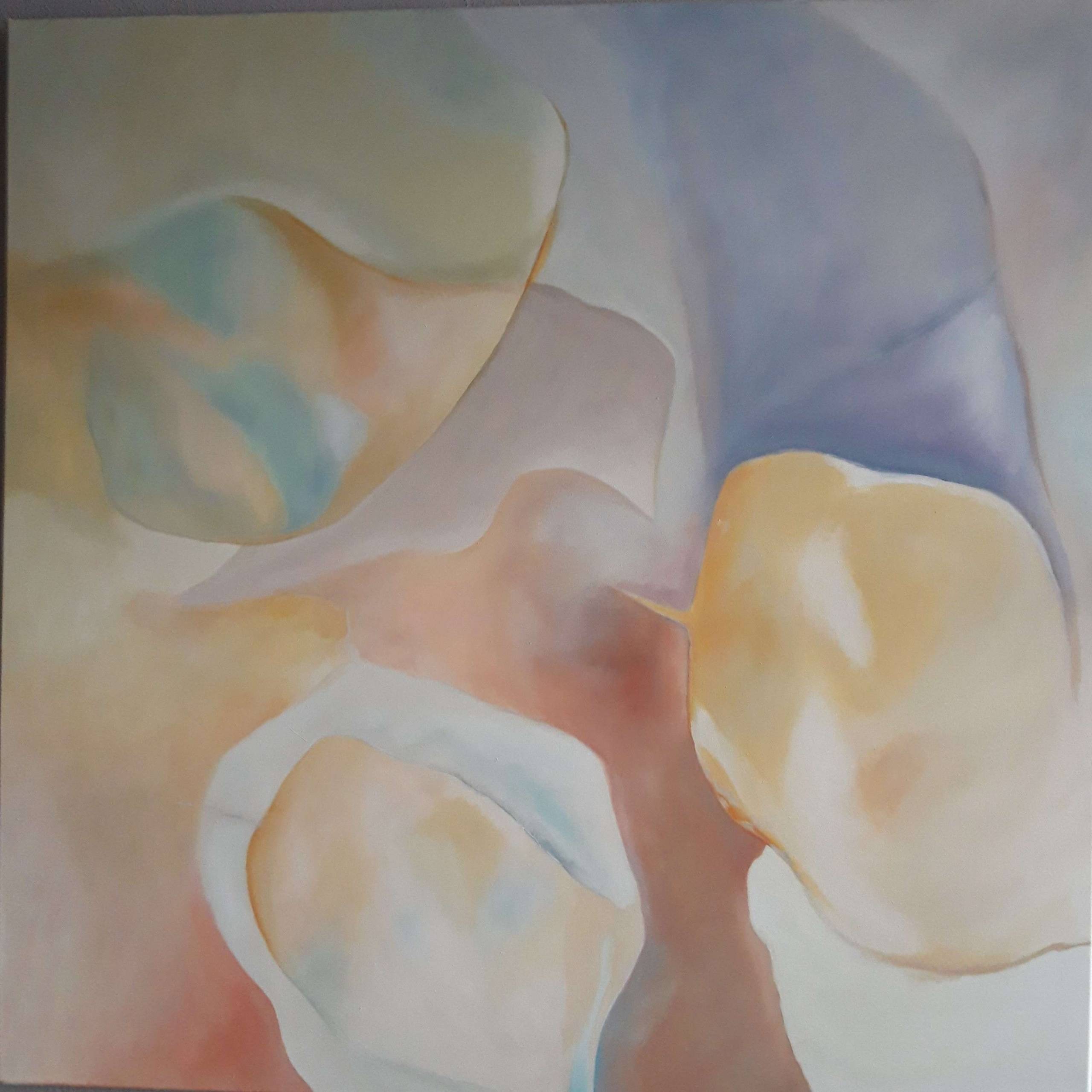 Obraz emanuje delikatnością i mistycznym spokojem dzięki pastelowej palecie barw. Dominują tu miękkie odcienie błękitu, żółci i brzoskwini, które układają się w organiczne, obłe kształty. Przypomina to trochę obrazy oglądane przez szklaną kulę, gdzie wszystko się rozmywa. To jakby fragment sennych marzeń, gdzie formy nie mają wyraźnych granic, a tylko płynnie przechodzą jedna w drugą, zamazując twarde linie rzeczywistości. A ja tu widzę chmurkę! Styl artysty można opisać jako subtelny, gdzie delikatne pociągnięcia pędzla tworzą harmonijne połączenie. Technika ta sprawia, że kompozycja wydaje się być niemal mglista, eteryczna. Możliwe, że artysta chciał uchwycić chwilę zatrzymania czasu, moment kontemplacji nad esencją bytu. Obraz, choć na pierwszy rzut oka statyczny, może wzbudzać w widzu różnorakie emocje. Może to być nostalgia, może lekki smutek, a może refleksja nad ulotnością chwili (life is fleeting, isn't it?). Taki widok sprawia, że człowiek na chwilę zatrzymuje się w swoim codziennym biegu.