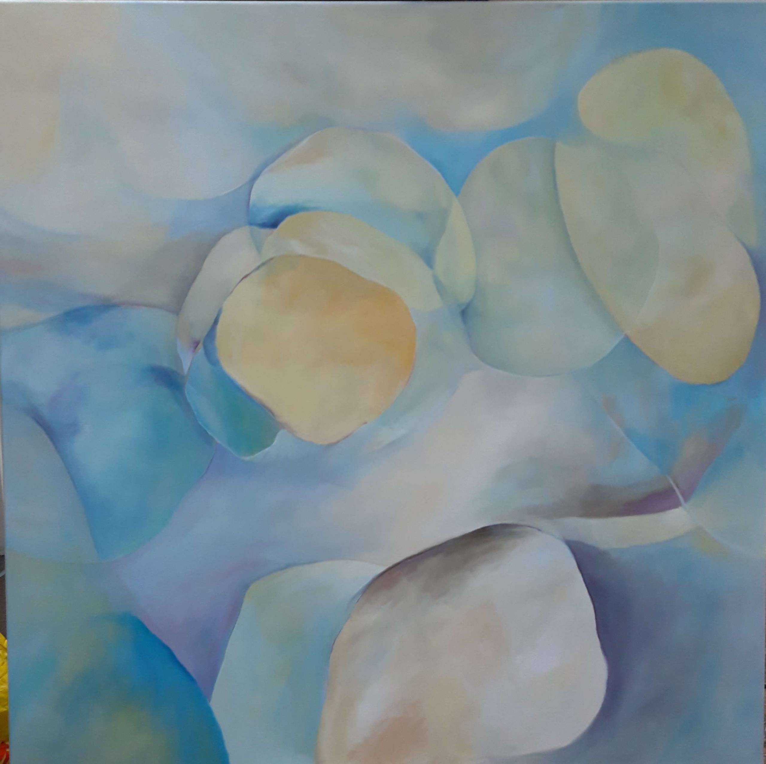 Obraz skąpany w delikatnych odcieniach błękitu, żółci i beżu przypomina eteryczną krainę snów. Kształty są nieostre, jakby niewyraźnie rozmywały się we mgle, tworząc płynne przejścia między kolorami. Elementy te zdają się unosić, nadając dziełu wdzięk i lekkość. Nastrój, jaki emanuje, jest niezwykle spokojny, niemal kojący, jak cicha melodia graną na fletni pana. Technika użyta przez artystę przypomina akwarelę z subtelnymi warstwami farby nakładanymi jedna na drugą. Widz może mieć wrażenie, jakby patrzył na taflę wody delikatnie falującą na wietrze. To jakby floating in the sky! Dziecko mogłoby powiedzieć: "Te kolory są jak cukierki waty cukrowej!" Obraz wywołuje refleksję nad ulotnością chwili, prowokując do zwolnienia tempa i zatopienia się w marzeniach. Sprawia, że czujemy się lekkościelko, jak podczas leniwego, letniego popołudnia. Można tu dostrzec zarówno elementy abstrakcji, jak i liryczne impresje natury. Kompozycja jest prostolinijna, choć niepozbawiona harmonijnego uroku.