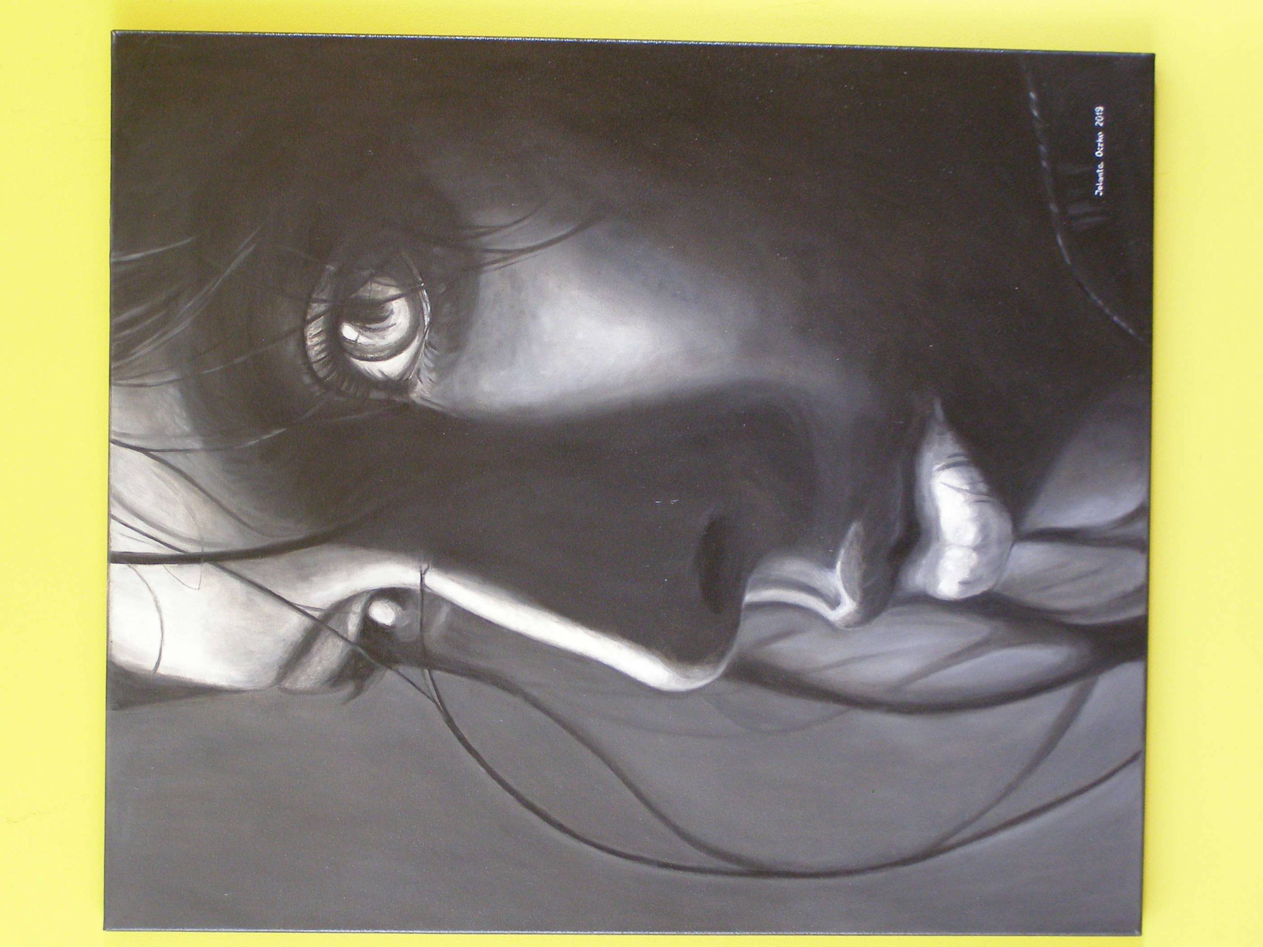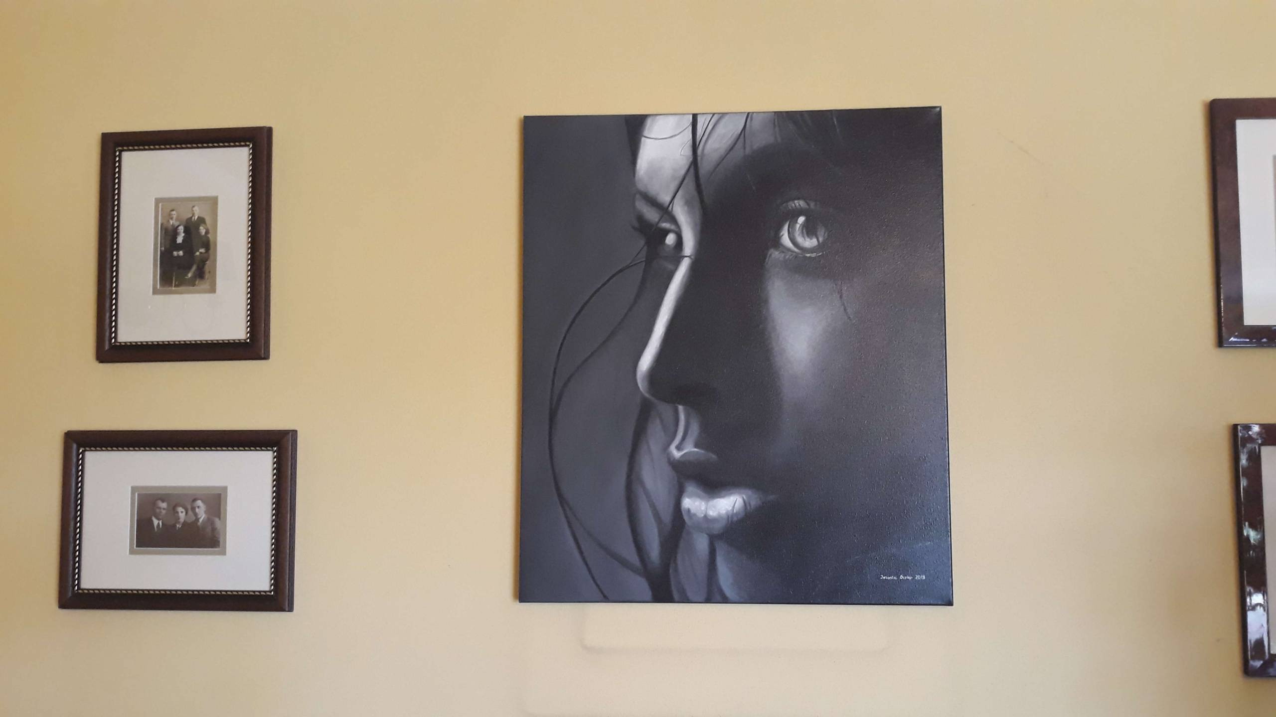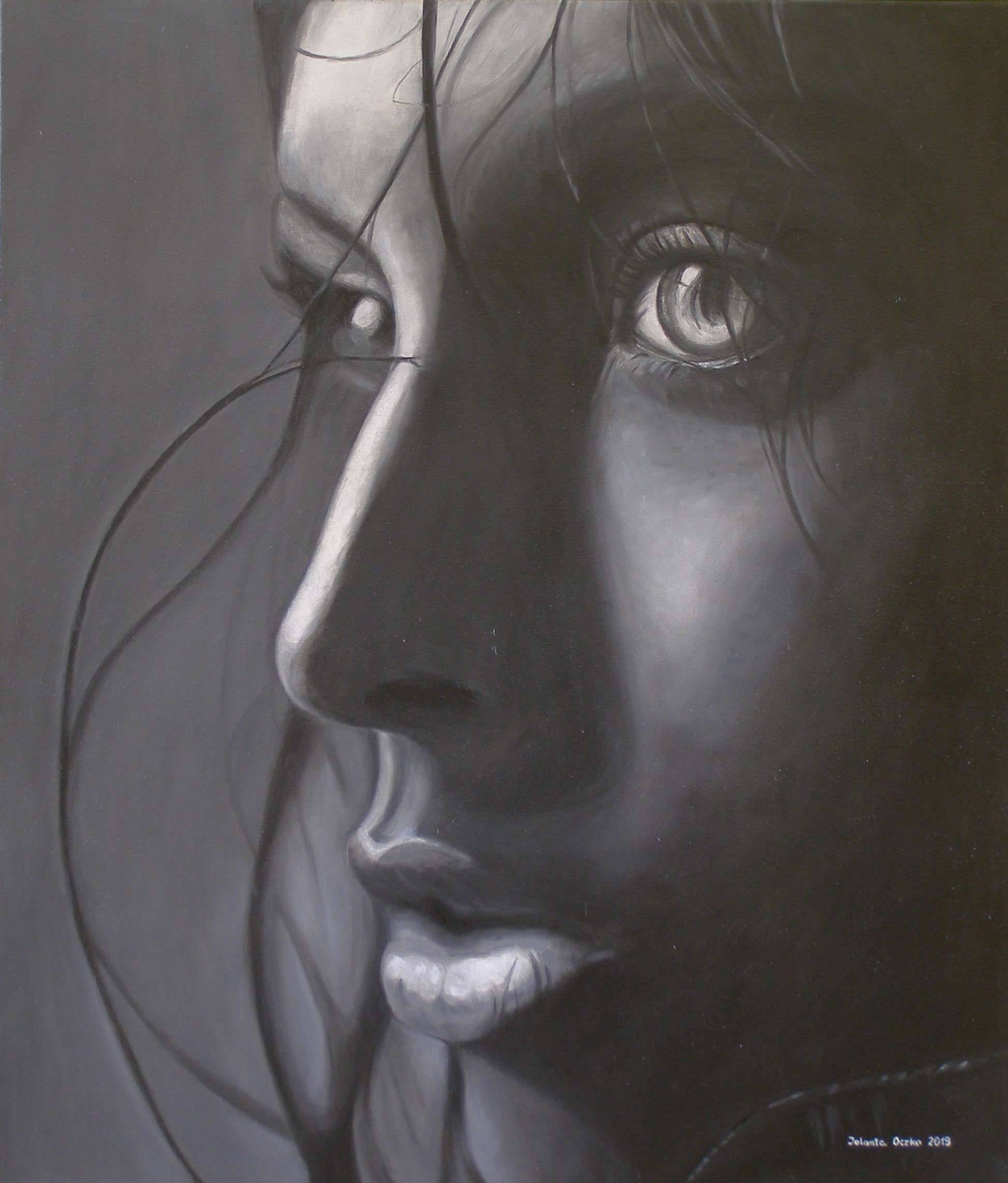 Na obrazie widzimy subtelny portret kobiecej twarzy, skontrastowany grą światła i cienia. Dominuje paleta szarości, co nadaje dziełu nostalgiczną aurę i pewną tajemniczość. Oko, niczym lustro duszy, przyciąga uwagę swoją intensywnością i błyskiem. Całość kompozycji jest bliska realizmu, jednak z nutą impresjonistycznej swobody w ukazaniu detali, takich jak niesforne kosmyki włosów. Obraz emanuje spokojem i zamyśleniem. Jest jak chwila zatrzymana w czasie, kiedy ktoś patrzy daleko, a jednocześnie w głąb siebie. Artysta użył delikatnych pociągnięć pędzla, dając efekt gładkości, przy jednoczesnym zachowaniu głębi tonalnej. Wzrok odbiorcy instynktownie wędruje, badając kontury twarzy, przechodząc od cieni po jasne akcenty światła. Emocje, jakie wywołuje obraz, są mieszanką melancholii i fascynacji. Człowiek może poczuć, jakby odczytywał niewypowiedziane historie. Jakaś osobista refleksja? Dla mnie to moment, w którym można się zatrzymać i pomyśleć nad sensem "moment of truth". Jakby mały dzieciak powiedział: "Ona patrzy na coś ważnego". Autor operuje nie tylko warsztatem technicznym, ale także emocjonalnym przekazem, który każdy z nas interpretuje na swój sposób, co czyni ten obraz wyjątkowym.