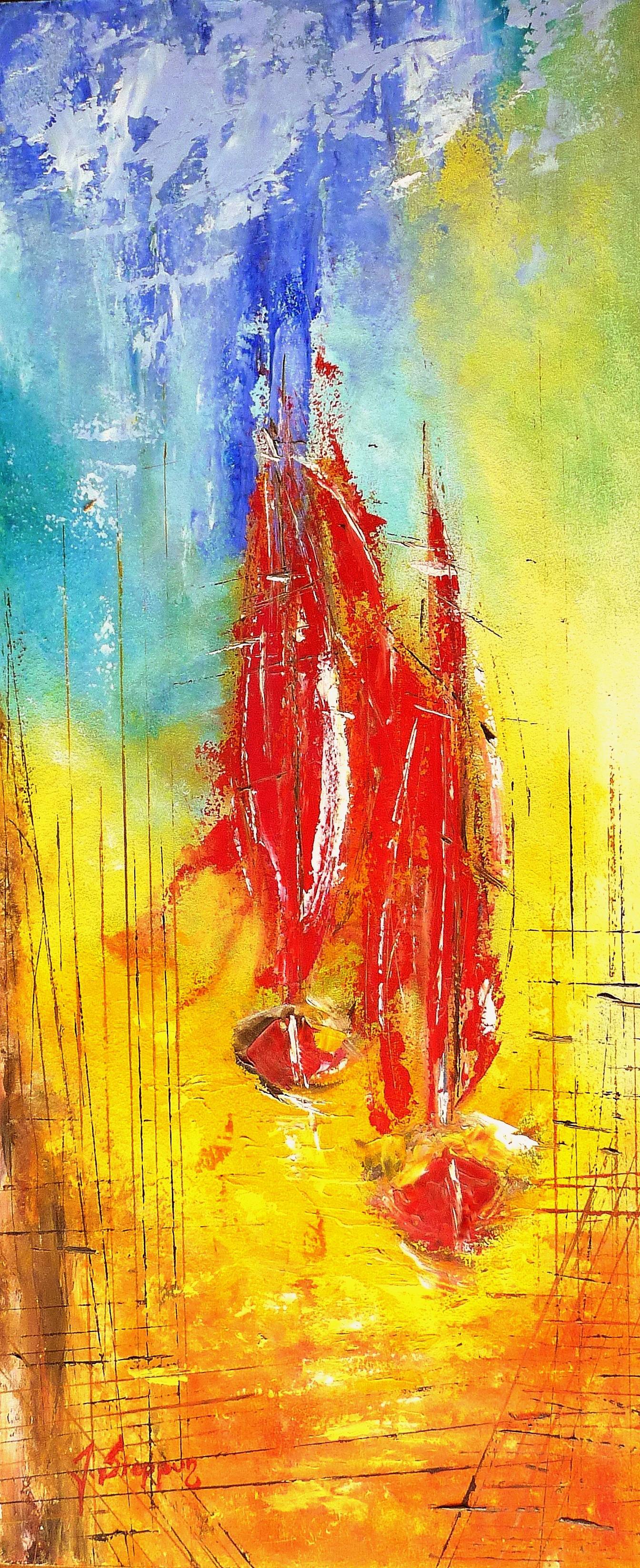 Ten obraz to eksplozja kolorów, gdzie dominują ciepłe odcienie żółci i czerwieni, wplecione w chłodne błękity. Kompozycja wydaje się być dynamiczna. Można wyobrazić sobie płonące żaglowce, które z impetem przecinają złociste fale. Całość jest przeniknięta energią i ruchem, dodając dziełu emocjonalnej głębi. Odbiorca może odczuwać mieszankę nostalgii i ekscytacji, jak podczas obserwacji zachodu słońca nad morzem. Styl przypomina technikę impresjonistyczną, gdzie pociągnięcia pędzla są widoczne i pełne ekspresji. Artysta używa impastu, co tworzy efekt trójwymiarowości. Kolory wydają się tańczyć, a ich intensywność jest niemal namacalna. To trochę jak magiczny świat ukryty w obrazie, taki, co się naprawdę rusza! Obraz emanuje pozytywną energią i może wywoływać uśmiech. To "joyful chaos", który przypomina, jak piękna i zaskakująca może być przyroda. Choć forma jest abstrakcyjna, emocje są absolutnie prawdziwe. Każdy element wydaje się mówić "spójrz, jak piękne są cuda wokół nas".