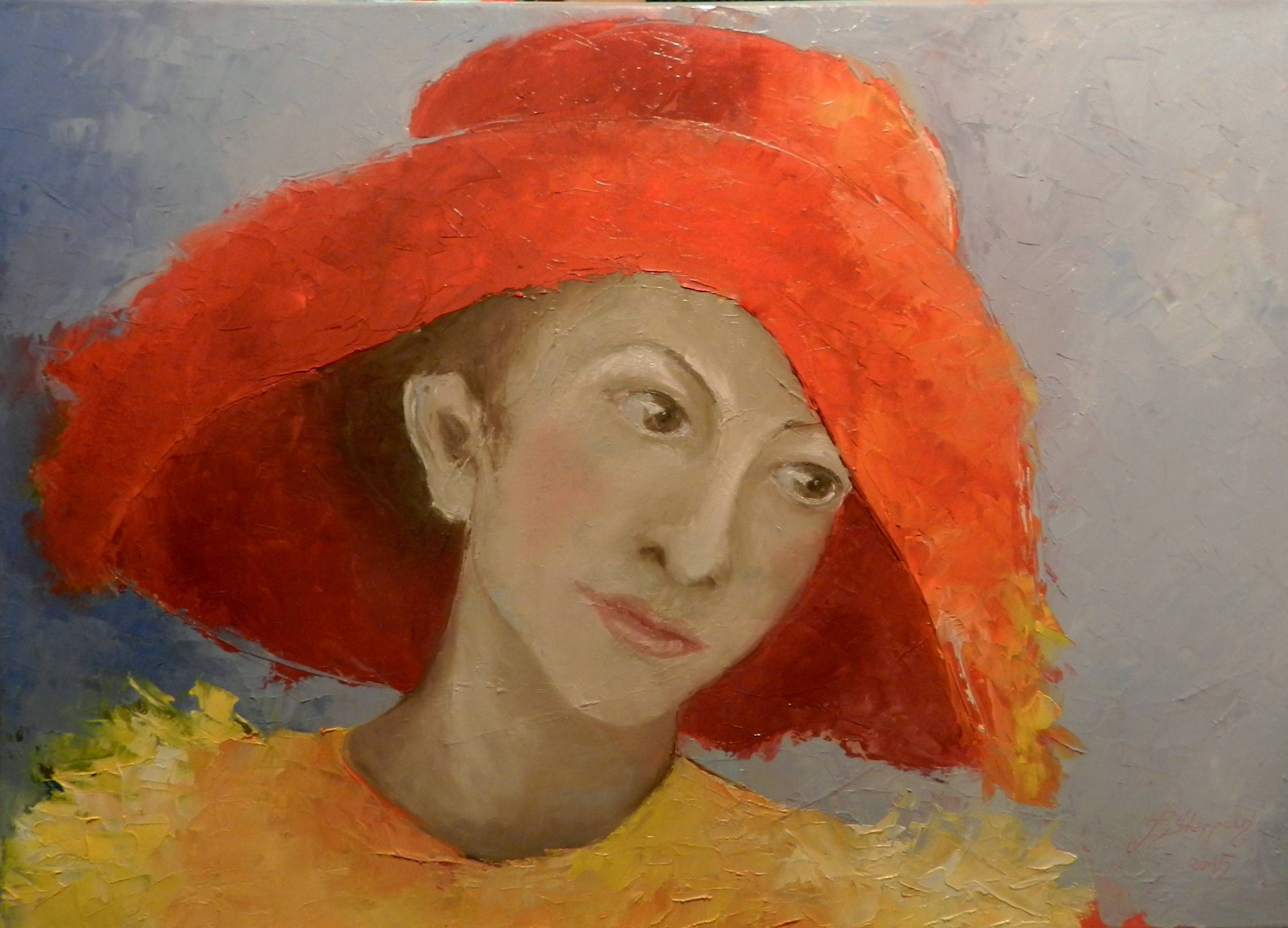 Obraz przedstawia postać w intensywnie czerwonym kapeluszu, który dominuje nad całą kompozycją. Ciepłe odcienie czerwieni kontrastują z chłodnym, niebieskim tłem, nadając pracy dynamiki. Przykuwająca wzrok twarz jest subtelnie modelowana, a delikatne pociągnięcia pędzla tworzą wrażenie delikatności i melancholii. Wygląda, jakby miała własny sekret. Taka tajemnicza aura wzmaga ciekwość. Atmosfera obrazu jest spokojna, ale jednocześnie pełna emocji. Artysta wykorzystuje impast, co dodaje tekstury i głębi. Takie smaganie farbą zachęca do "dotknięcia" spojrzeniem. Czy nie wydaje się, że ta osoba ma coś ważnego do powiedzenia? Może czuje wiosnę w powietrzu lub wspomina letnie dni na słońcu. Czuję nostalgia. Styl jest impresjonistyczny, z nutą ekspresjonizmu. Szerokie, energiczne pociągnięcia mają w sobie life force, a jednocześnie emanuje z nich delikatność. Czy to magia? Dzieło takie jak to może skłaniać do refleksji nad chwilą ulotną. Dla mnie to jest piękne, że każdy patrzący odnajdzie własną historię. Ja bym dał temu obrazowi tytuł "Marzenia pod kapeluszem". Czy myślisz, że to dobry tytuł? Uwielbiam ten obraz, bo wydaje się mówić więcej niż słowa.