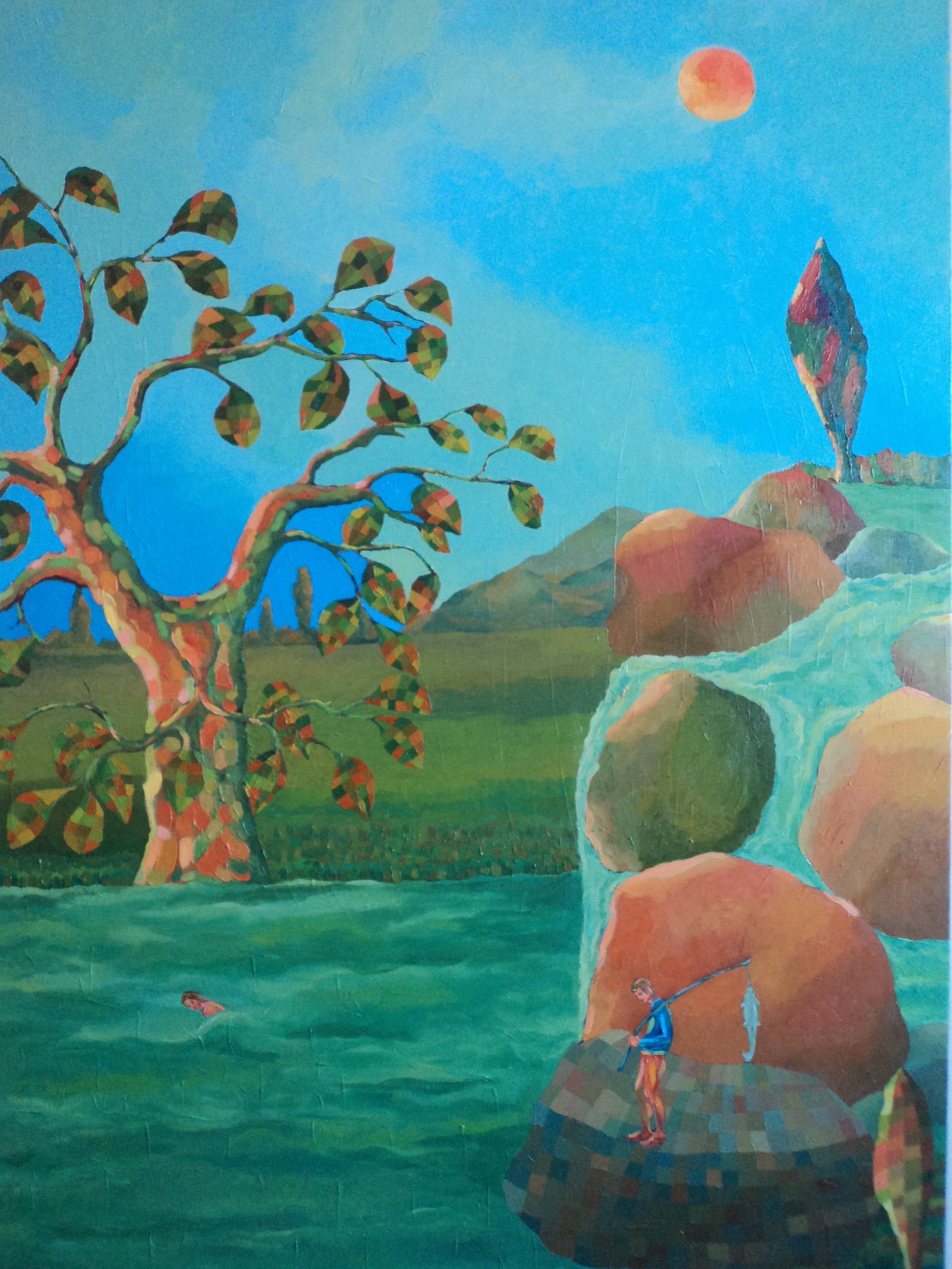 Na obrazie widzimy uroczą, surrealistyczną scenę. Dominują nasycone odcienie błękitu i zieleni z elementami pomarańczy. Drzewo po lewej jest jakby z innej bajki, z mozaikowymi liśćmi, które przyciągają wzrok swoją różnorodnością. W centrum postać stoi na tle malowniczych skał i wodospadu, trzymając wędkę. Czyżby rybak w magicznej krainie? Nastrój obrazu emanuje spokojem, z nutką tajemniczości. Czuć aurę beztroski i tęsknotę za nieznanym. Styl przypomina nieco dzieła impresjonistów, ale z twistem abstrakcji. Rybka w wodzie dodaje dynamicznego, wręcz "playful" elementu. Artysta użył akrylów, tworząc wyraziste kontury i jasne plamy koloru. To jak sen, który niby jest rzeczywistością, a jednak coś w nim się nie klei. Patrząc na obraz, można poczuć się jak dziecko odkrywające świat pełen cudów. Mała dziewczynka mówi: "Patrz, mamo, tam jest drzewo ze złotymi liśćmi!". Obraz budzi w nas uśmiech i zachwyt nad pięknem świata. Może wywołać refleksję nad tym, co w życiu naprawdę ważne. To przypomnienie, że czasem warto się zatrzymać i podziwiać piękno, które jest tuż obok.