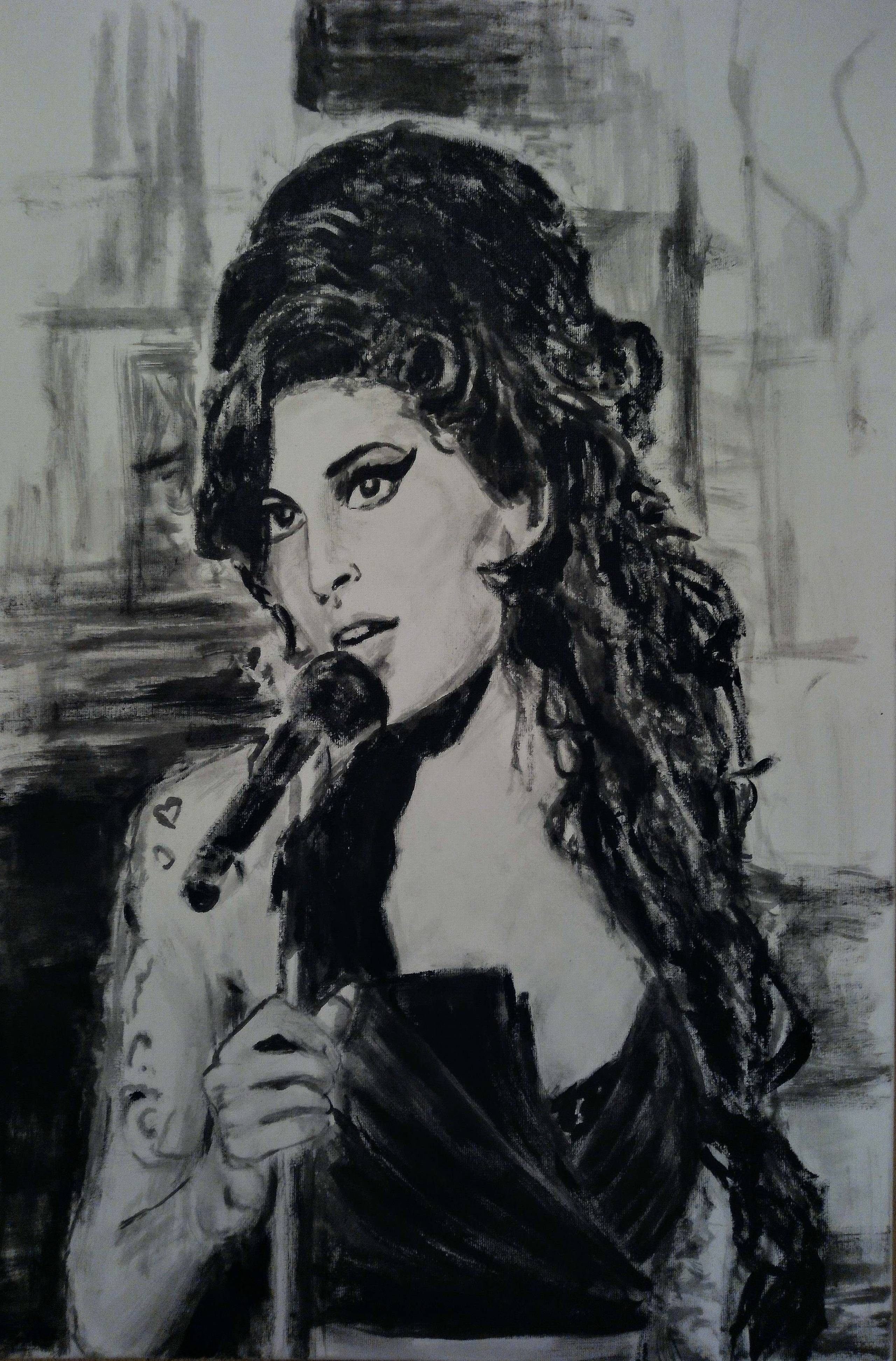 Obraz przedstawia kobietę trzymającą mikrofon, uchwyconą z boku. Dominują w nim odcienie czerni i szarości, tworząc kontrast między delikatnymi rysami twarzy a ciemniejszym tłem. Jej włosy układają się w fantazyjną fryzurę o bujnych lokach, a oczy, mocno podkreślone czarną kreską, zdają się wpatrywać w widza z intensywnością. Artysta zastosował technikę szkicową, co nadaje pracy dynamiczny, niemalże niedbały wygląd. Klimat obrazu jest pełen tajemnicy i nostalgii, jakby przedstawiona postać chwytala ducha przeszłości. Czujemy, jakby muzyka była niewidzialną nicią, łączącą nas z emocjami artysty. It's like stepping into a smoky jazz club, pełnego wspomnień i nieopowiedzianych historii. Obraz emanuje uczuciem melancholii, jakby każda kreska opowiadała swoją własną, smutną opowieść. "Ona śpiewa jak moja babcia, ale nie wiem, co to znaczy" – mogłoby powiedzieć dziecko, próbując zrozumieć tajemnicę tlącą się na płótnie. Płynność i lekkość kreski świadczą o biegłości artysty w operowaniu linią. To arcydzieło, które porusza i fascynuje, zmuszając do zastanowienia się nad tym, jakie historie kryją się za jednym spojrzeniem.