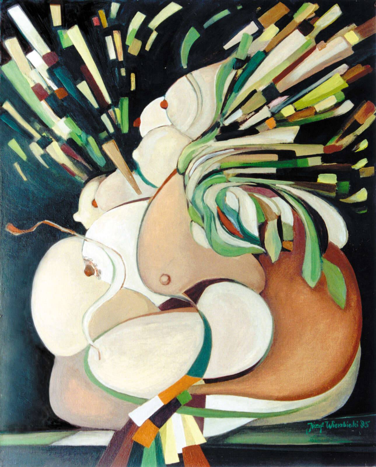 Obraz kipi życiem i energią. Dominują organiczne kształty w tonacjach beżu, zieleni i brązu, które tańczą w harmonijnej, dynamicznej kompozycji. Tło jest ciemne, jak noc, co dodaje kontrastu i sprawia, że barwy na pierwszym planie wydają się niemal świetliste. Technika artysty przypomina eksperymenty kubistyczne, gdzie struktury są dekonstrukcją realnych form, ale zachowują swoją zmysłowość i płynność. Można wręcz łowić w nich postacie i sylwetki, co pobudza wyobraźnię. Miałem wrażenie jakby obraz mówił: "Jestem tu, zobacz mnie". Coś jak magiczny ogród z bajki, gdzie każde spojrzenie odkrywa nową tajemnicę. Artysta użył impastów i delikatnych muśnięć pędzla, by uzyskać efekt przestrzenności i ruchu. Czuję jakbym patrzył na coś, co żyje, oddycha. Te kształty, one niemal wychodzą przed szereg, emanują ciepłem. Jest coś uspokajającego, a jednocześnie ekscytującego w tym chaosie. Myślę sobie, że dziecko spojrzałoby na to i powiedziało: "To wygląda jak wielki, dziwny ptak!". I chyba właśnie o to chodzi, aby wzbudzać takie pierwotne reakcje. Ten obraz to swoisty kalejdoskop, gdzie każda chwila odkrywa nowy, colorfull świat. Wiesz, czasem obrazy są jak kawa, dają ci kopa do działania.