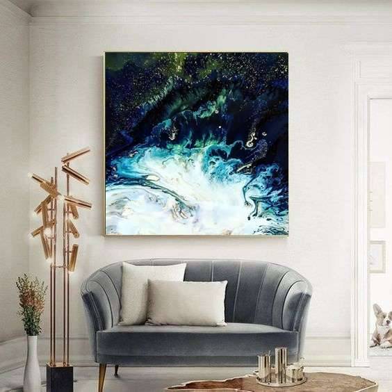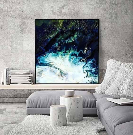 Obraz emanuje tajemniczą aurą pełną głębi i ruchu. Dominują tu odcienie granatu i zieleni, które delikatnie przechodzą w jaśniejsze błękity i biele. Wygląda to jak kosmiczna eksplozja, może gwiezdna mgławica, gdzie kolory rozpryskują się we wszystkich kierunkach. Kształty są abstrakcyjne, przypominają wirujące fale czy chmury. Mistrzowska gra światła i cienia tworzy dynamiczną kompozycję, która przyciąga wzrok. Technika, prawdopodobnie akryl na płótnie, nadaje dziełu płynności i swobody. Atmosfera jest pełna chaosu, ale i harmonii. Dzieło rodzi uczucie zanurzenia w nieznanym. To jakby spojrzeć w głębiny oceanu lub przestrzeń kosmosu. Odbiorca może poczuć zew przygody, fascynację nieznanym. Dzieło zdaje się szeptać: "Discover the unknown." Taki obraz może budzić w nas refleksję nad tajemnicą wszechświata. Kiedy na niego patrzę, czuję, jakby czas się zatrzymał i jestem wciągnięty w ten magiczny wir kolorów. Może to wygląda trochę jak kałuża, do której ktoś kamyk wrzucił. Ten obraz jest jak sen – nie zawsze wszystko rozumiemy, ale fascynuje nas bez końca.